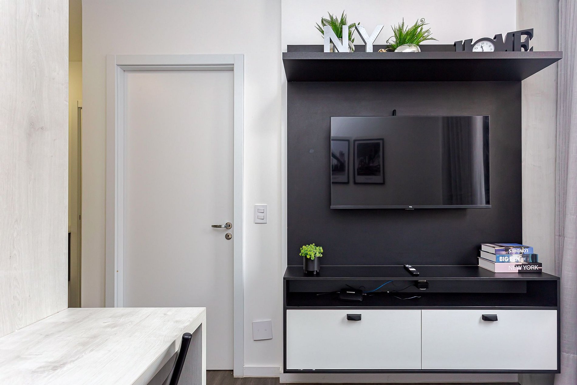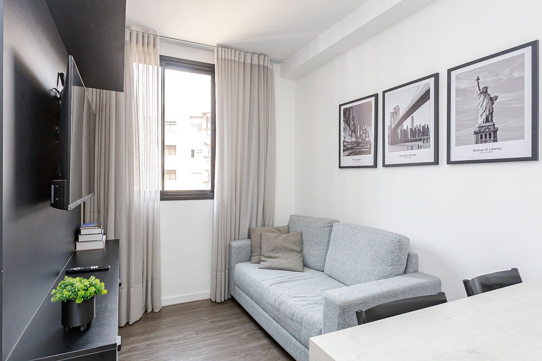 • Sala: ambiente com sofá, TV Smart, mesa para 2 pessoas e cortina blackout.