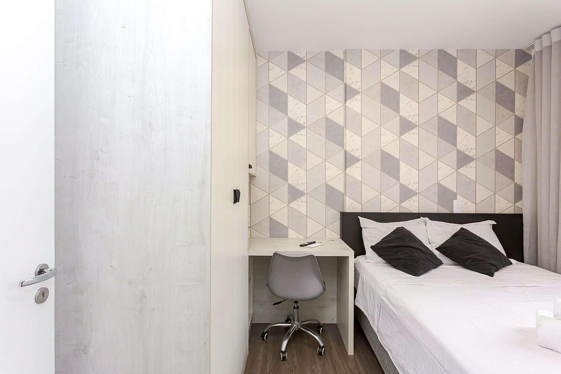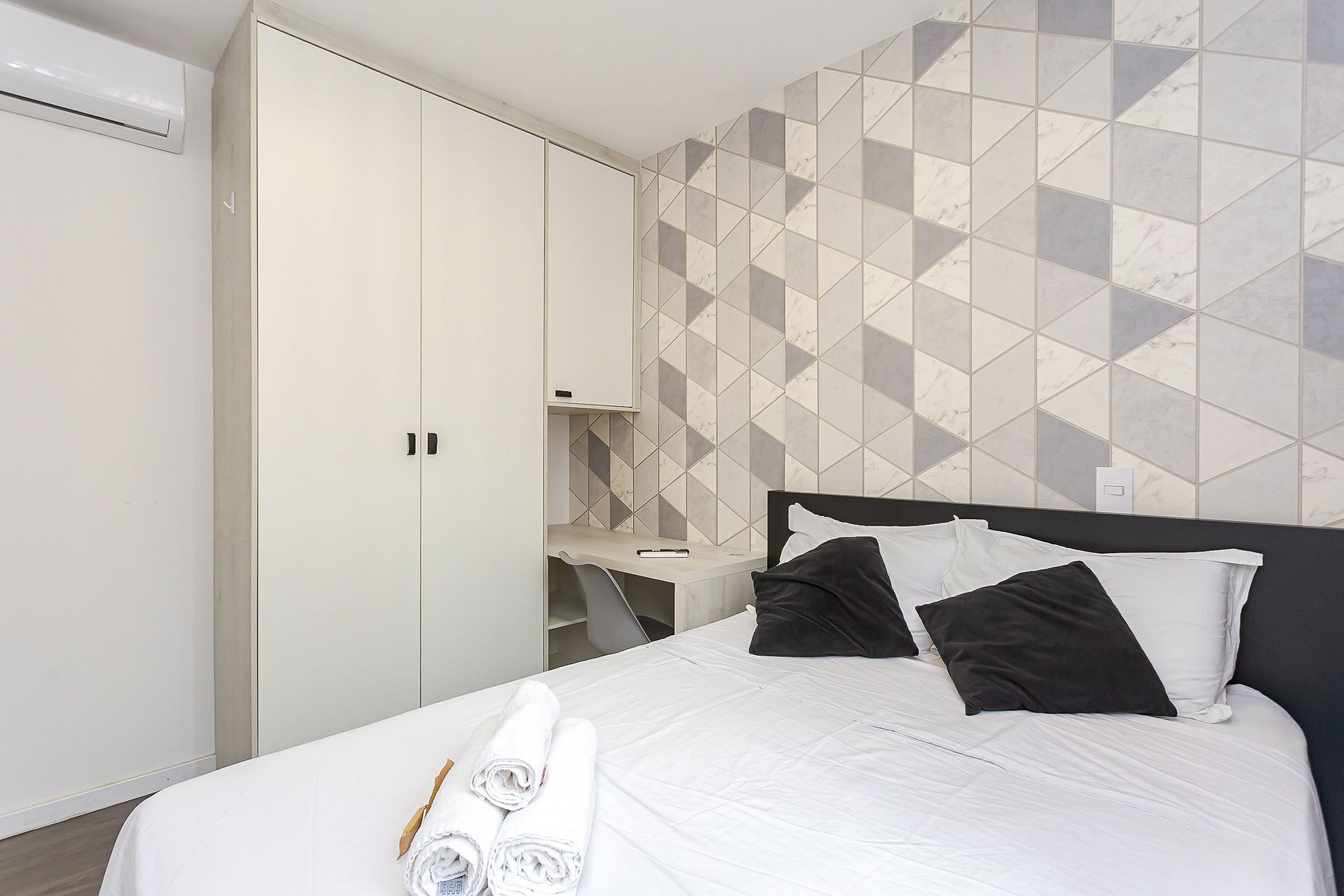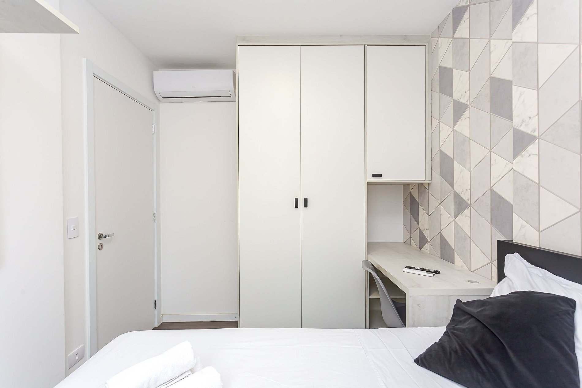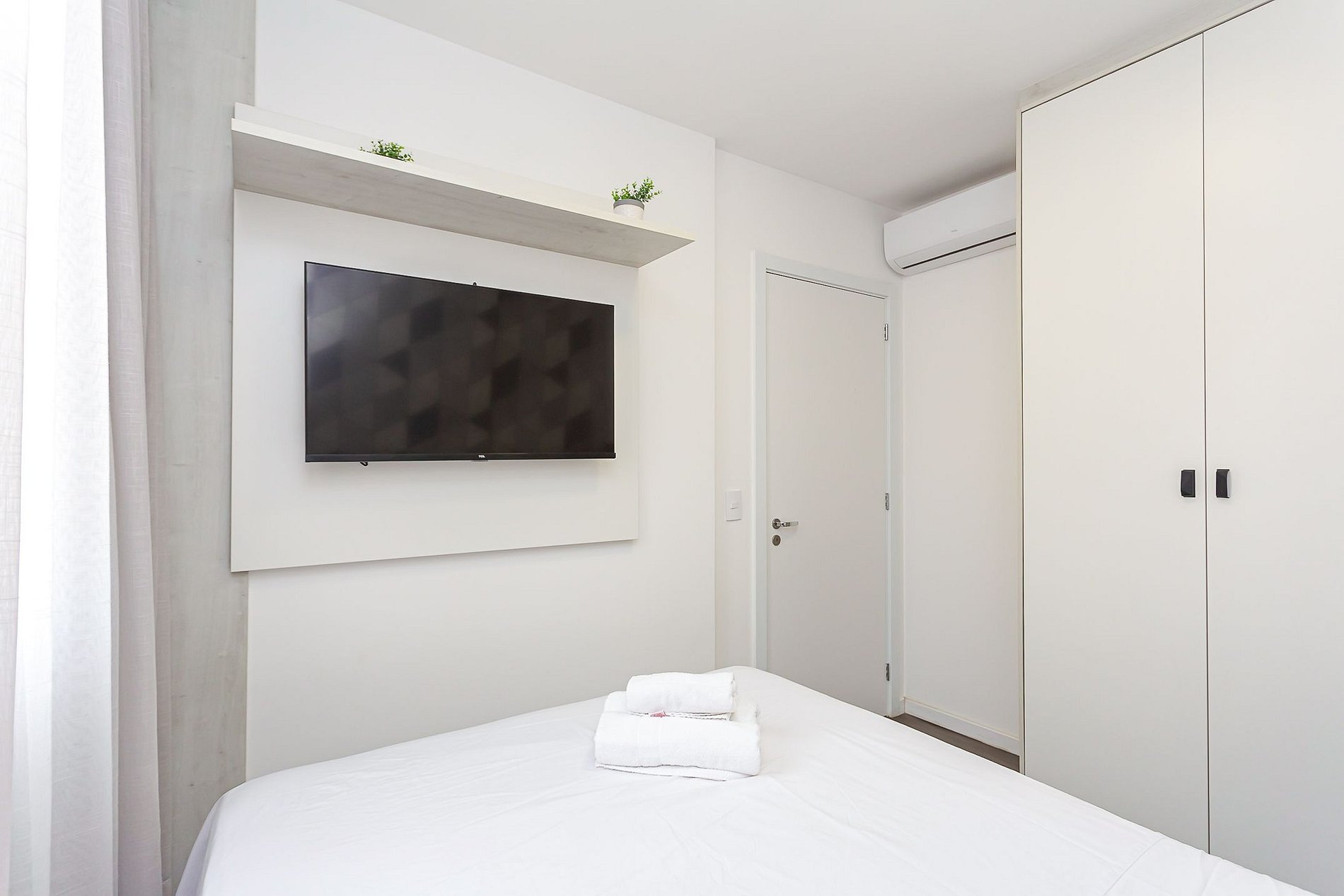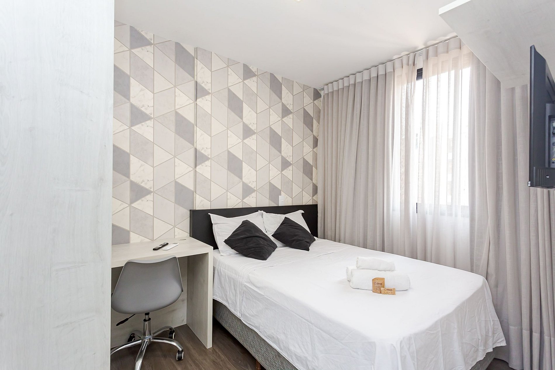• Quarto: cama de casal com cabeceira, ar-condicionado split, TV Smart, escrivaninha e cadeira de escritório, armário com cabides e cortina blackout.