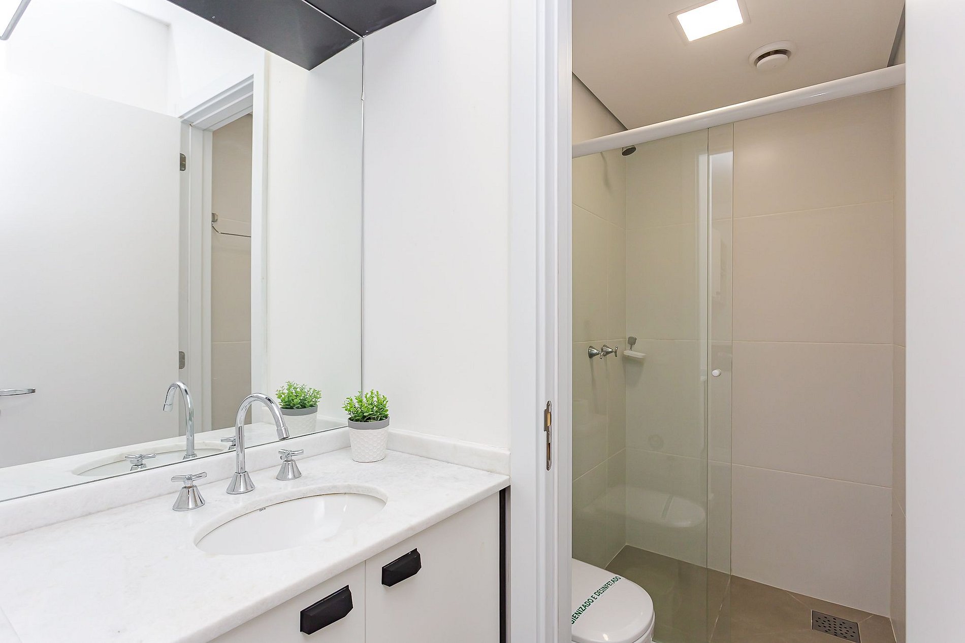 • Banheiro: box de vidro, vaso sanitário e chuveiro com água quente, com pia/cuba em área prática para uso diário.