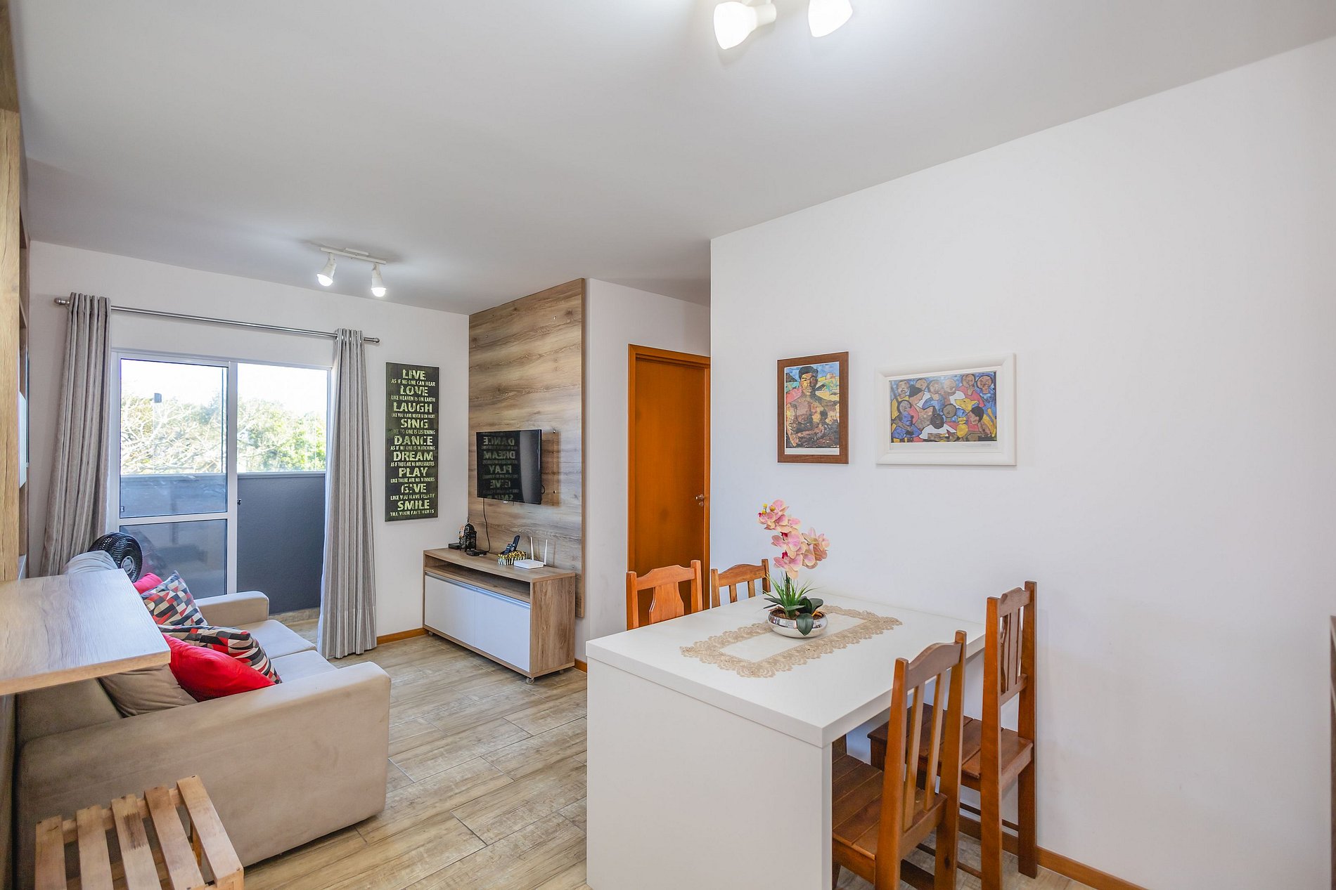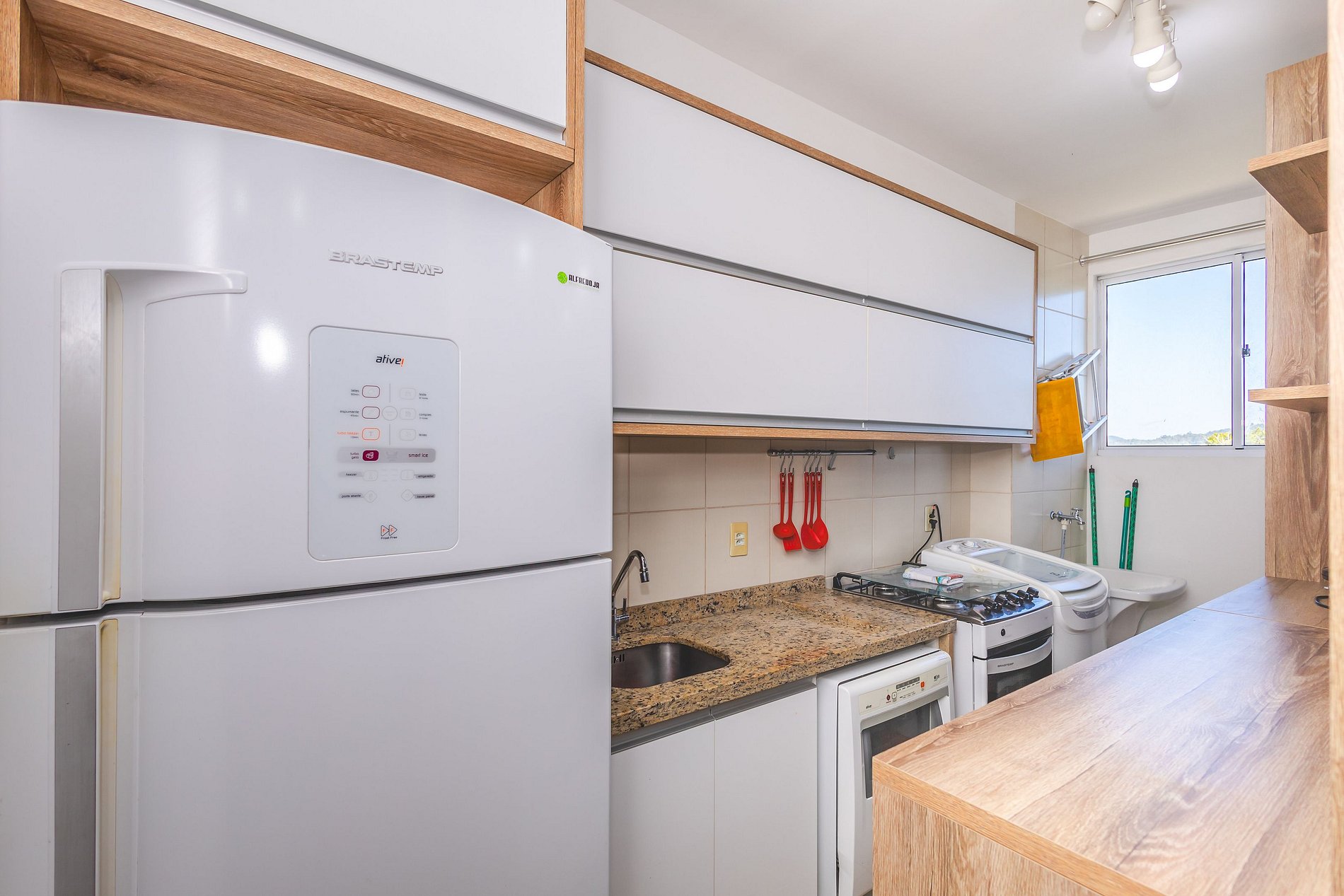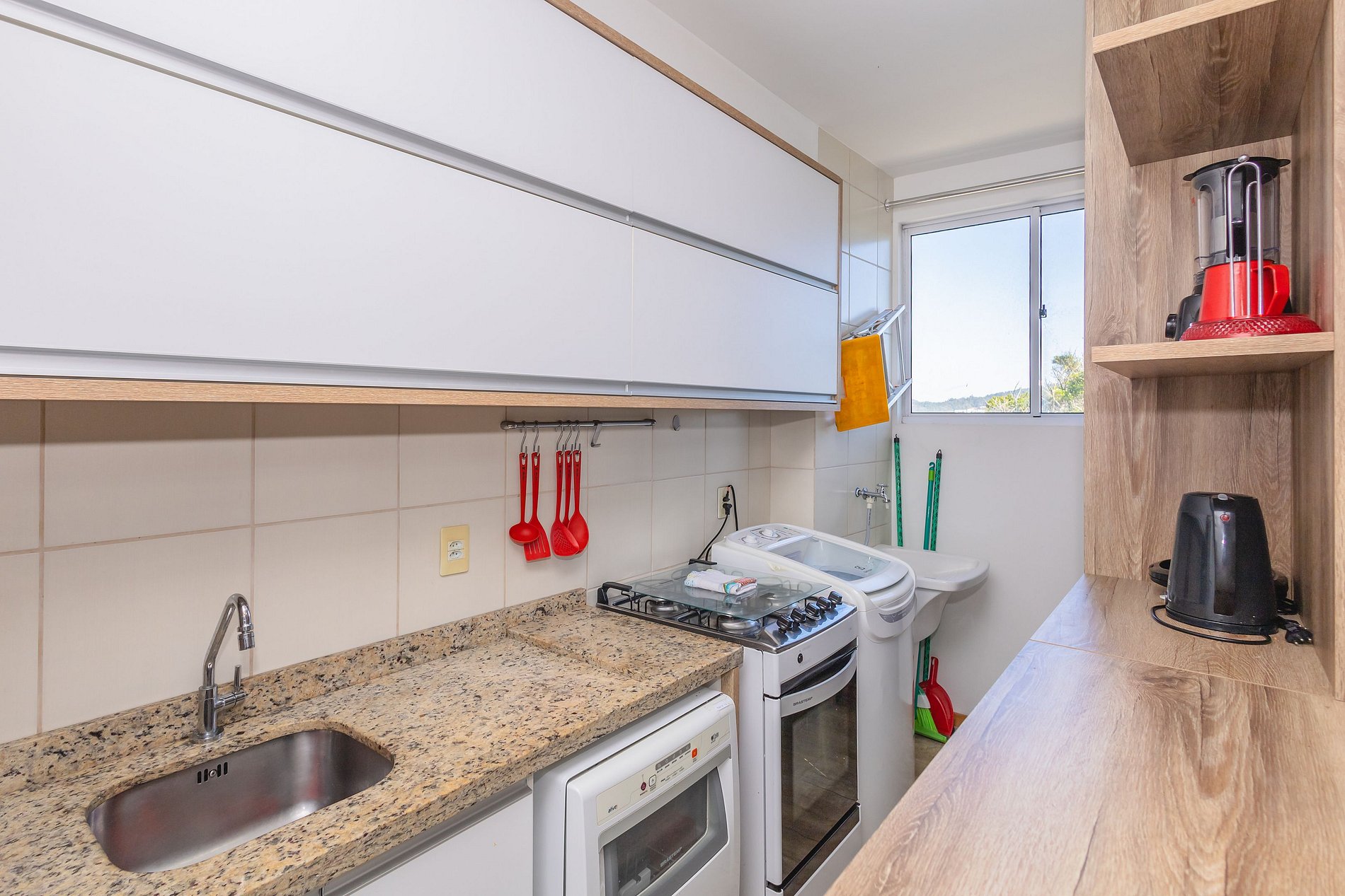 O apartamento possui 2 quartos, sala integrada à cozinha e sacada fechada em vidro, oferecendo conforto e funcionalidade para toda a família.