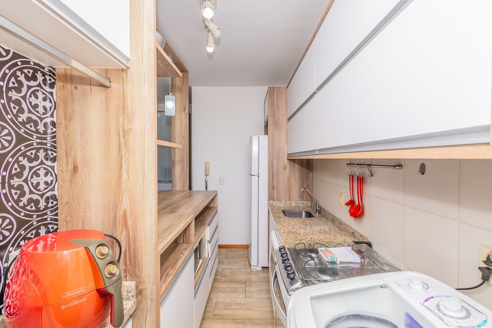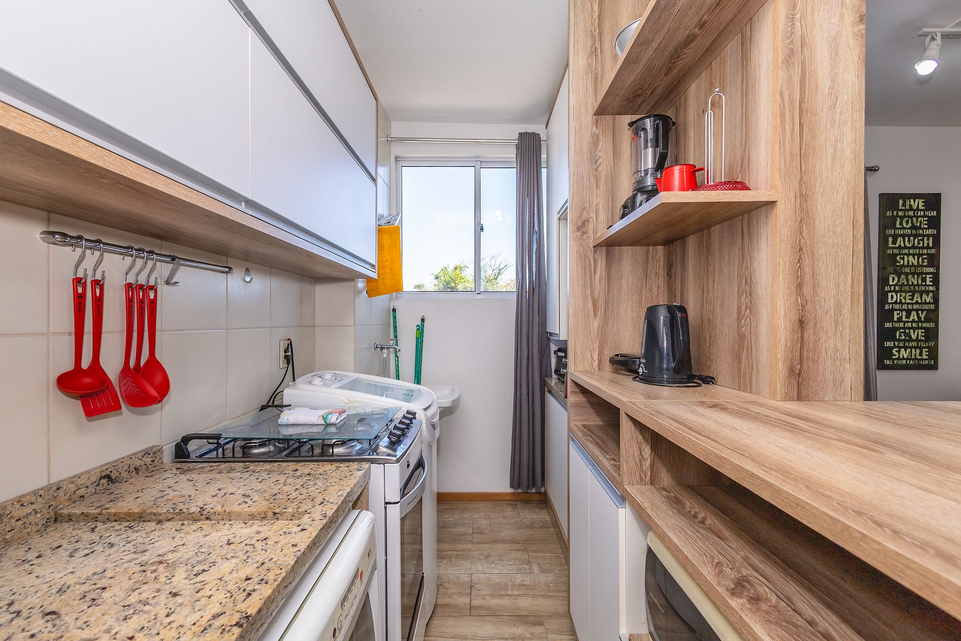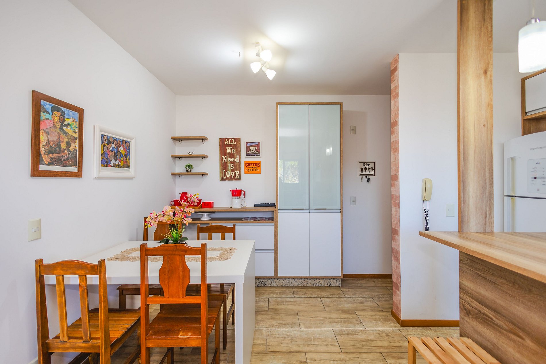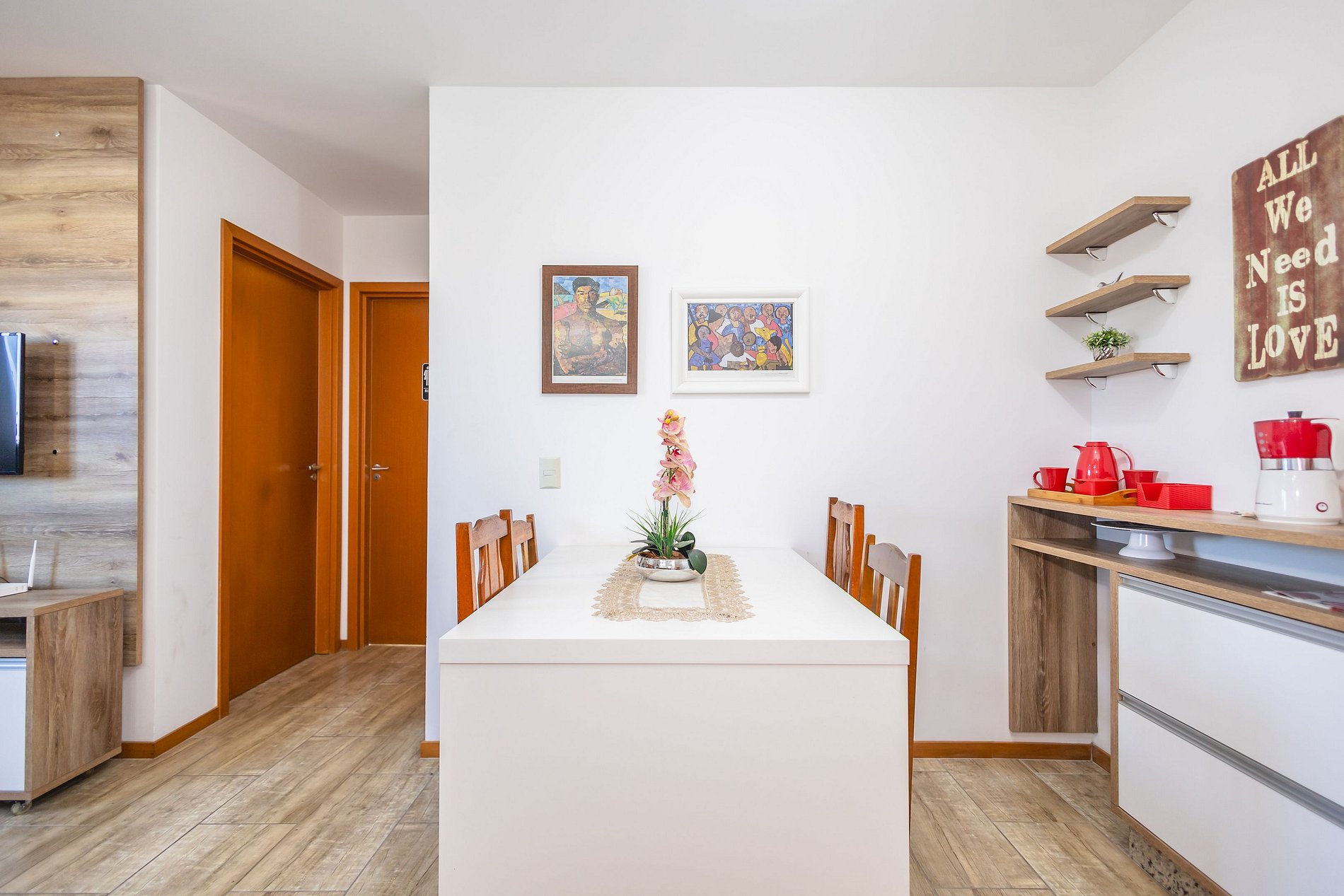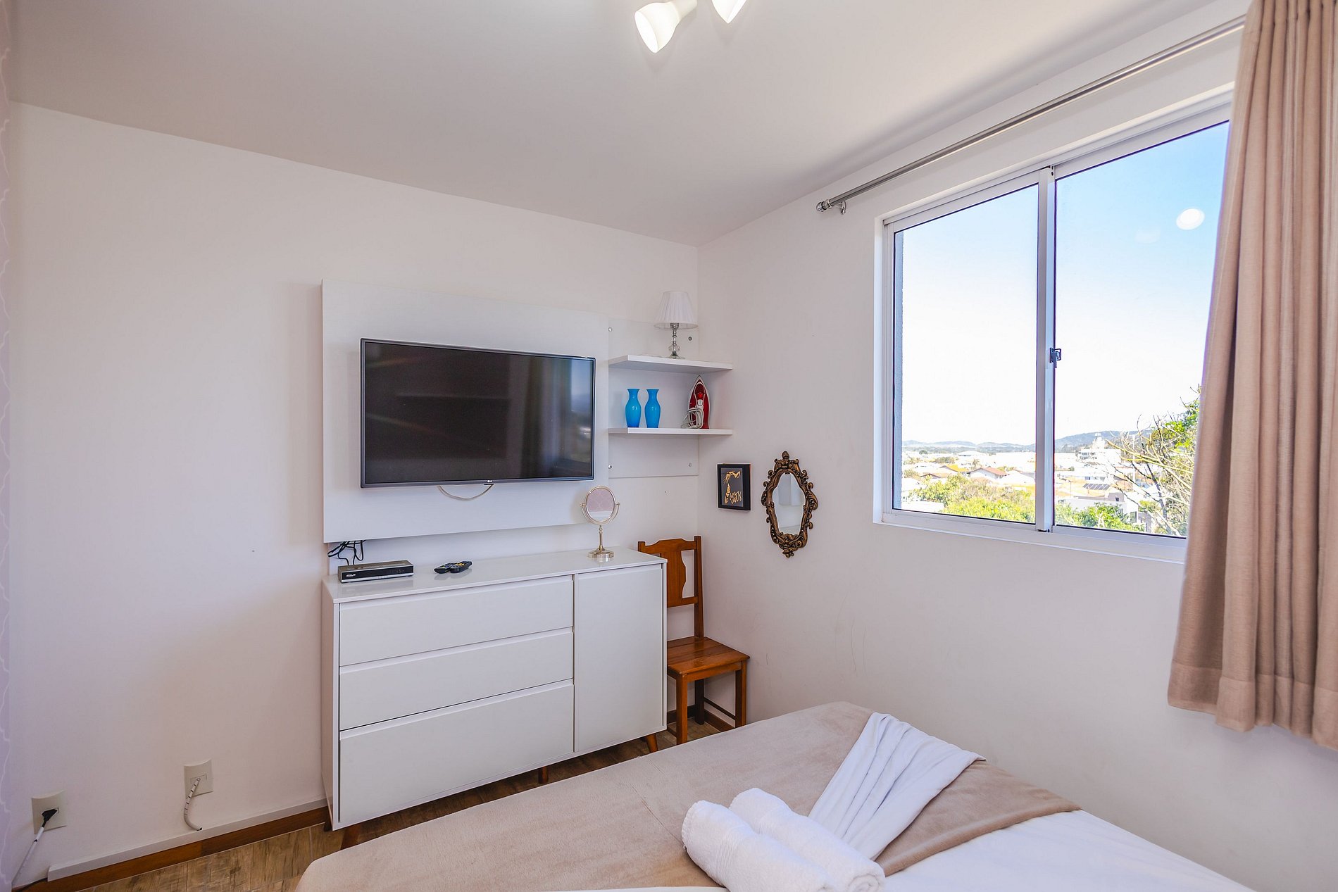 O imóvel possui sala integrada à cozinha, sacada fechada em vidro com churrasqueira, ar-condicionado no quarto de casal, Wi-Fi, TV e todos os utensílios necessários para uma estadia completa.