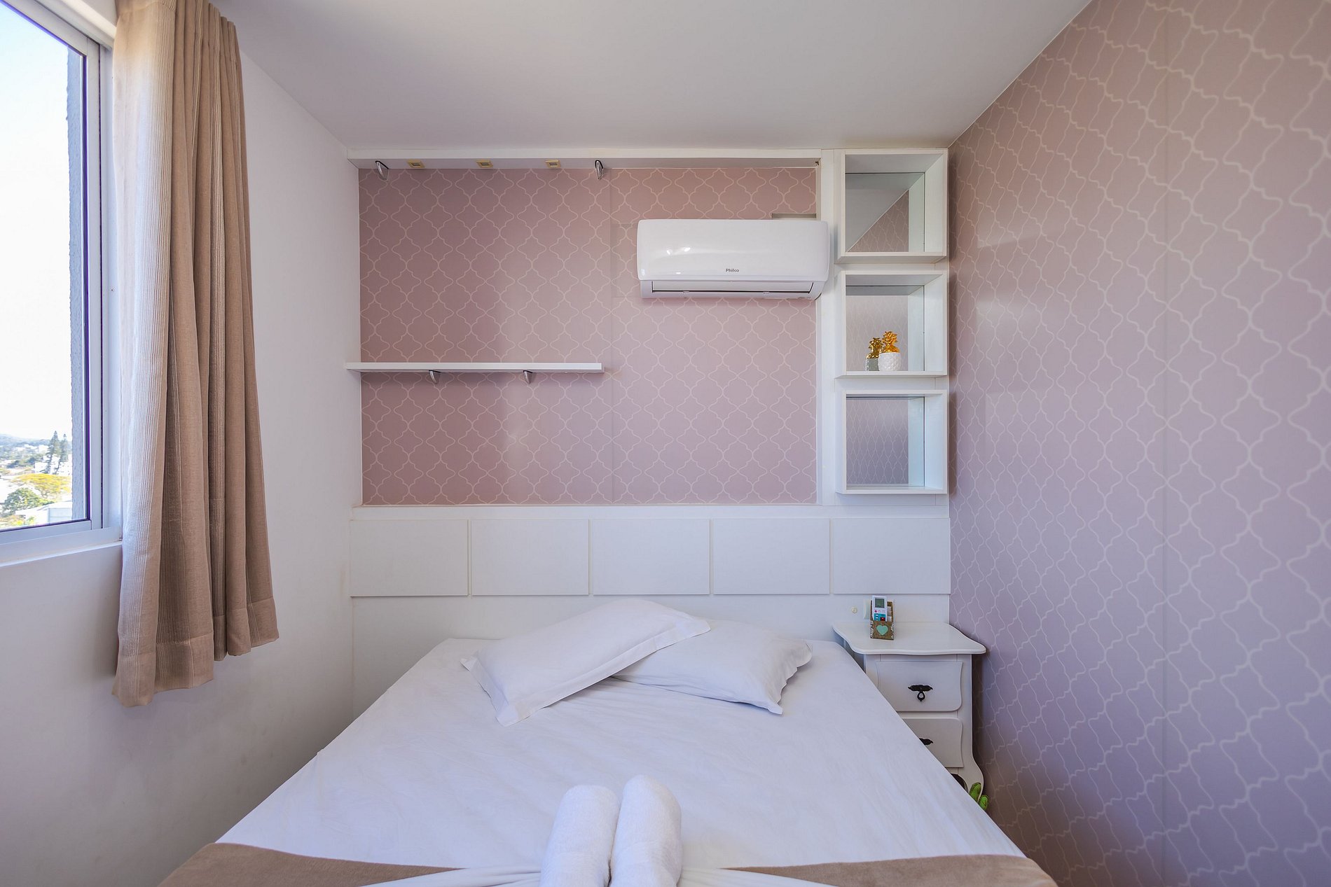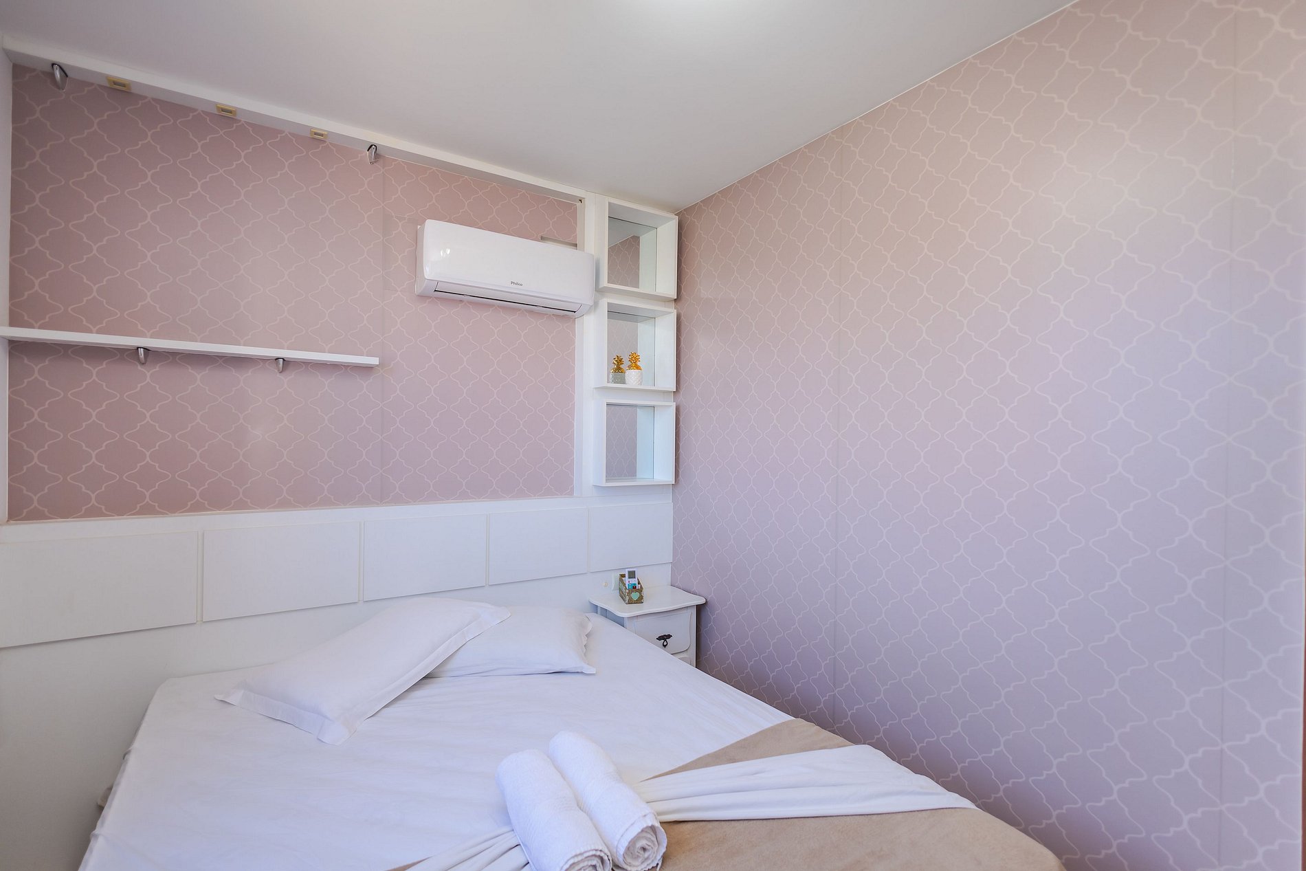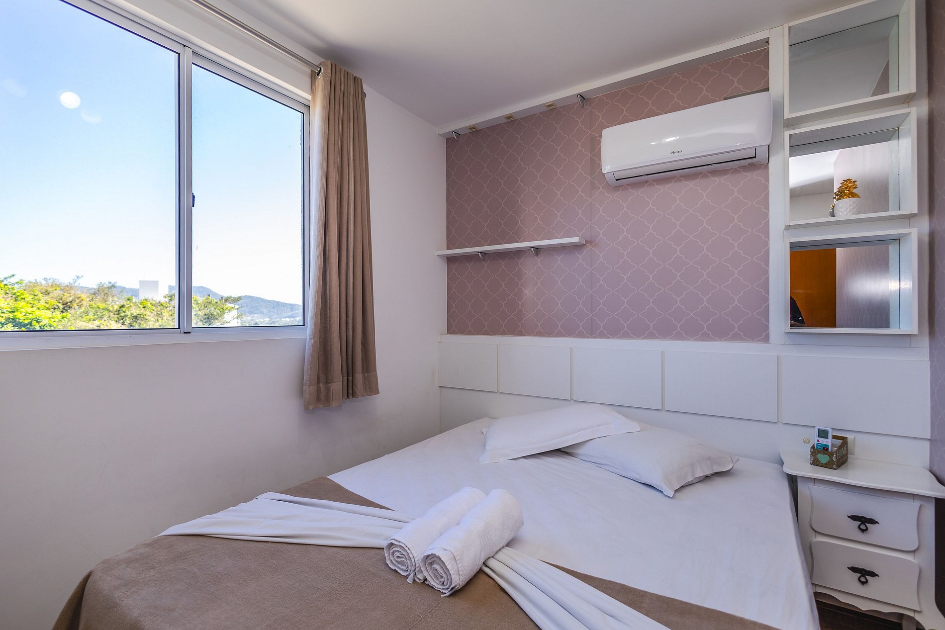 • Quarto 1 (casal): cama de casal, cabeceira, ar-condicionado split, cortina privativa, mesa de apoio, TV.
