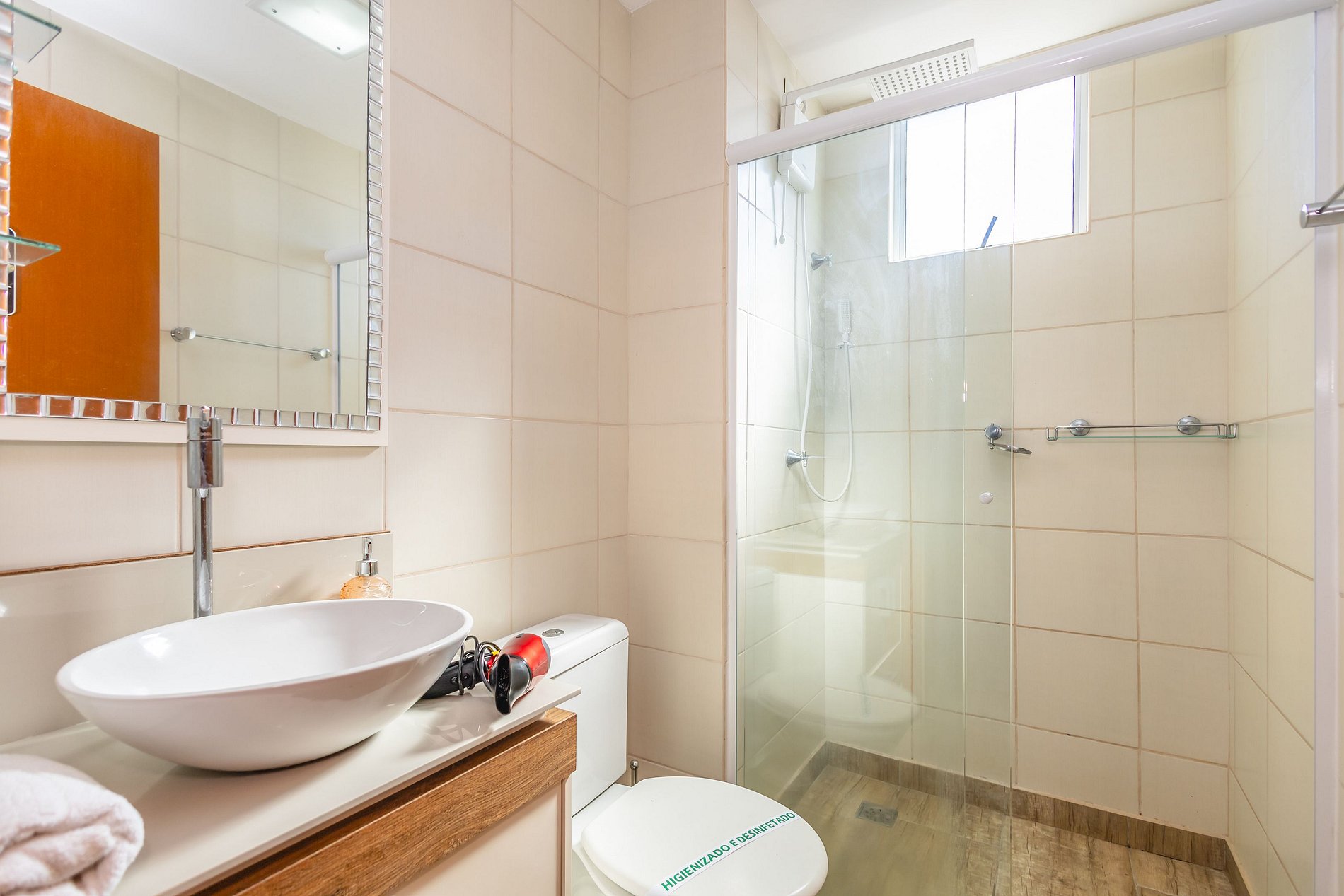 • Banheiro: box de vidro, água quente, espelho, secador de cabelo.