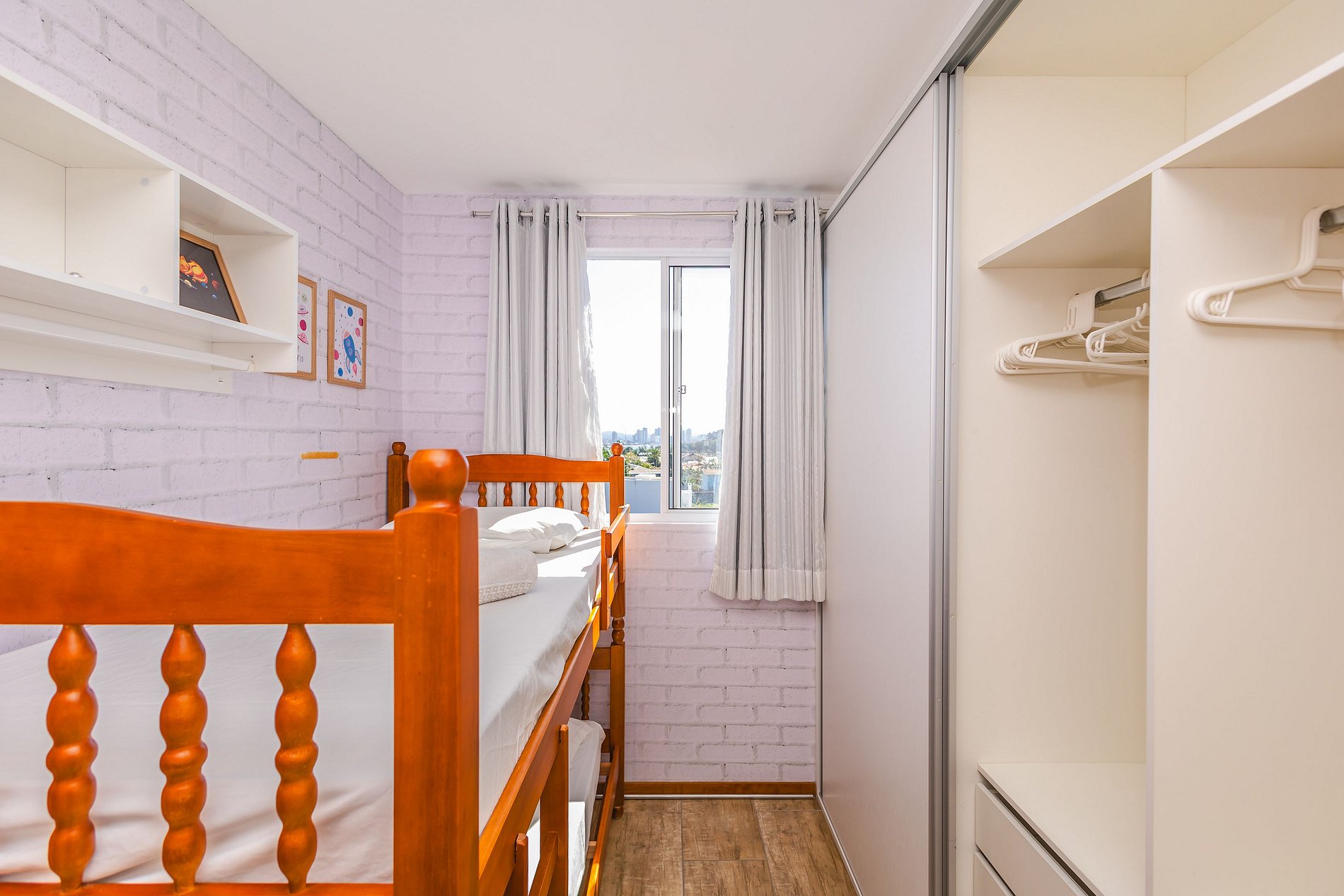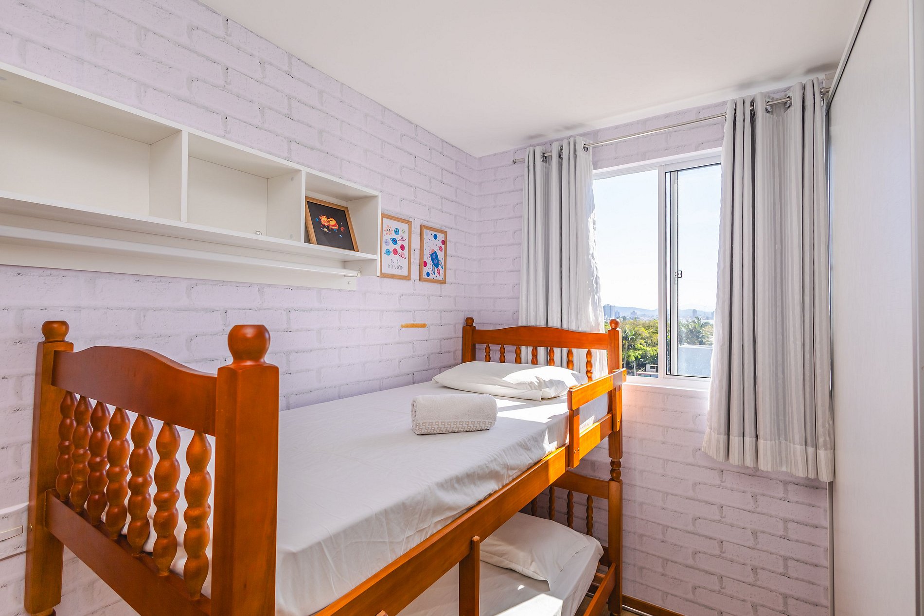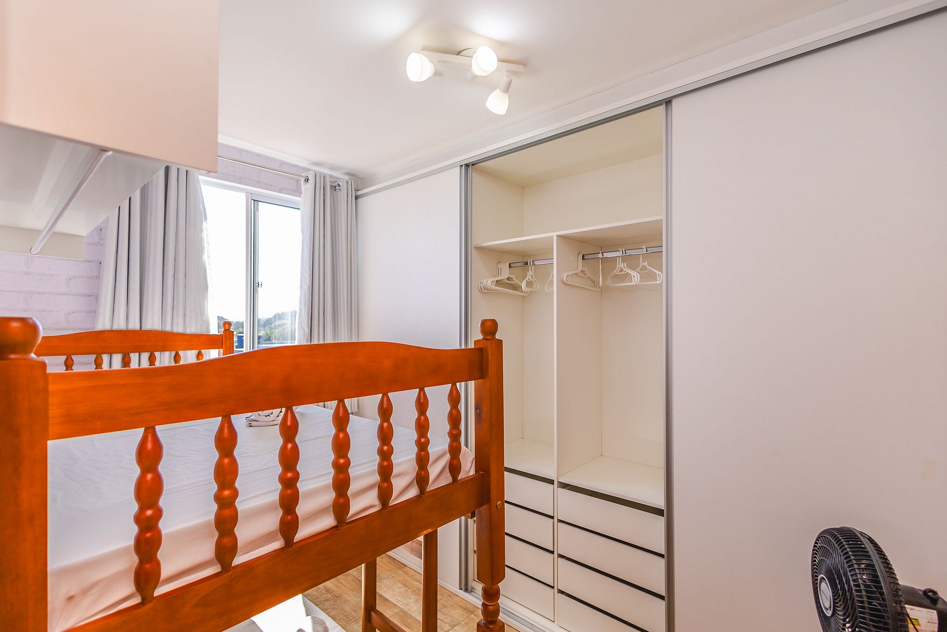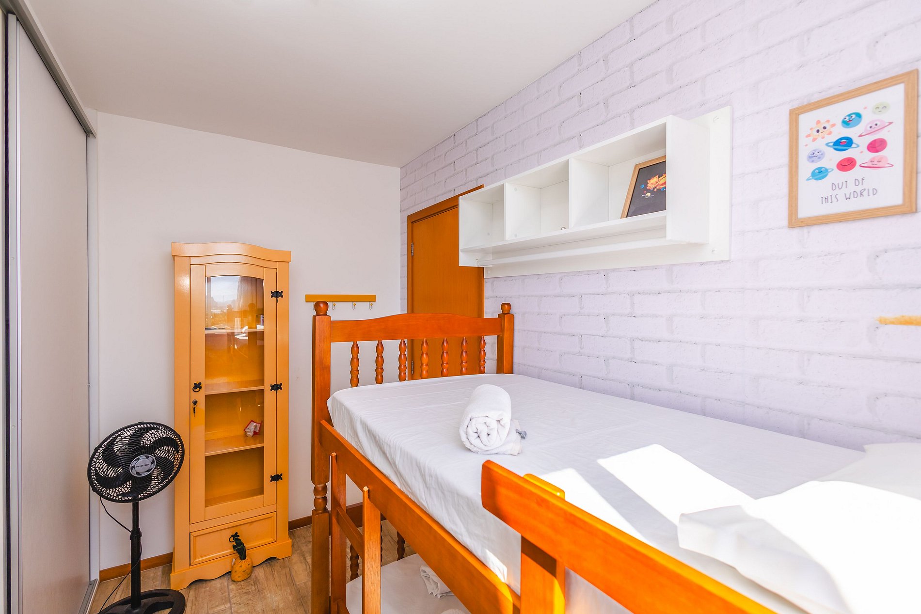 • Quarto 2 (beliche): cama beliche, armário com cabides, ventilador de coluna, cortina privativa.