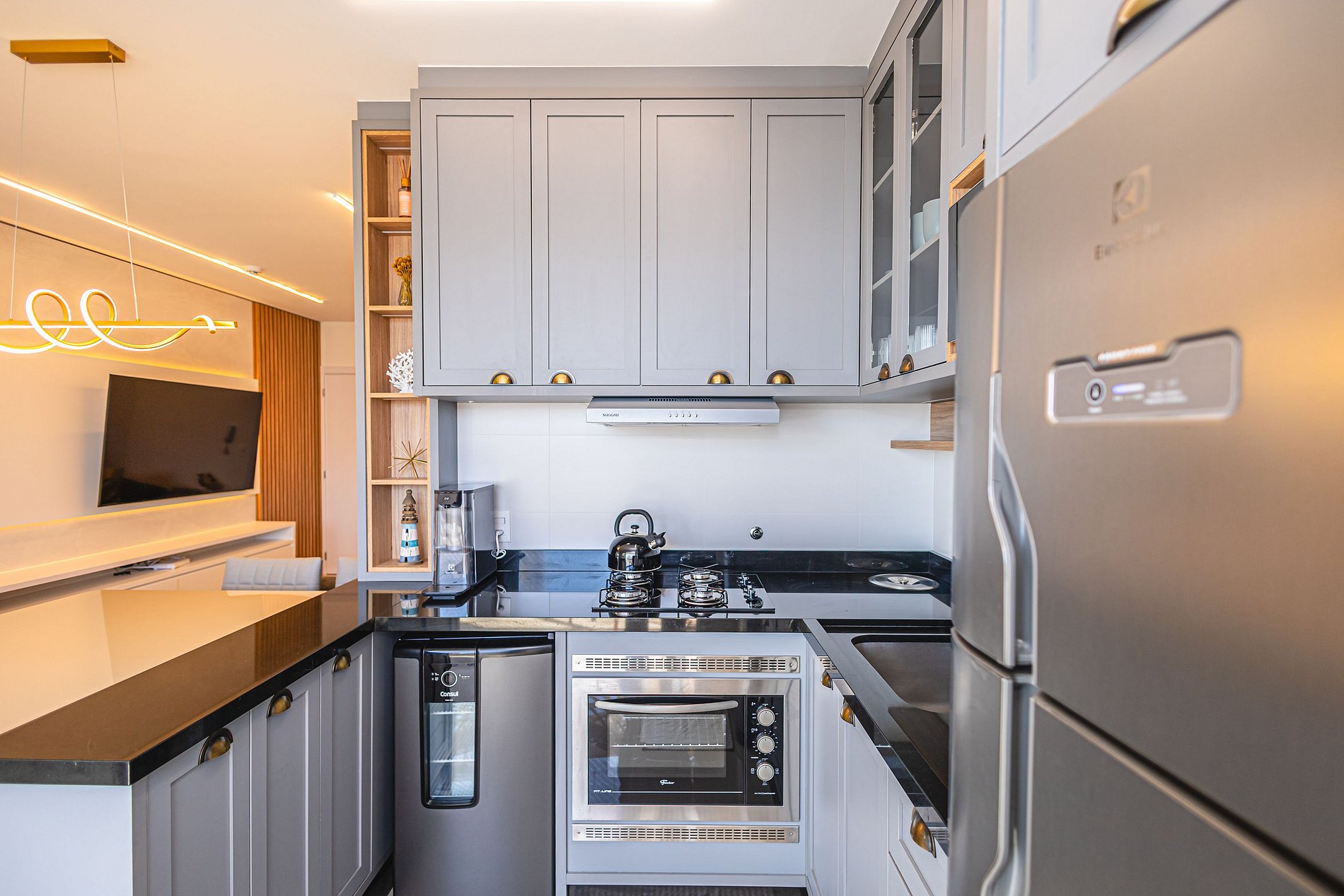 • Cozinha integrada: geladeira, adega climatizada, filtro de água, forno, cooktop, depurador, micro-ondas, airfryer, chaleira elétrica, pratos, copos, taças, canecas, panelas, talheres e utensílios.