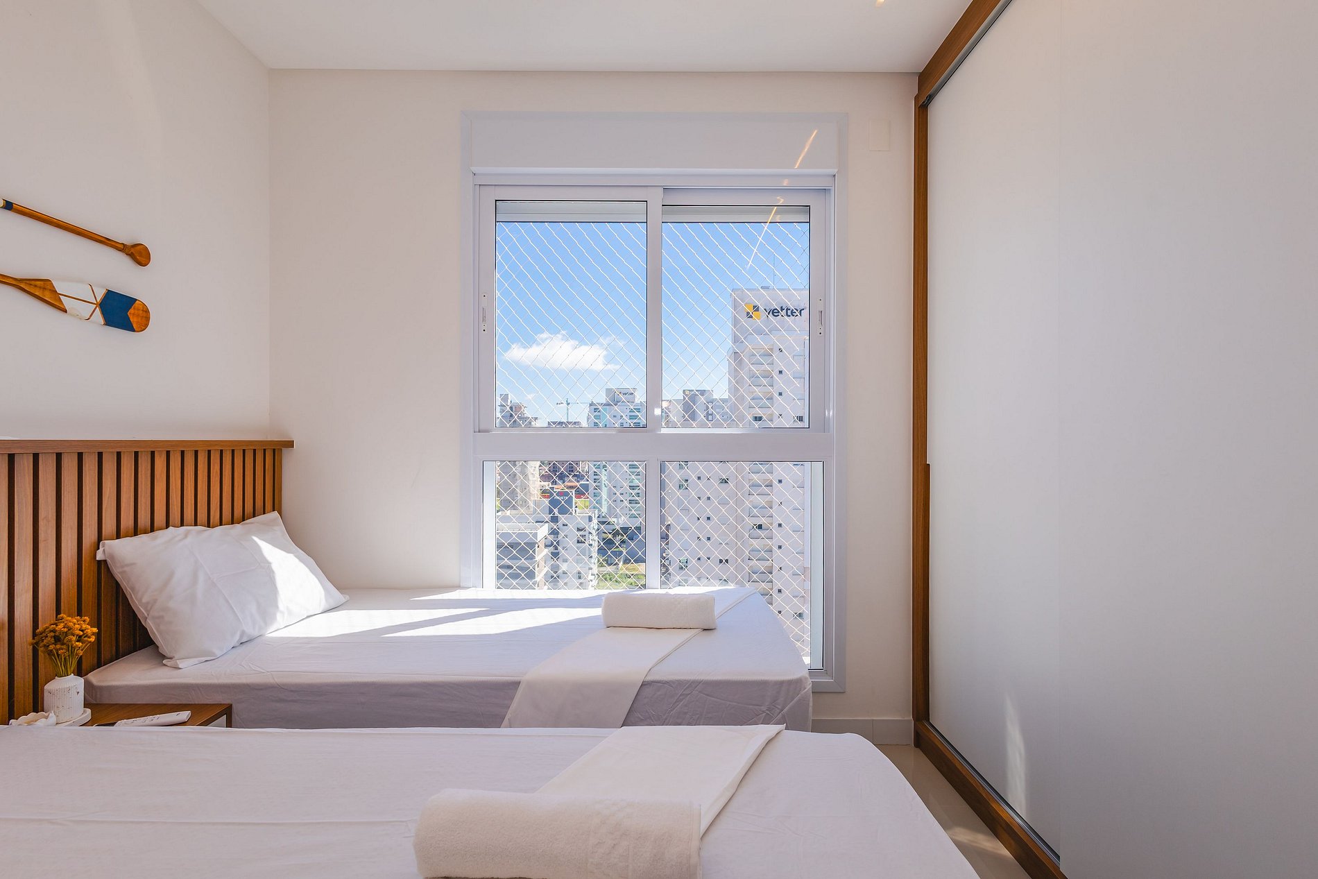 • Quarto adicional: 2 camas de solteiro, armário espelhado com cabides, mesa de apoio, janela ampla com veneziana, ar-condicionado split e vista para o mar.