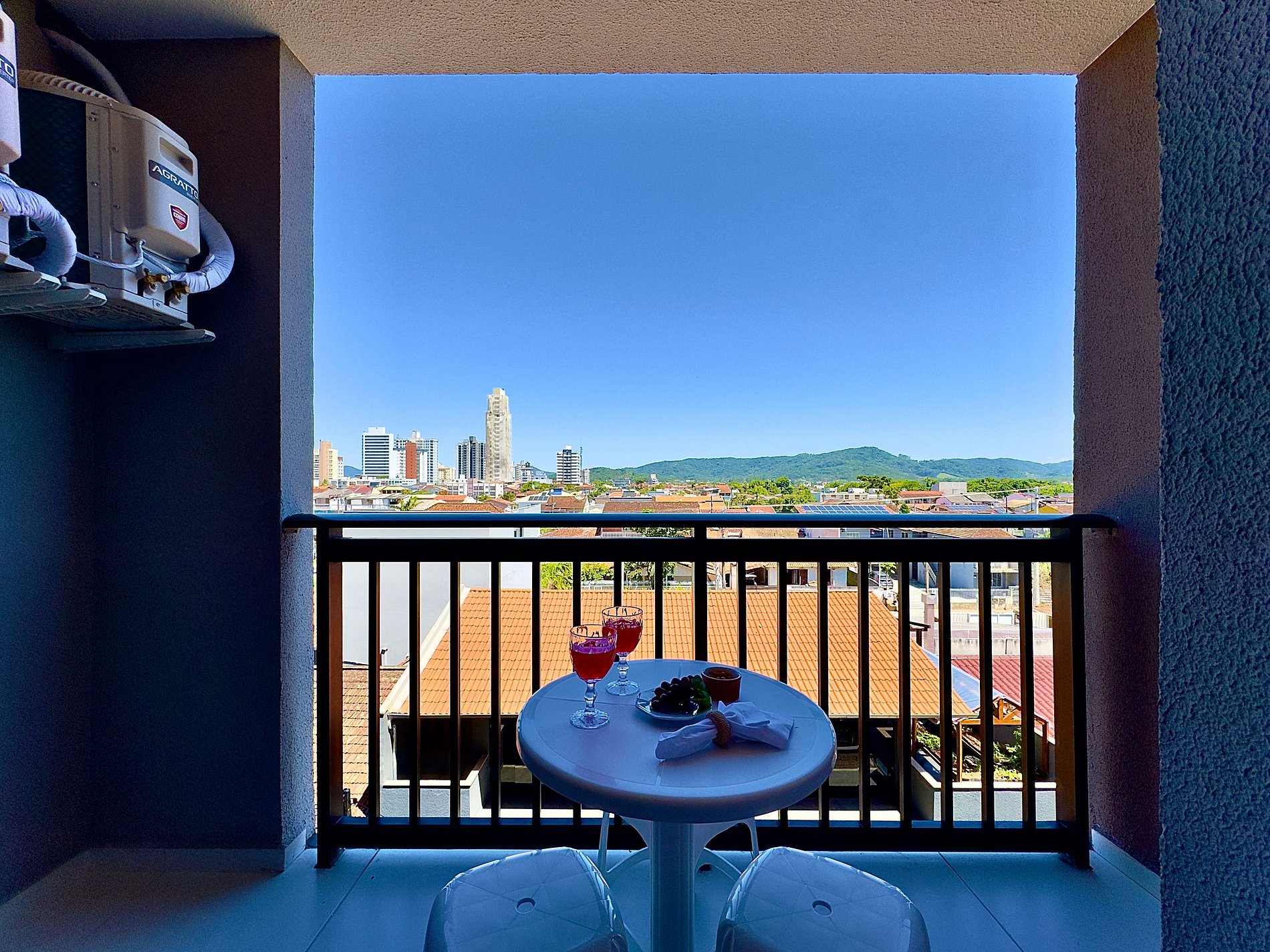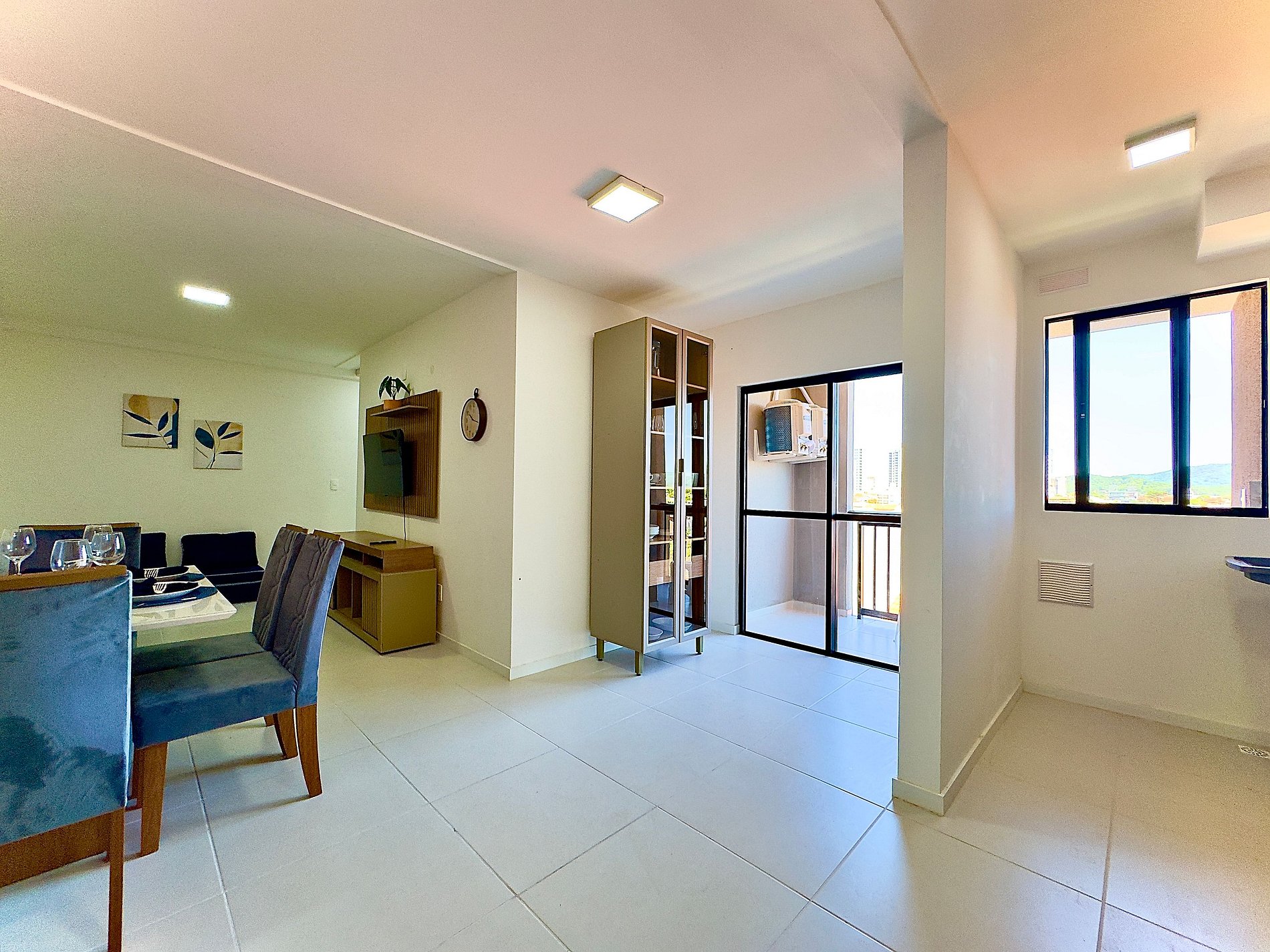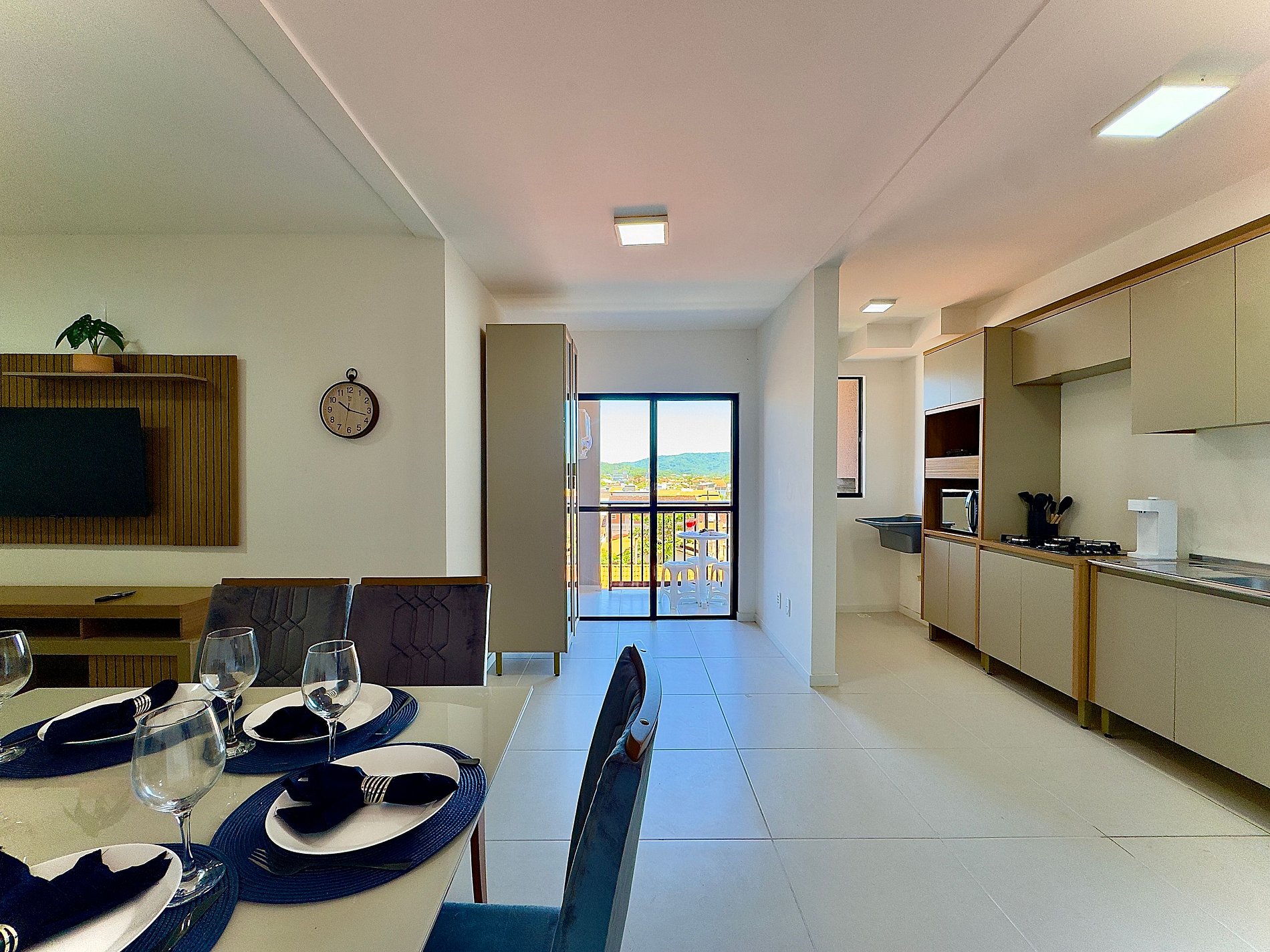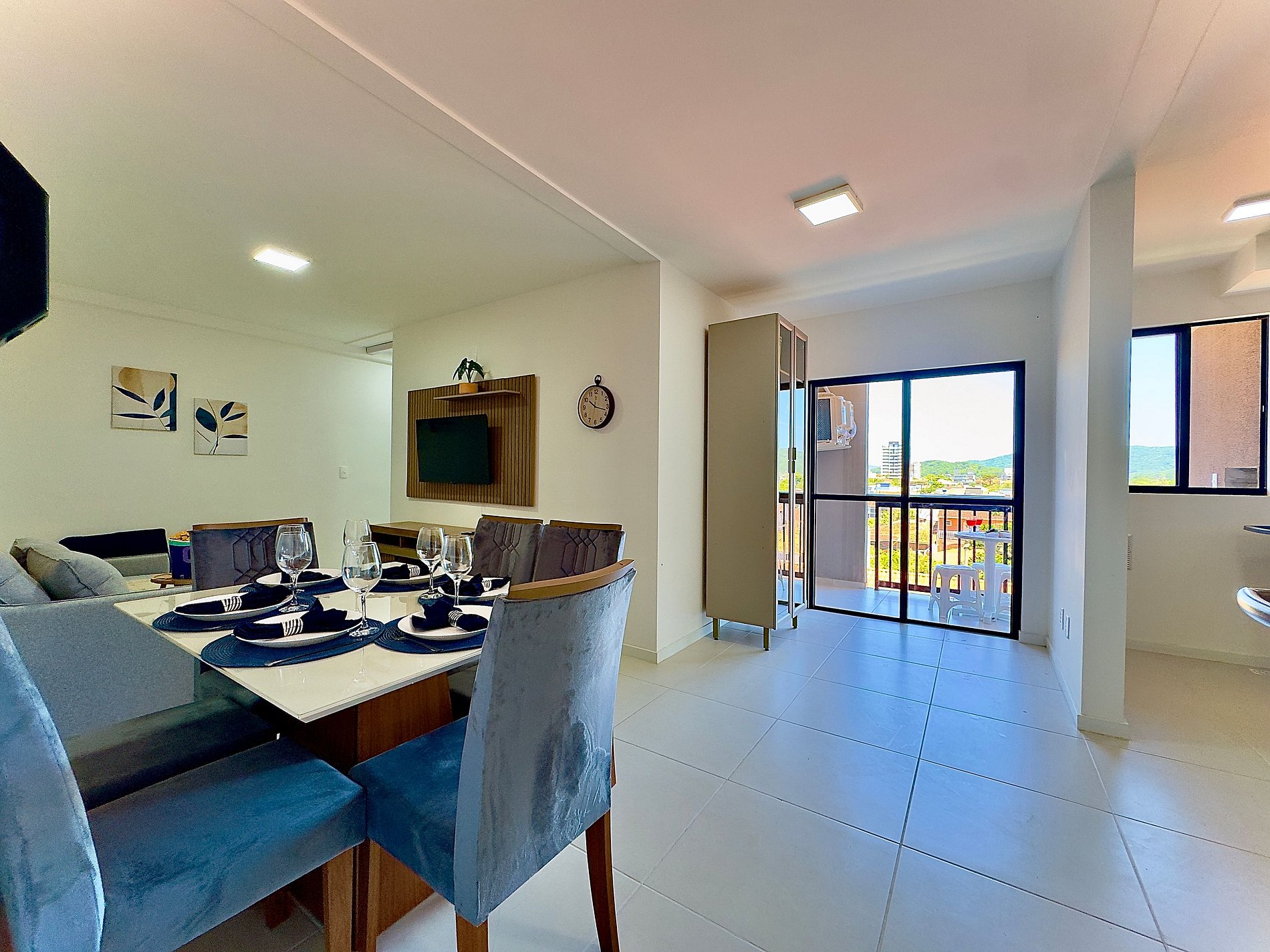 • Sala: sofá-cama para 2 hóspedes, TV Smart, mesa de jantar e acesso à varanda por porta de vidro com cortina privativa.
