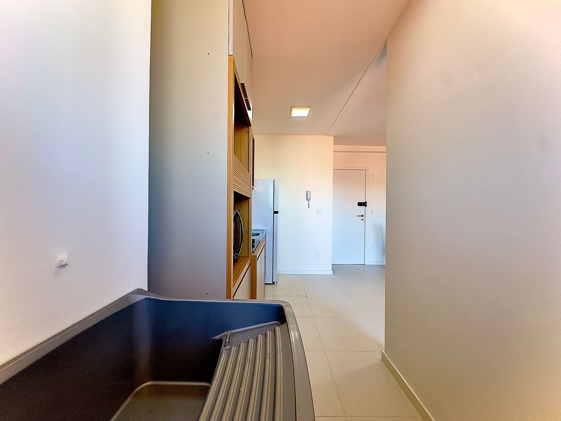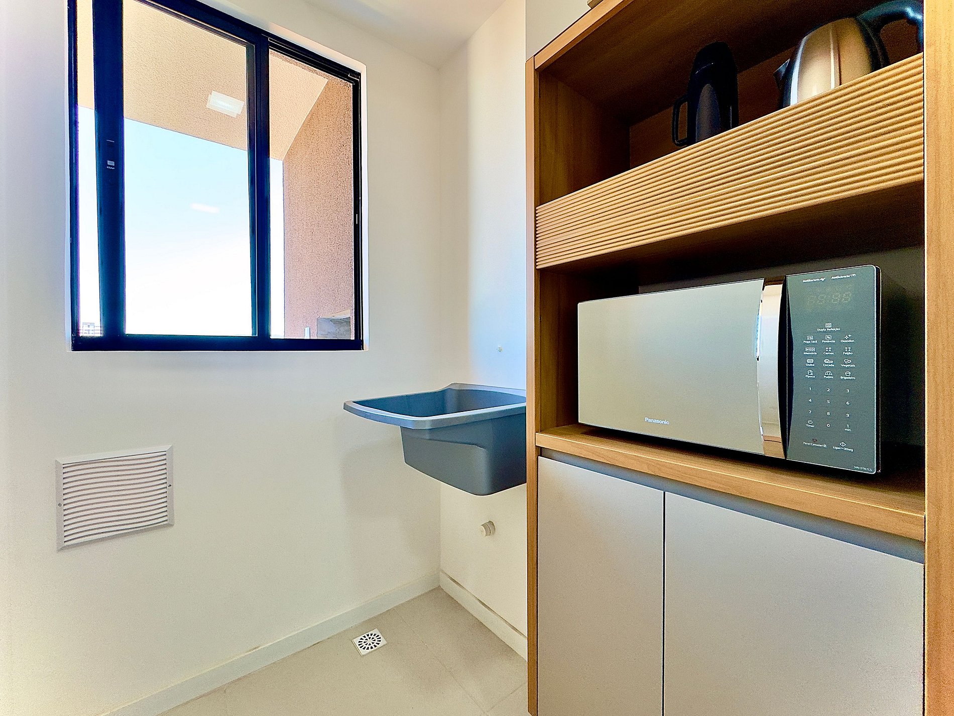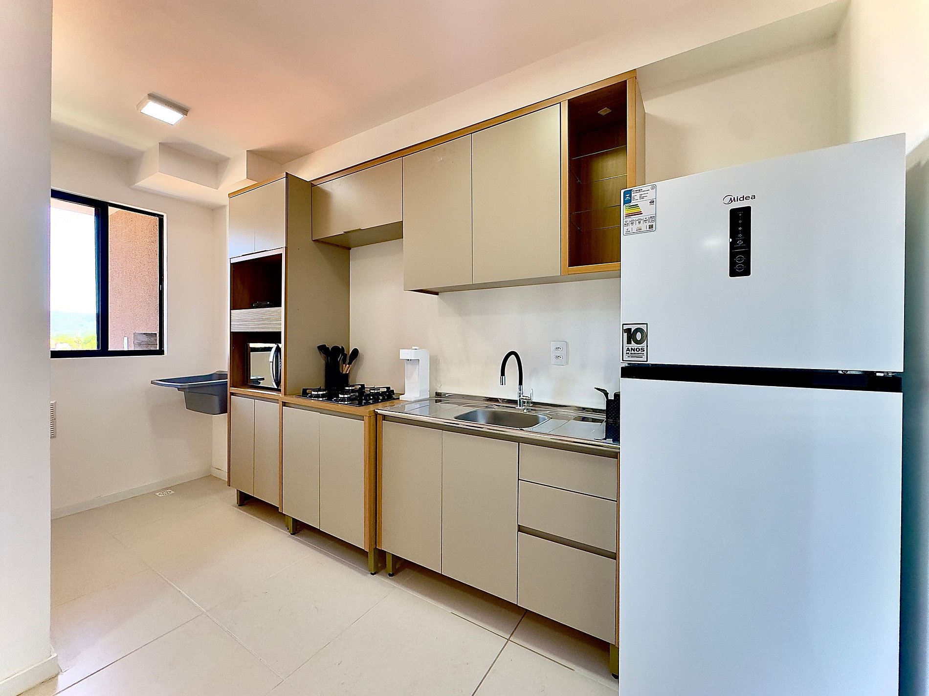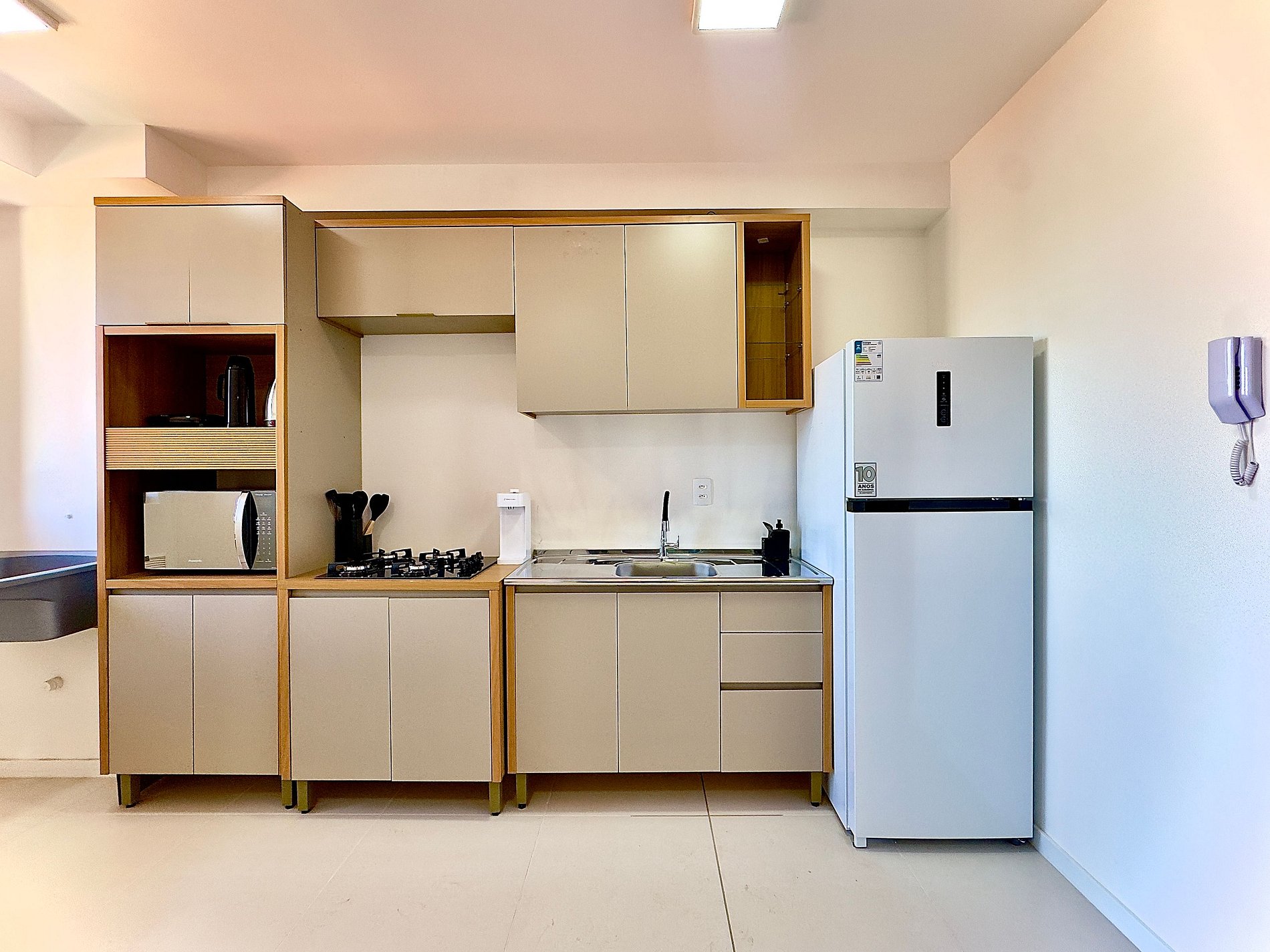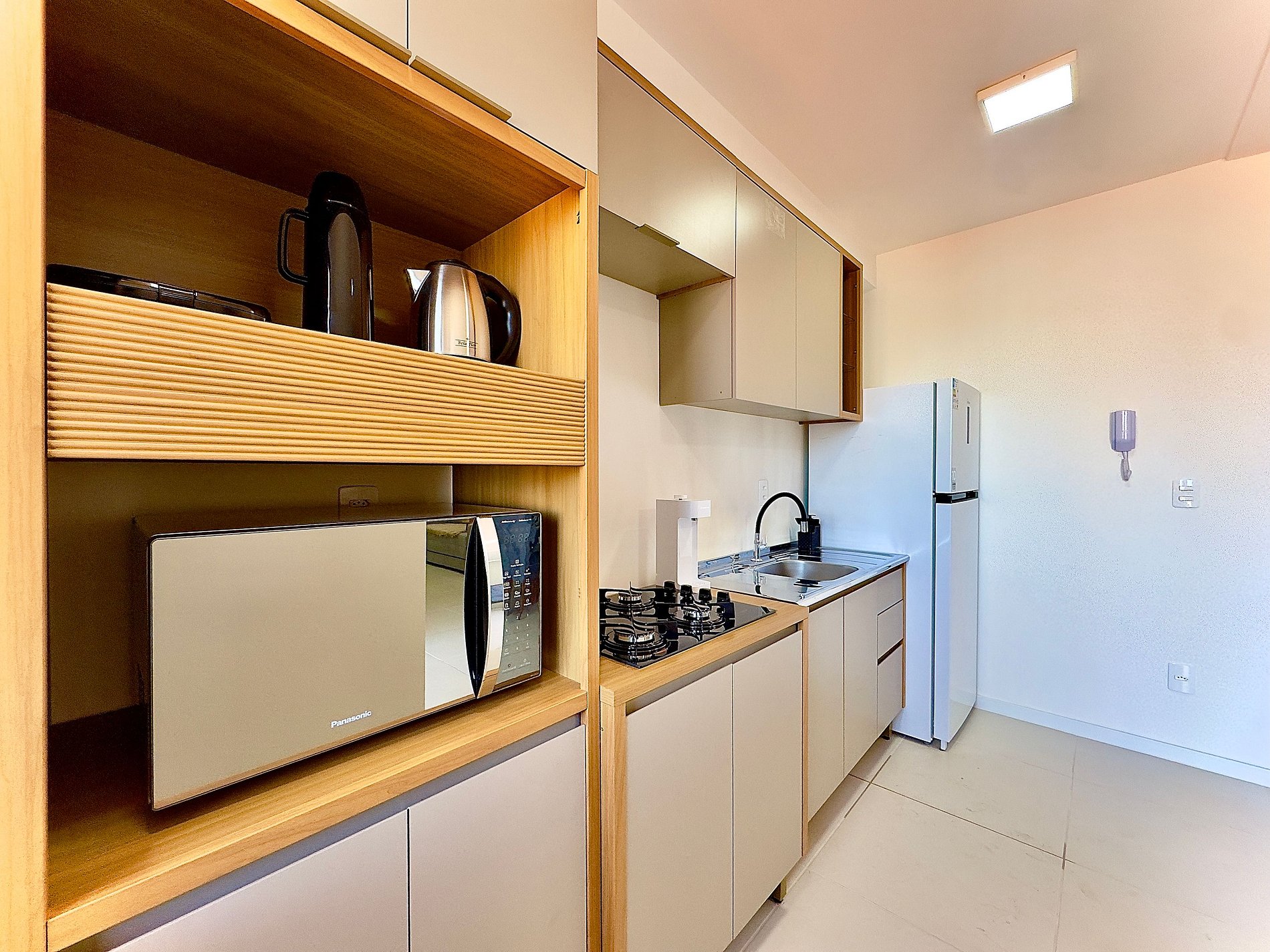 • Cozinha integrada: equipada com geladeira, chaleira elétrica, micro-ondas, cooktop, liquidificador, copos, taças, pratos, panelas, talheres e utensílios básicos.