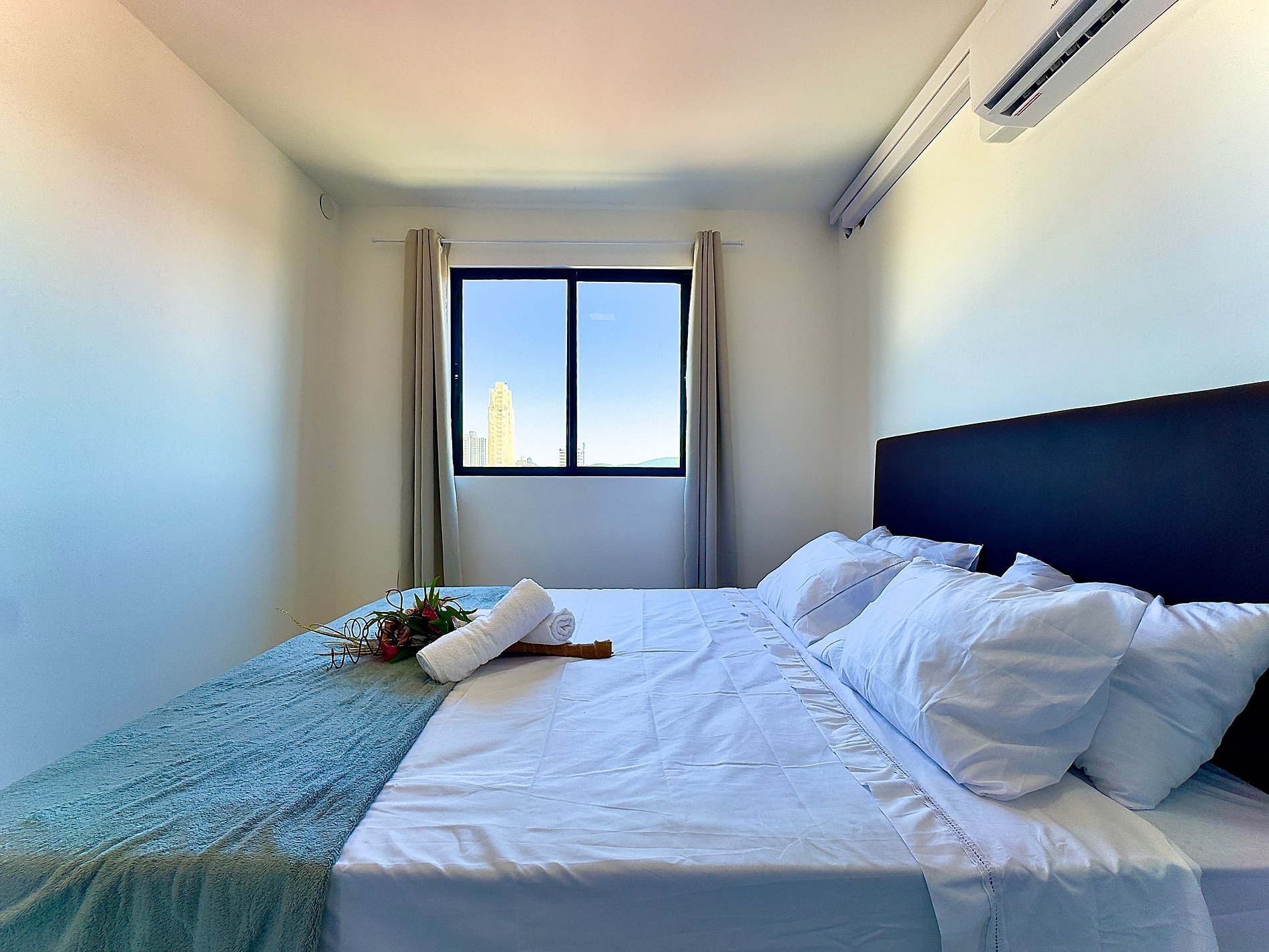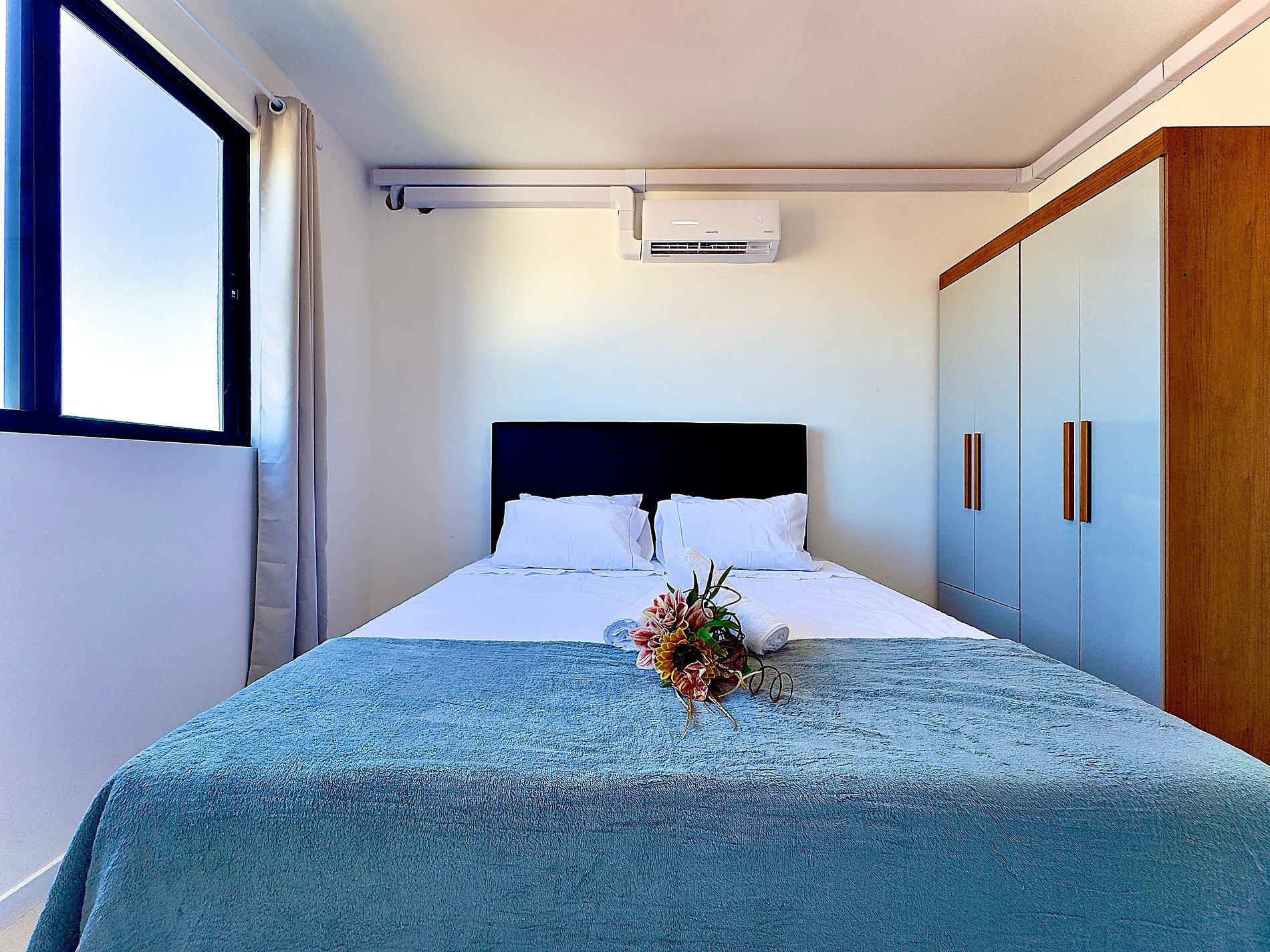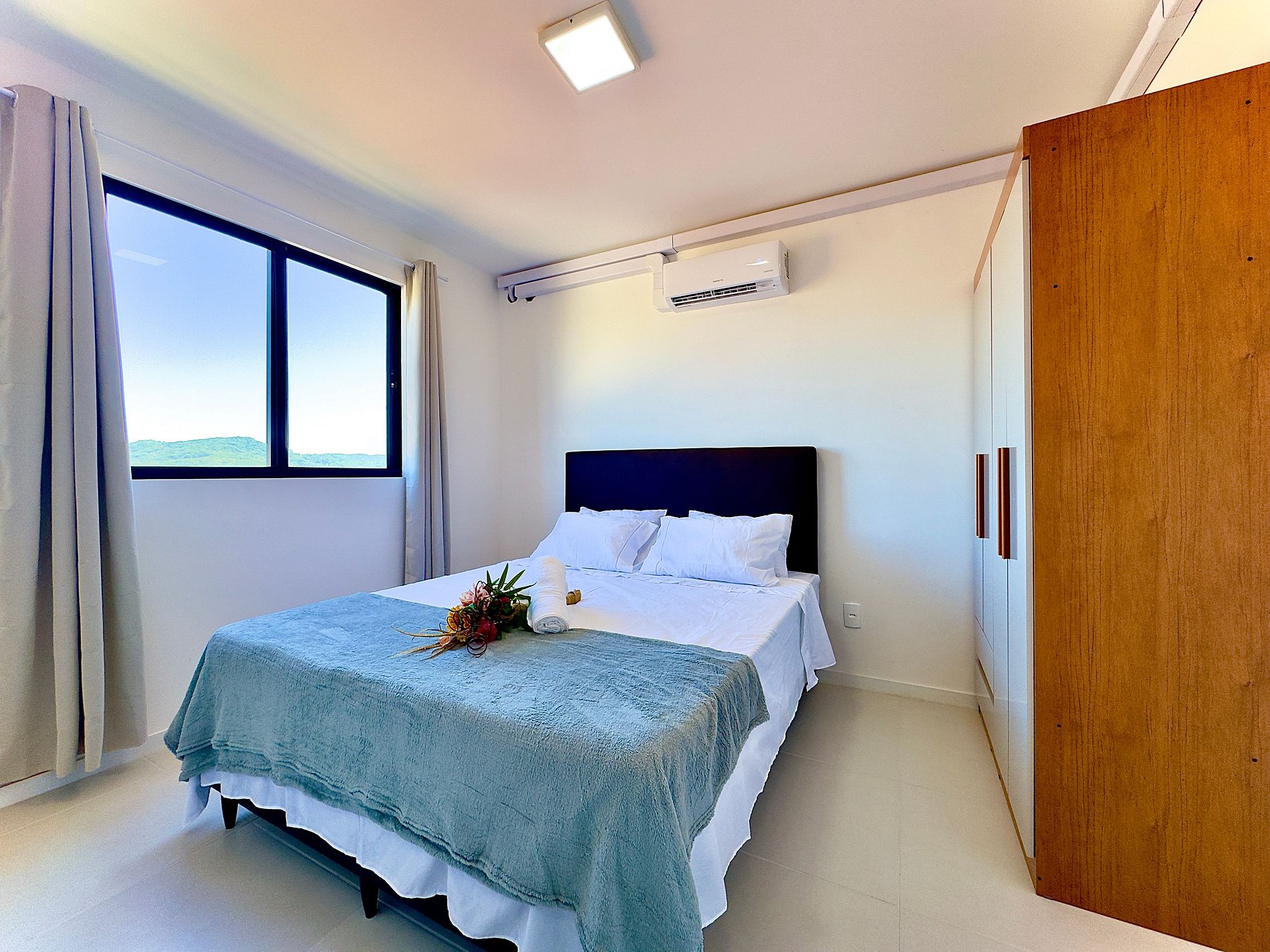• Quarto 1 climatizado: cama de casal, mesa de apoio, armário com cabides, cortina privativa e ar-condicionado.