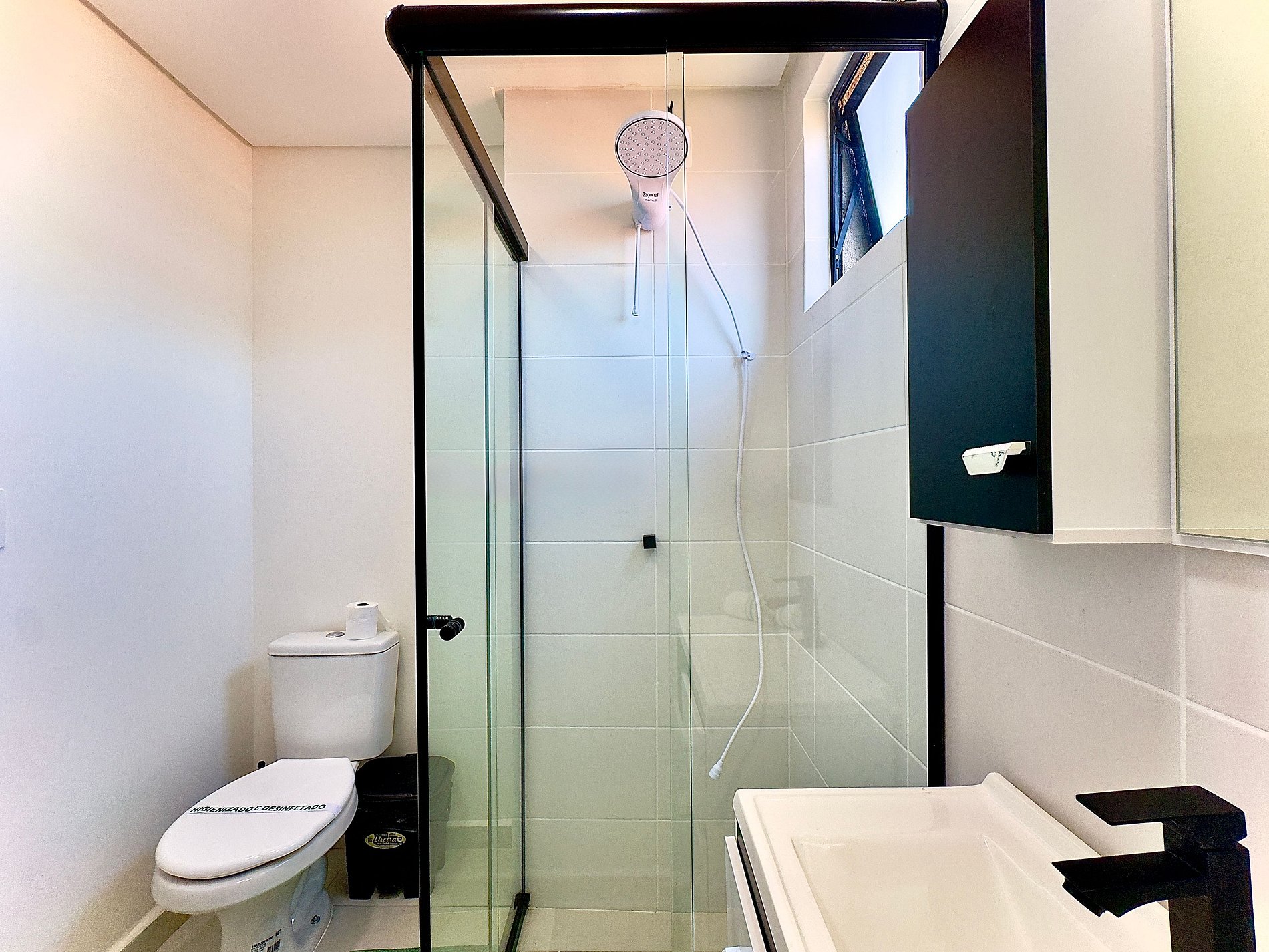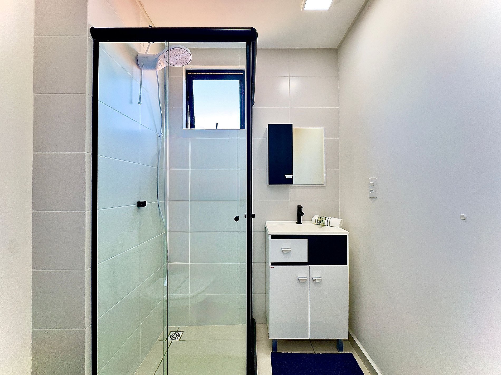 • Banheiro: box de vidro, chuveiro com água quente, espelho e secador de cabelo.