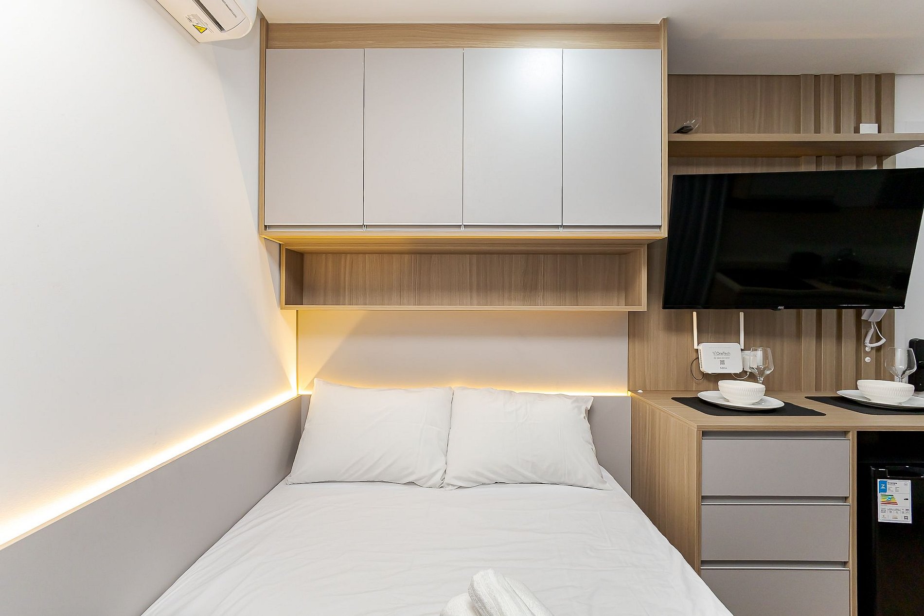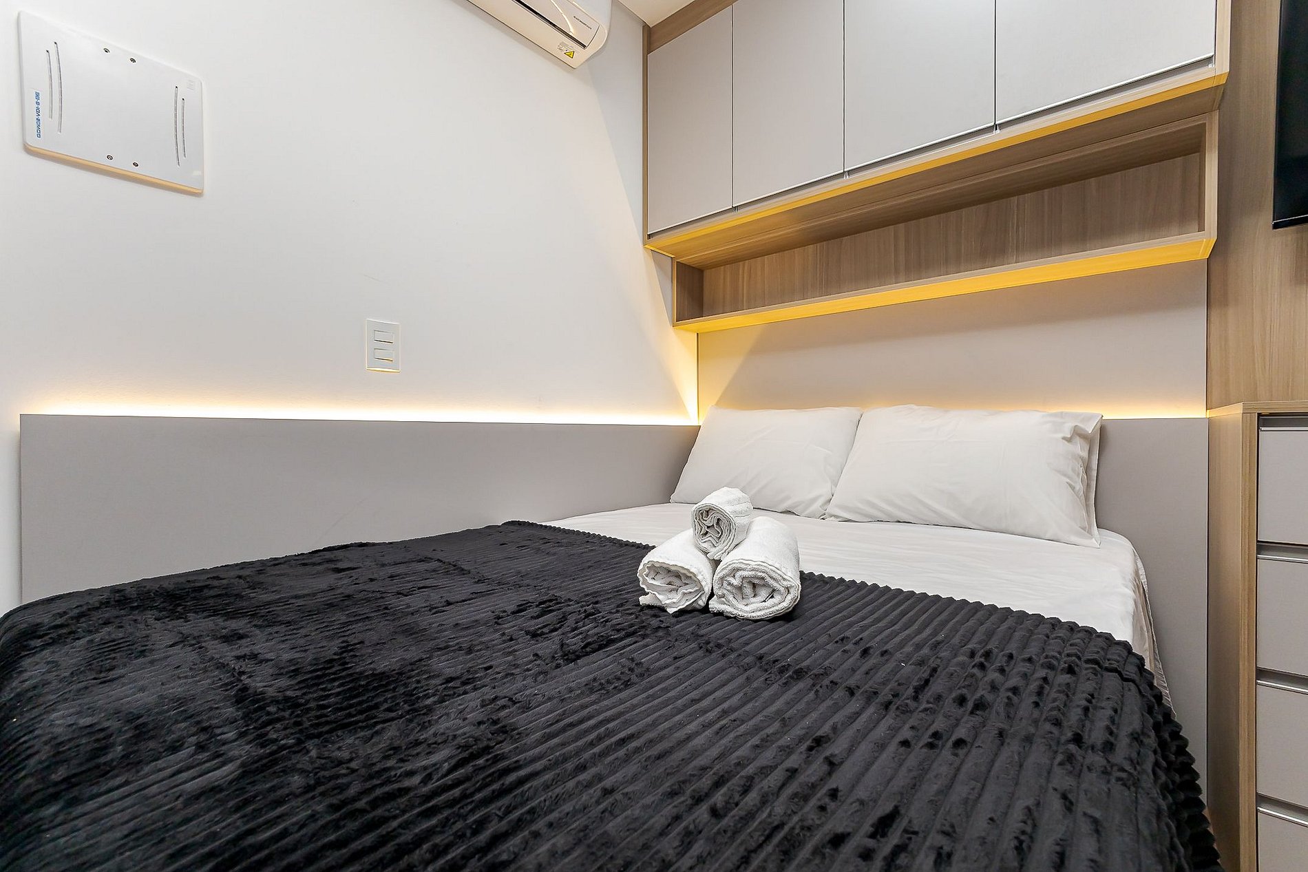 • O estúdio oferece cama de casal, armário, TV Smart, ar-condicionado, Wi-Fi e cortina privativa para maior conforto.
