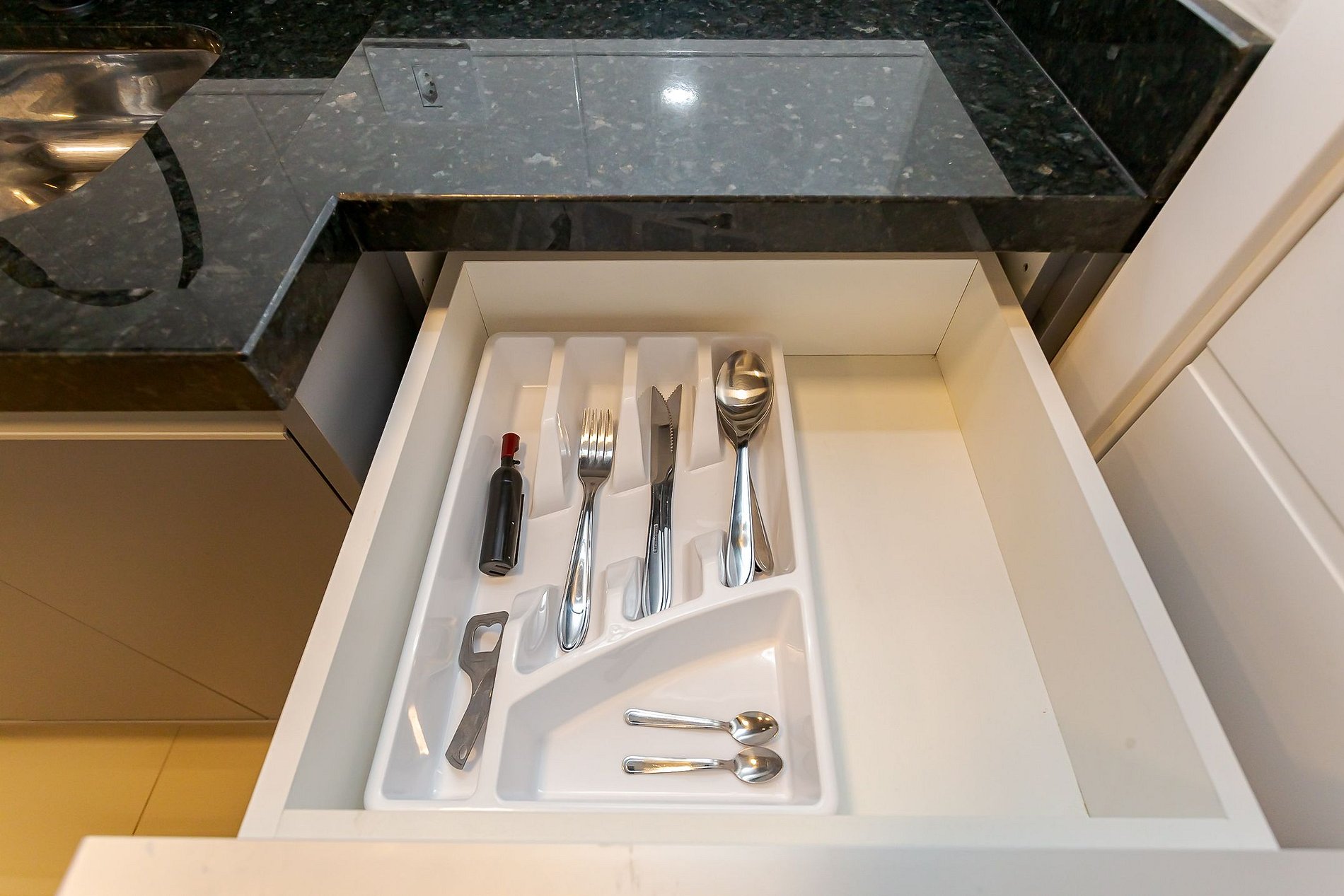 • Cozinha completa: equipada com geladeira, cooktop, air-fryer, micro-ondas, cafeteira, chaleira elétrica, panelas, além de pratos, copos, taças, talheres e utensílios.