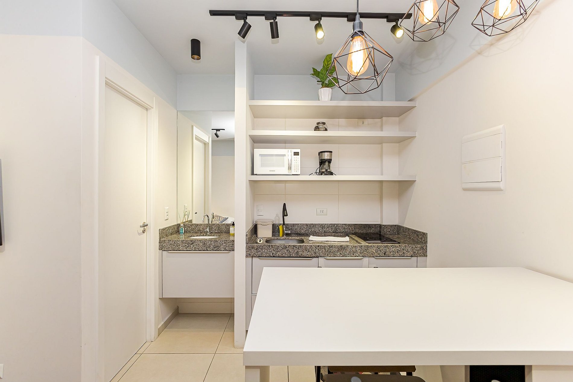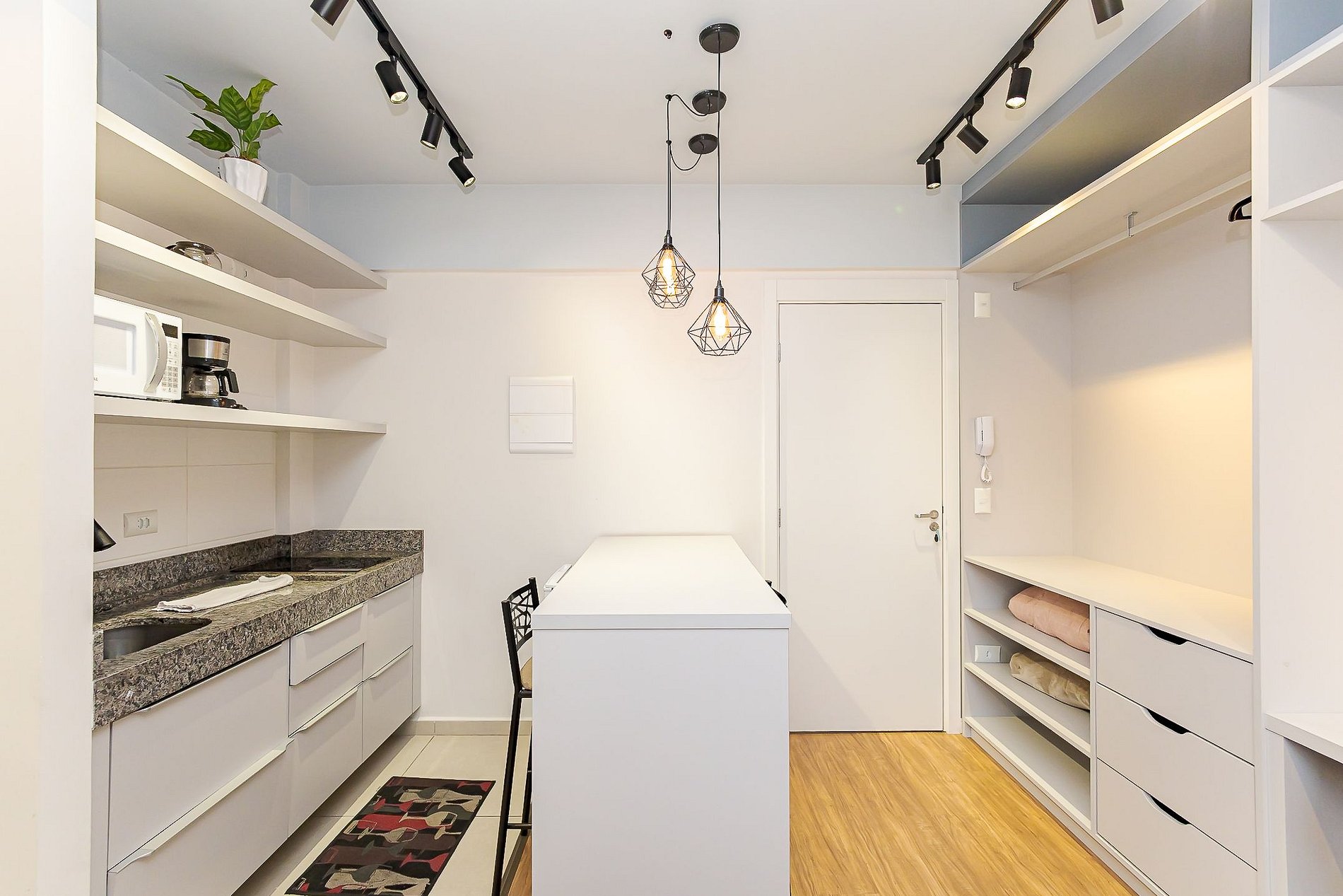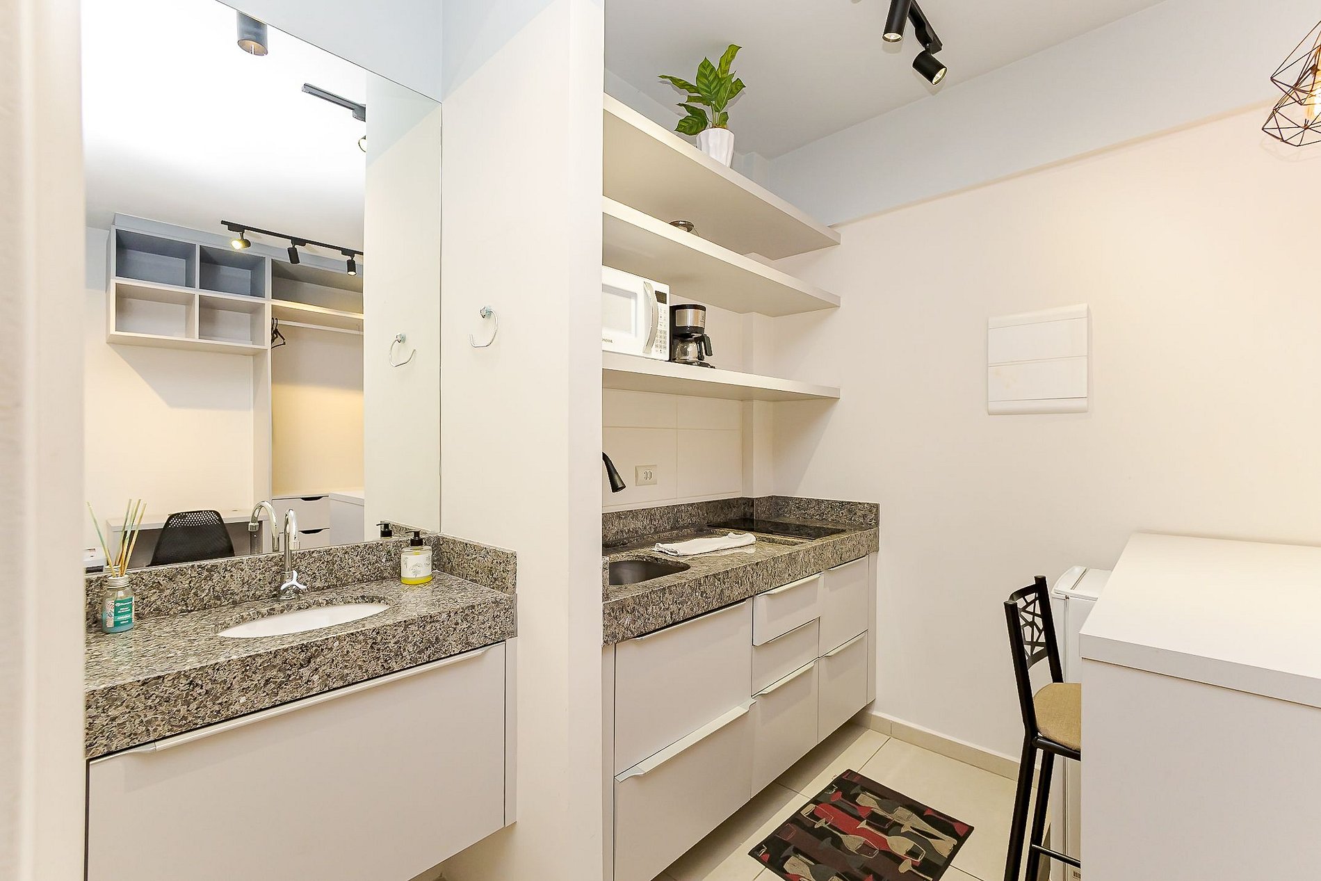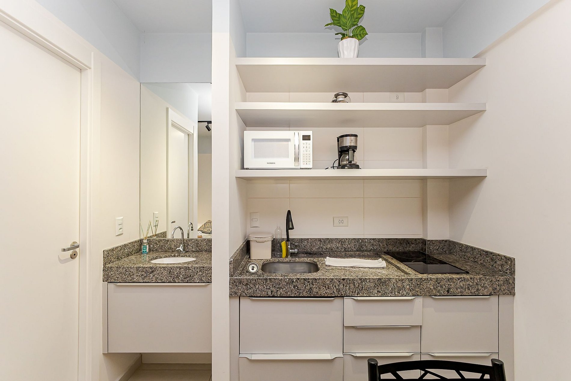 • Cozinha compacta: equipada com cooktop, micro-ondas, frigobar, cafeteira, panelas, pratos, copos, talheres e utensílios básicos.