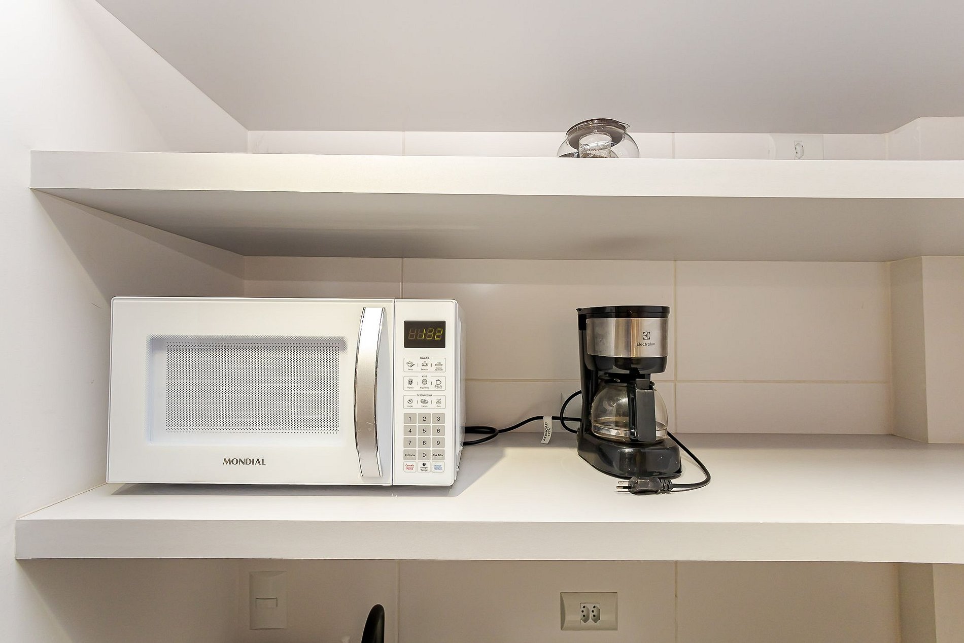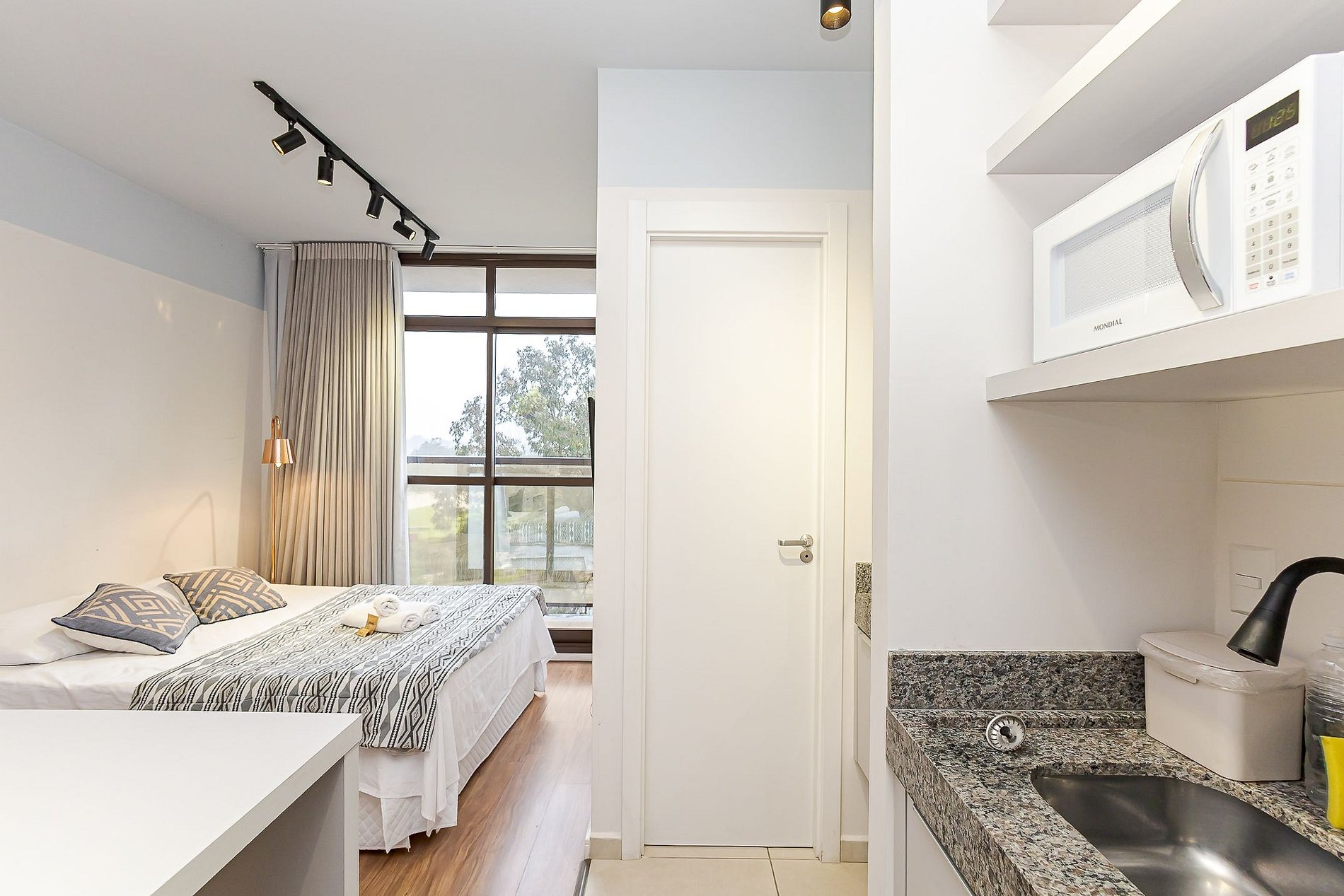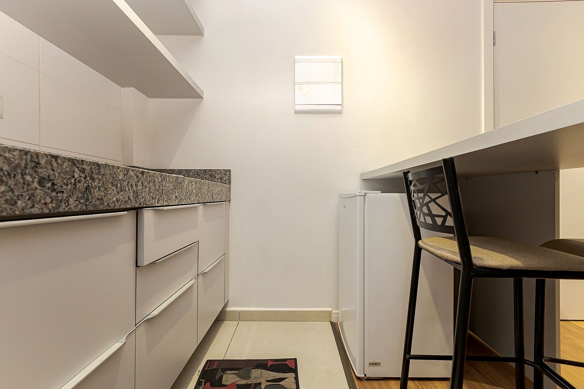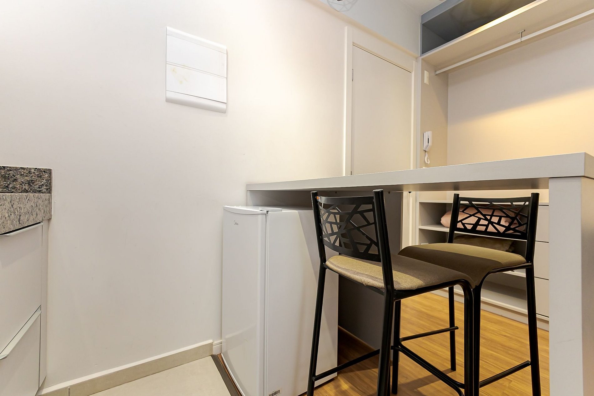 • Cozinha compacta: equipada com cooktop, micro-ondas, frigobar, cafeteira, panelas, pratos, copos, talheres e utensílios básicos.