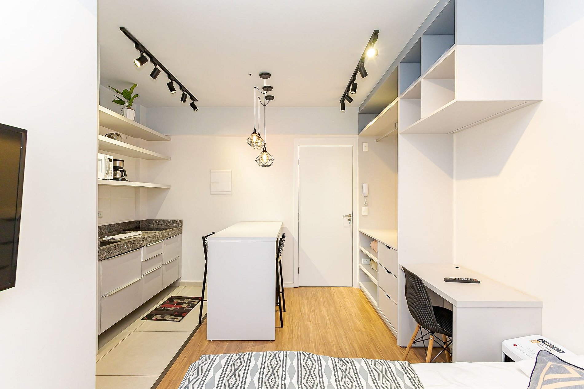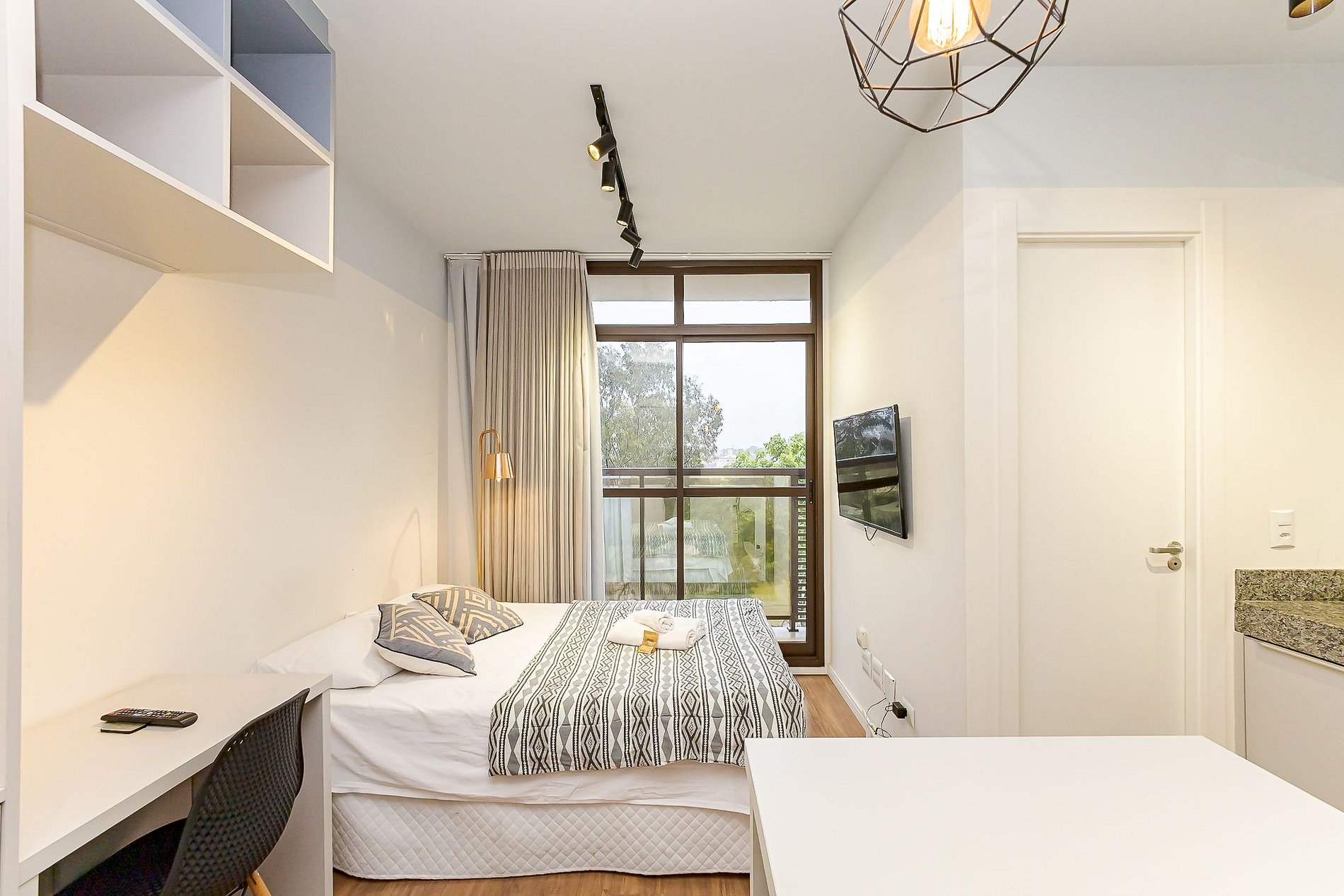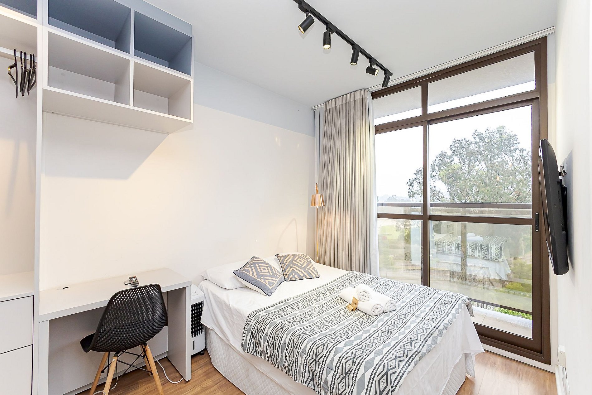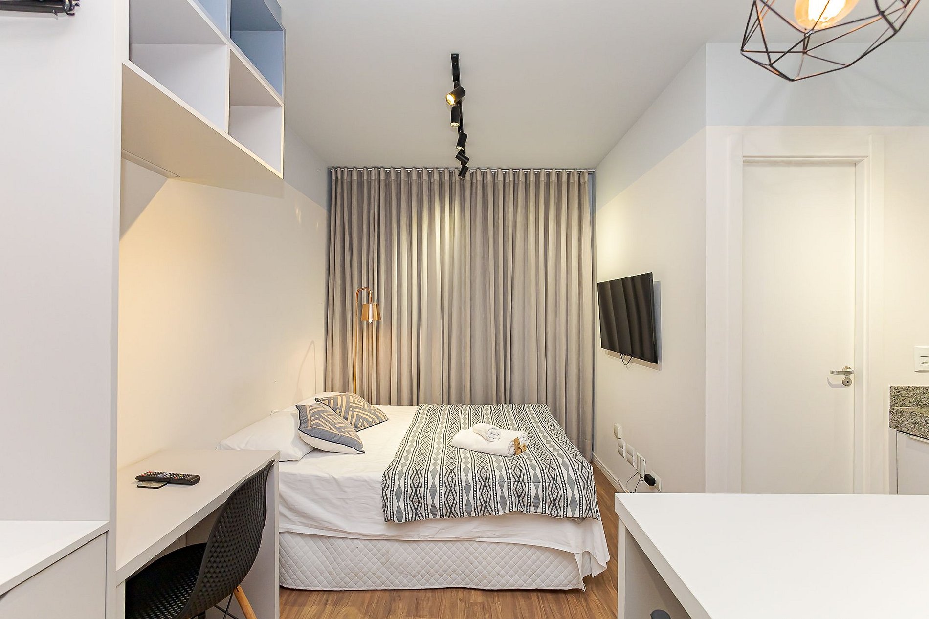 • Ambiente integrado: cama de casal, mesa com duas cadeiras para refeições, escrivaninha com cadeira para trabalho, TV Smart e armário aberto com cabides.