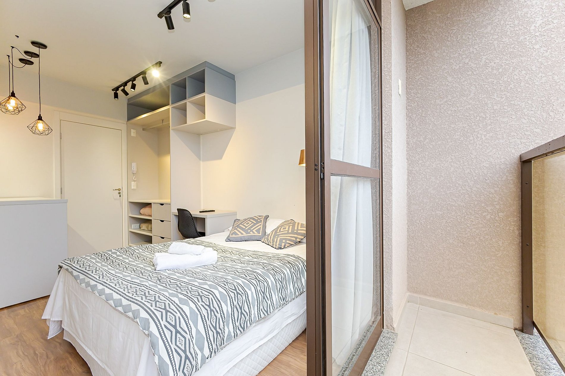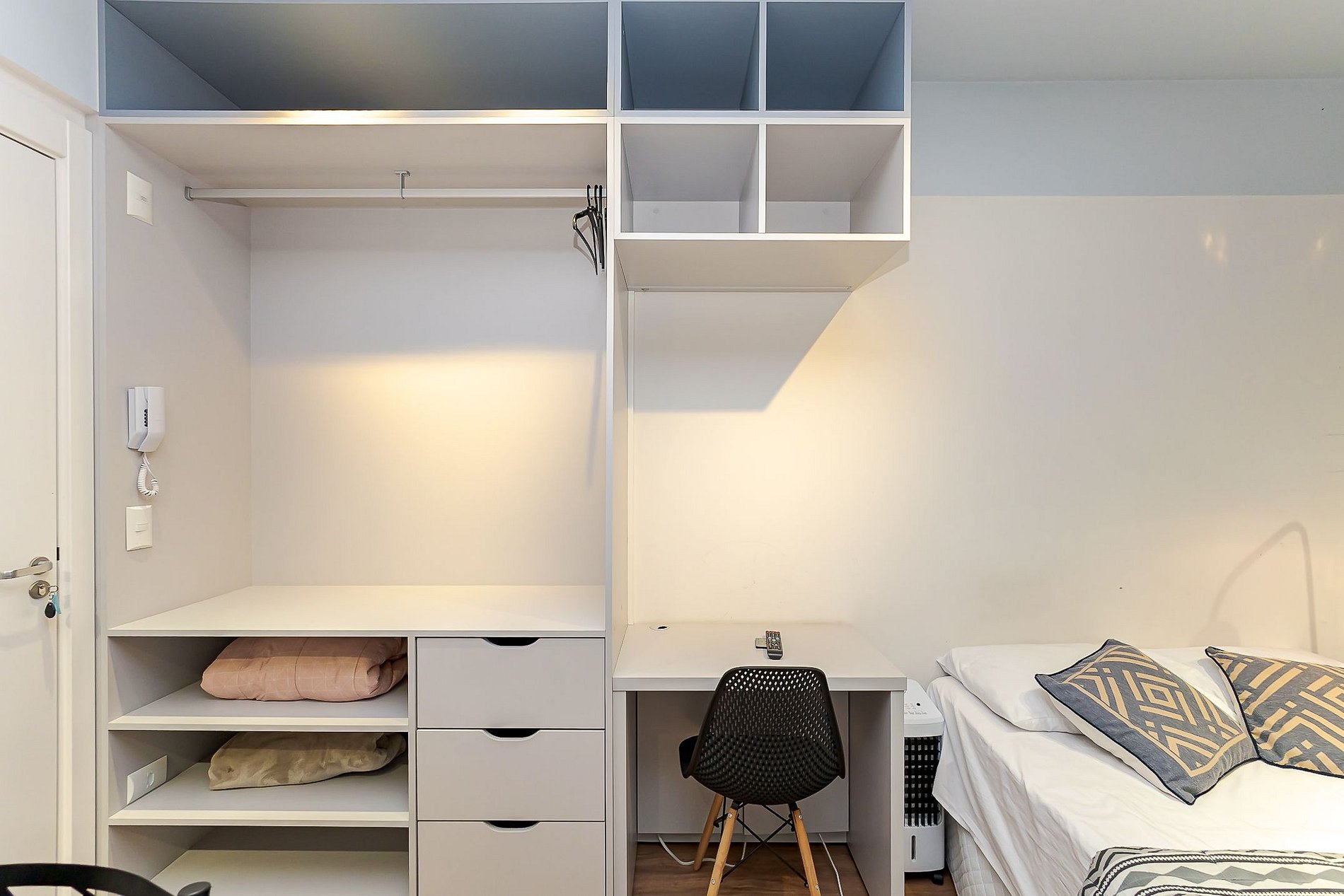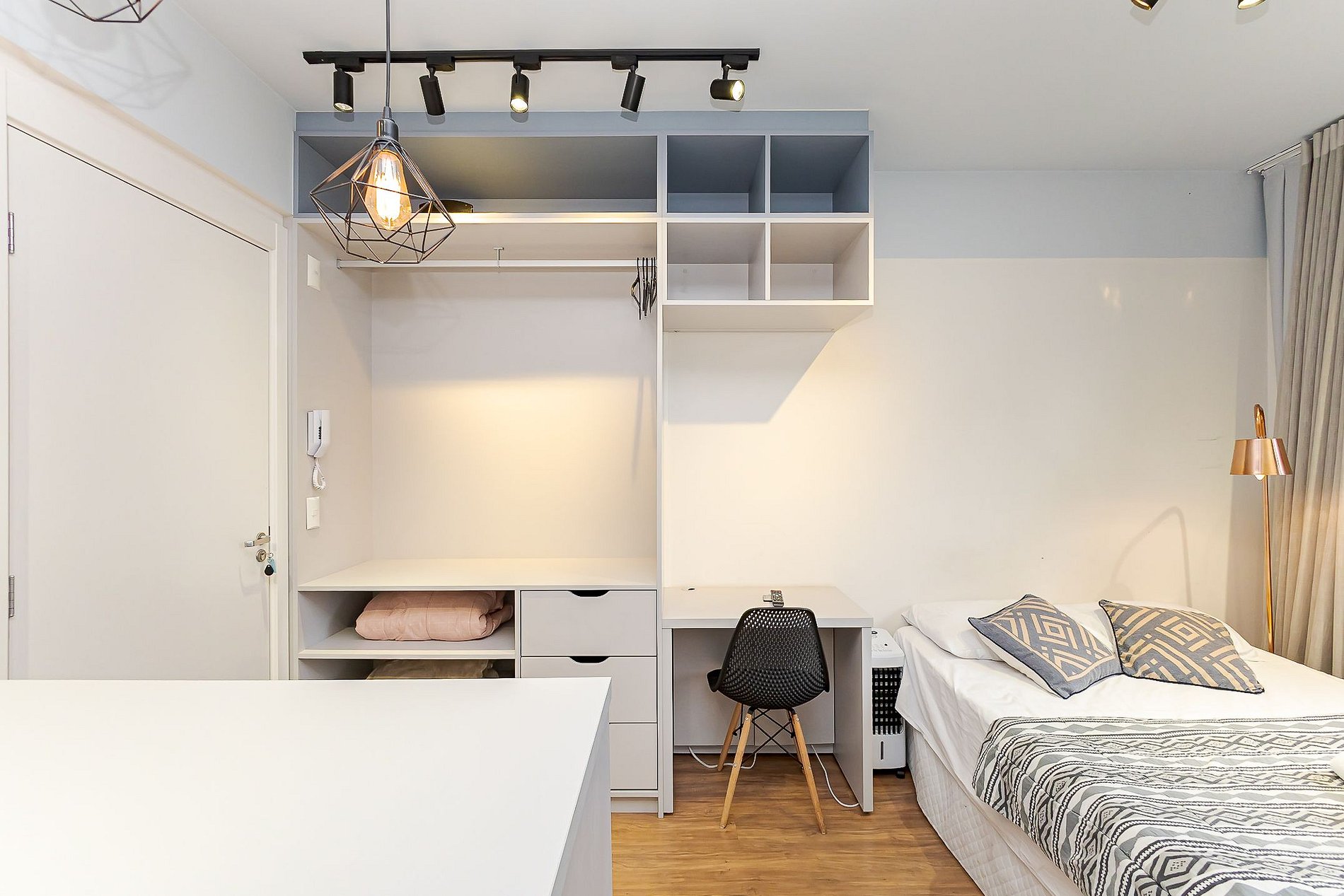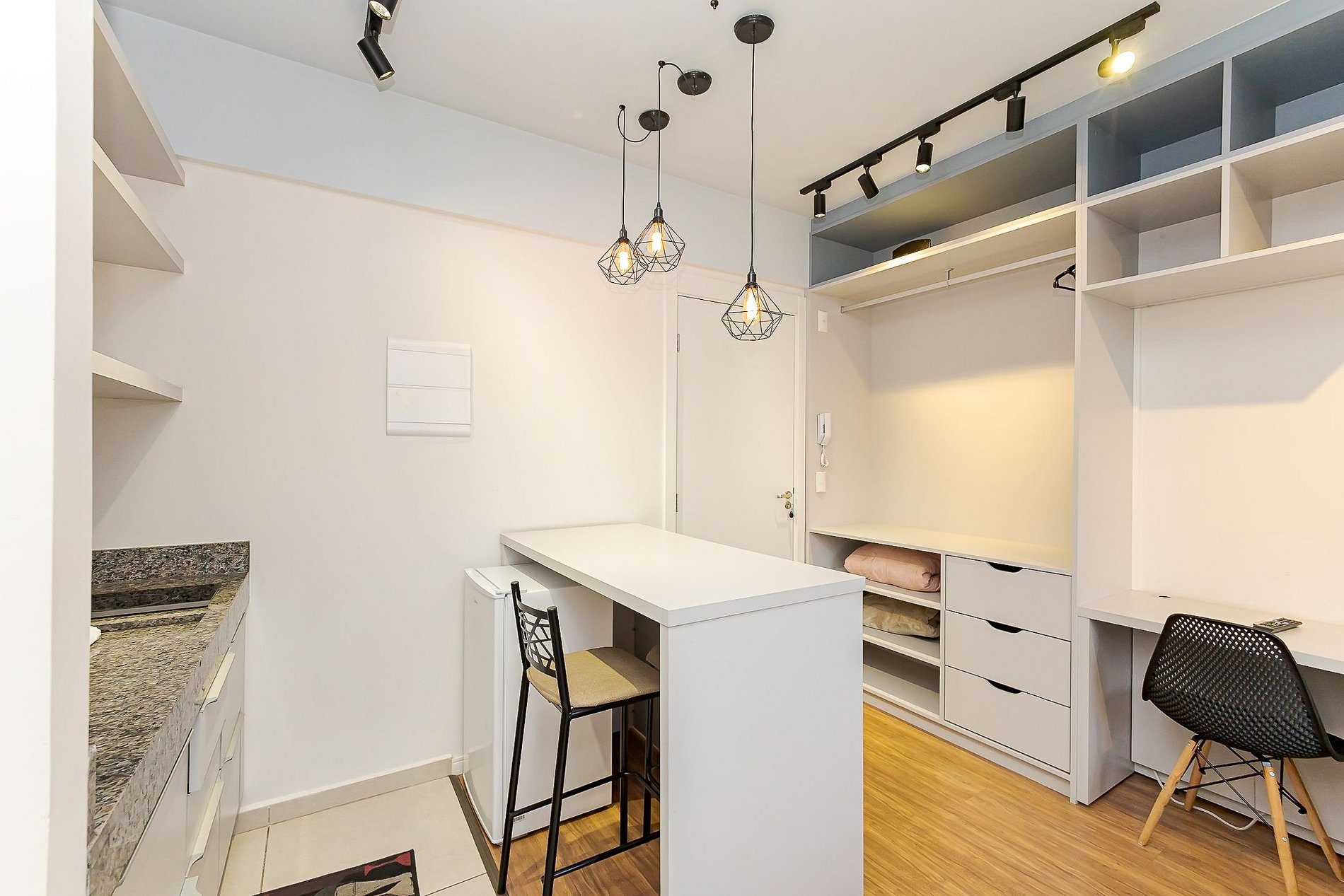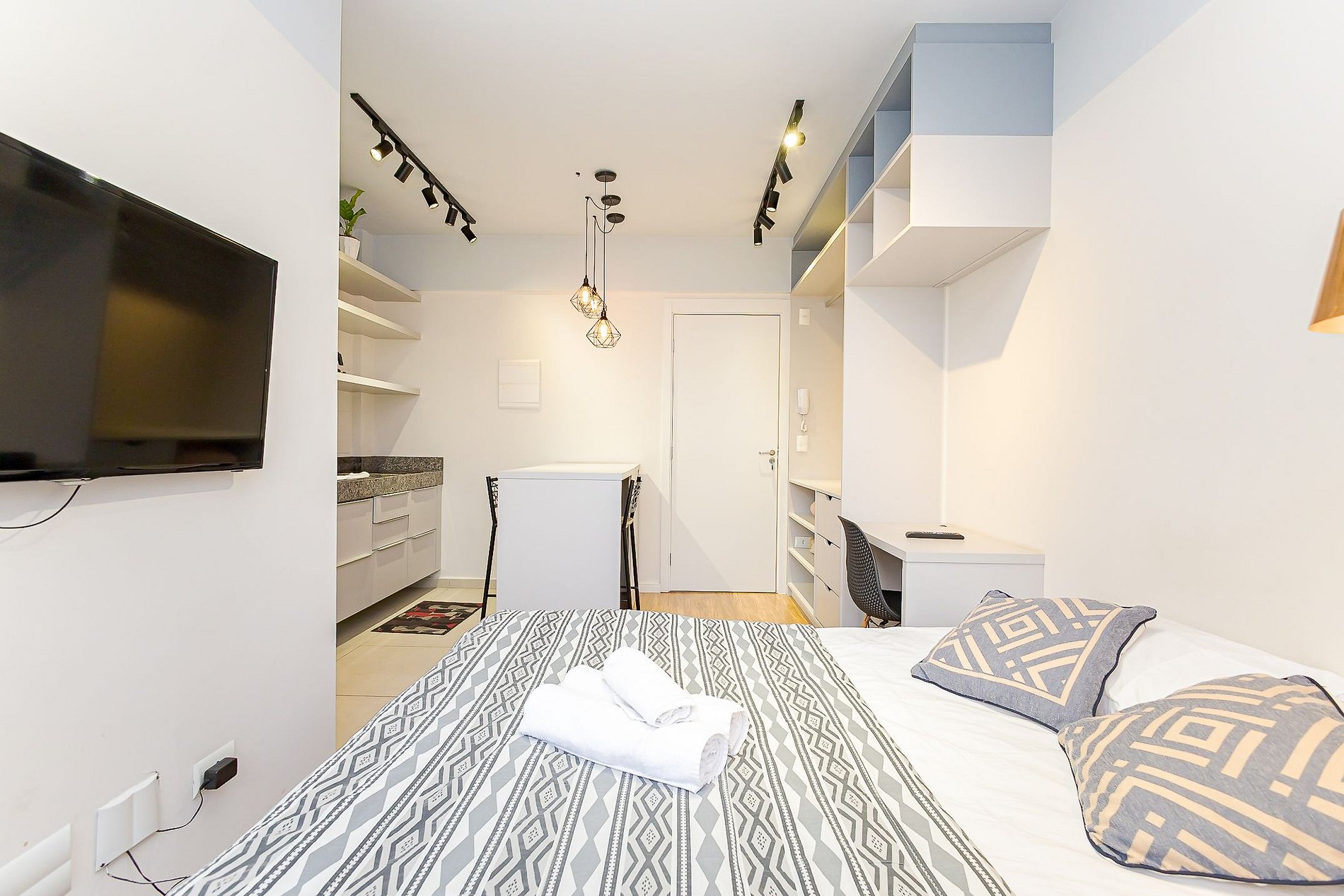 • Ambiente integrado: cama de casal, mesa com duas cadeiras para refeições, escrivaninha com cadeira para trabalho, TV Smart e armário aberto com cabides.