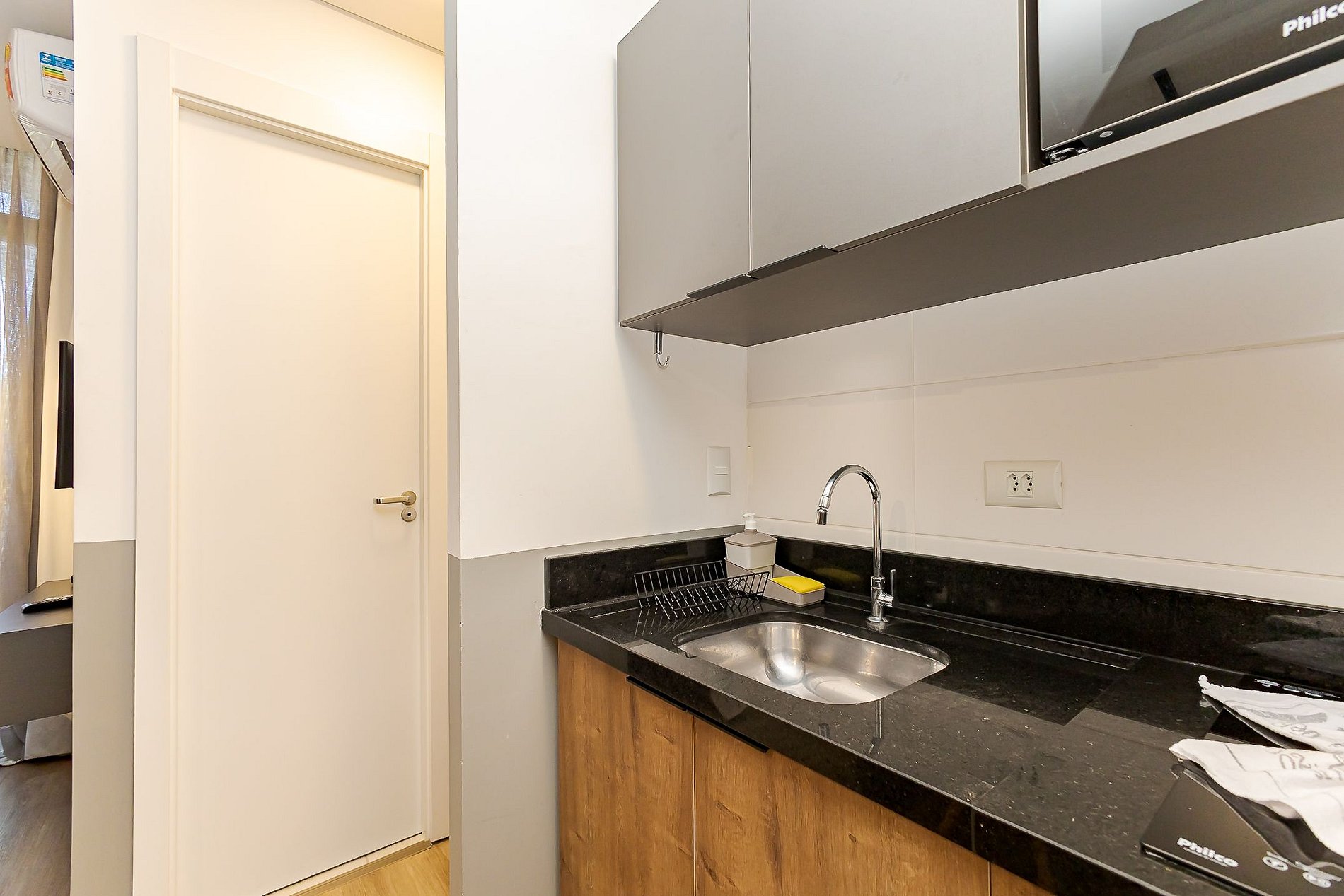 • Cozinha compacta: equipada com cooktop, micro-ondas, geladeira, chaleira elétrica, panelas, pratos, copos, talheres e utensílios básicos.