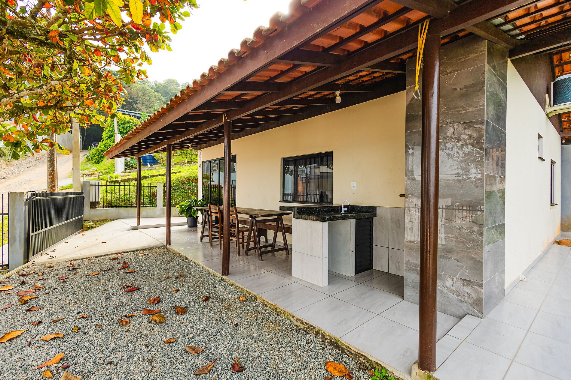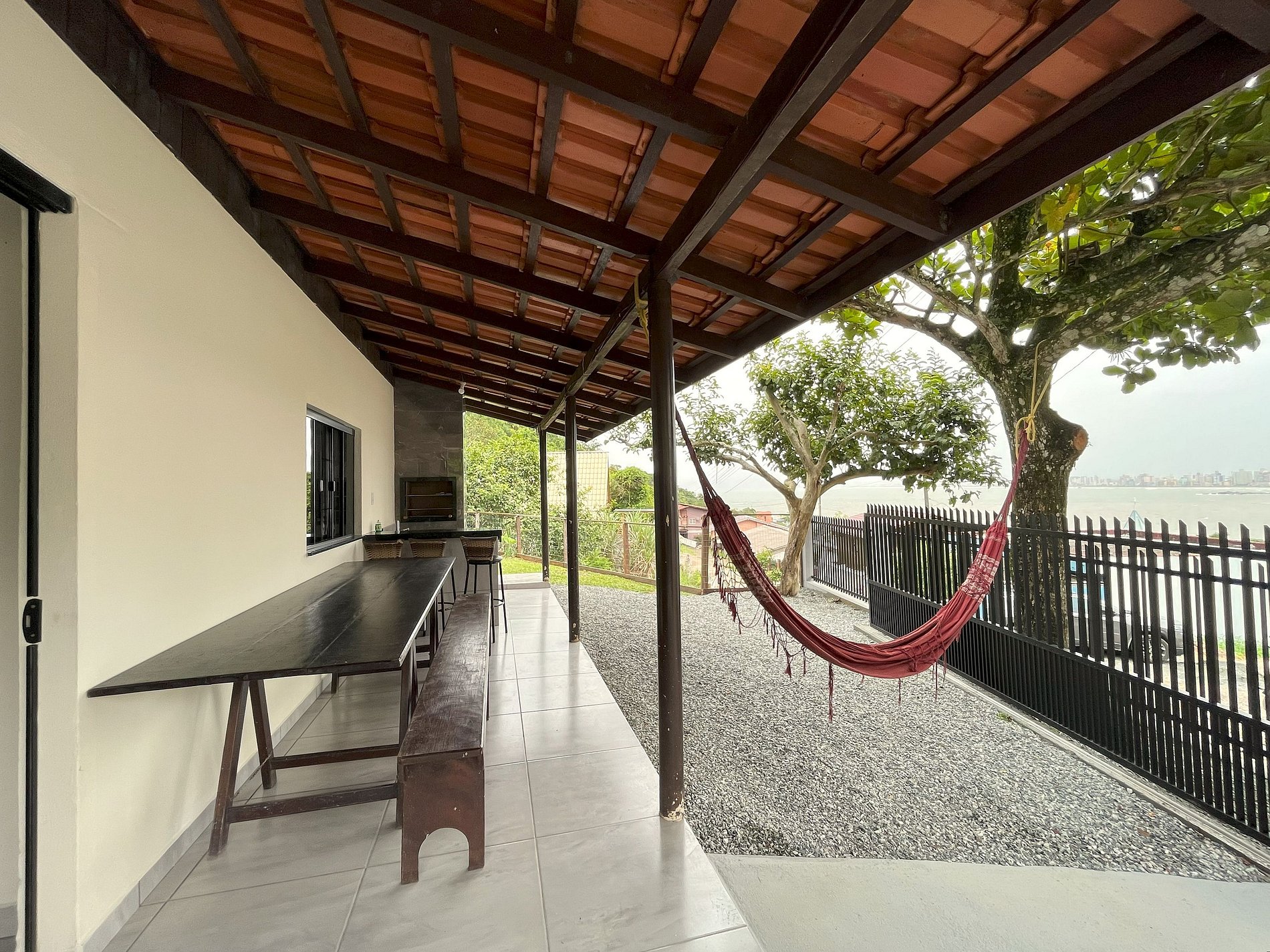 Um espaço ideal para relaxar e se divertir! Aproveite uma ampla churrasqueira e uma mesa confortável com uma linda vista para a praia.