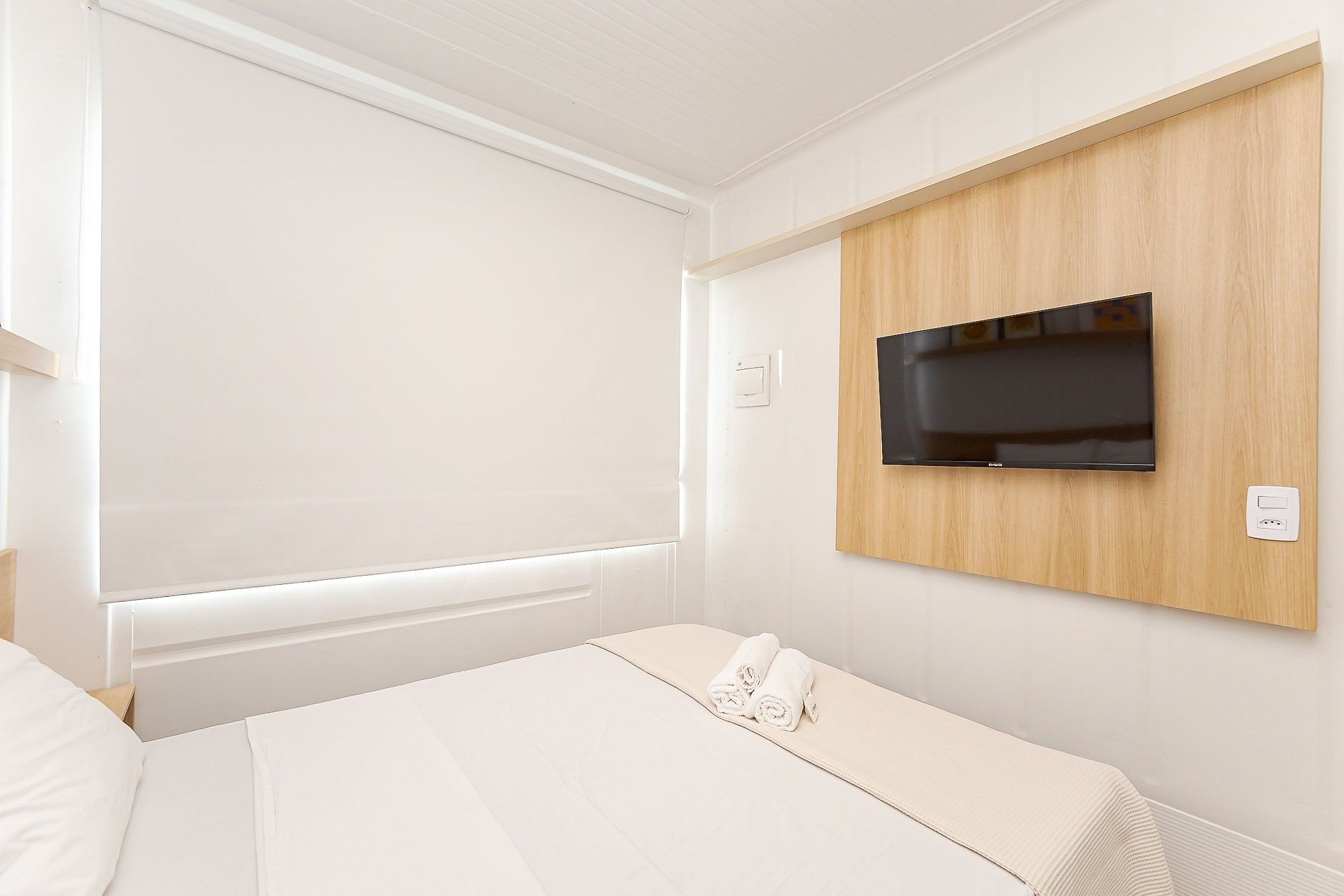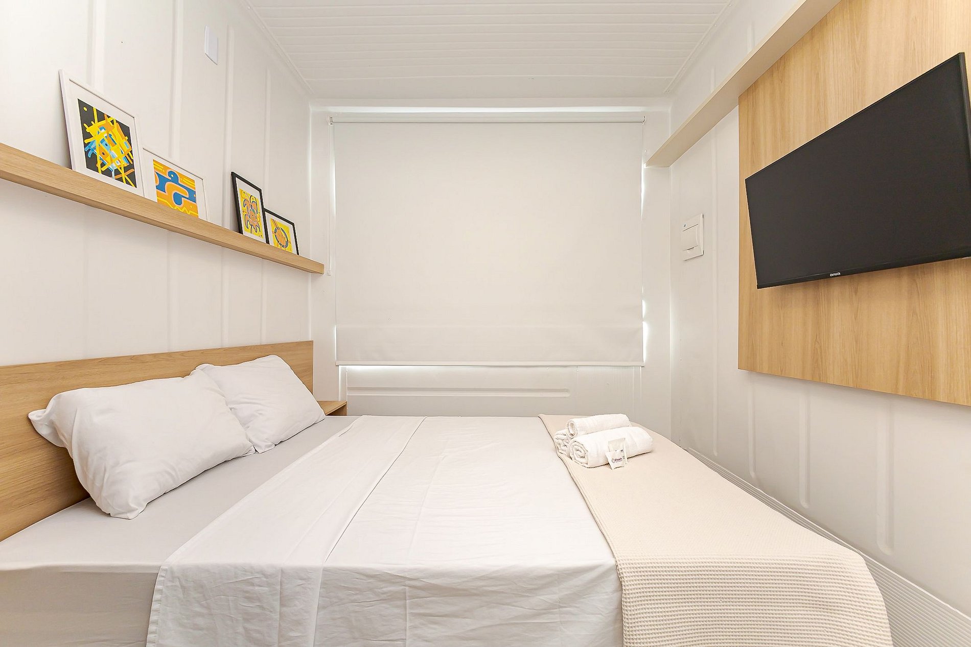 • Ambiente integrado: cama de casal, TV Smart, persiana de rolo, ventilador, tomadas ao lado da cama e vista para o jardim.