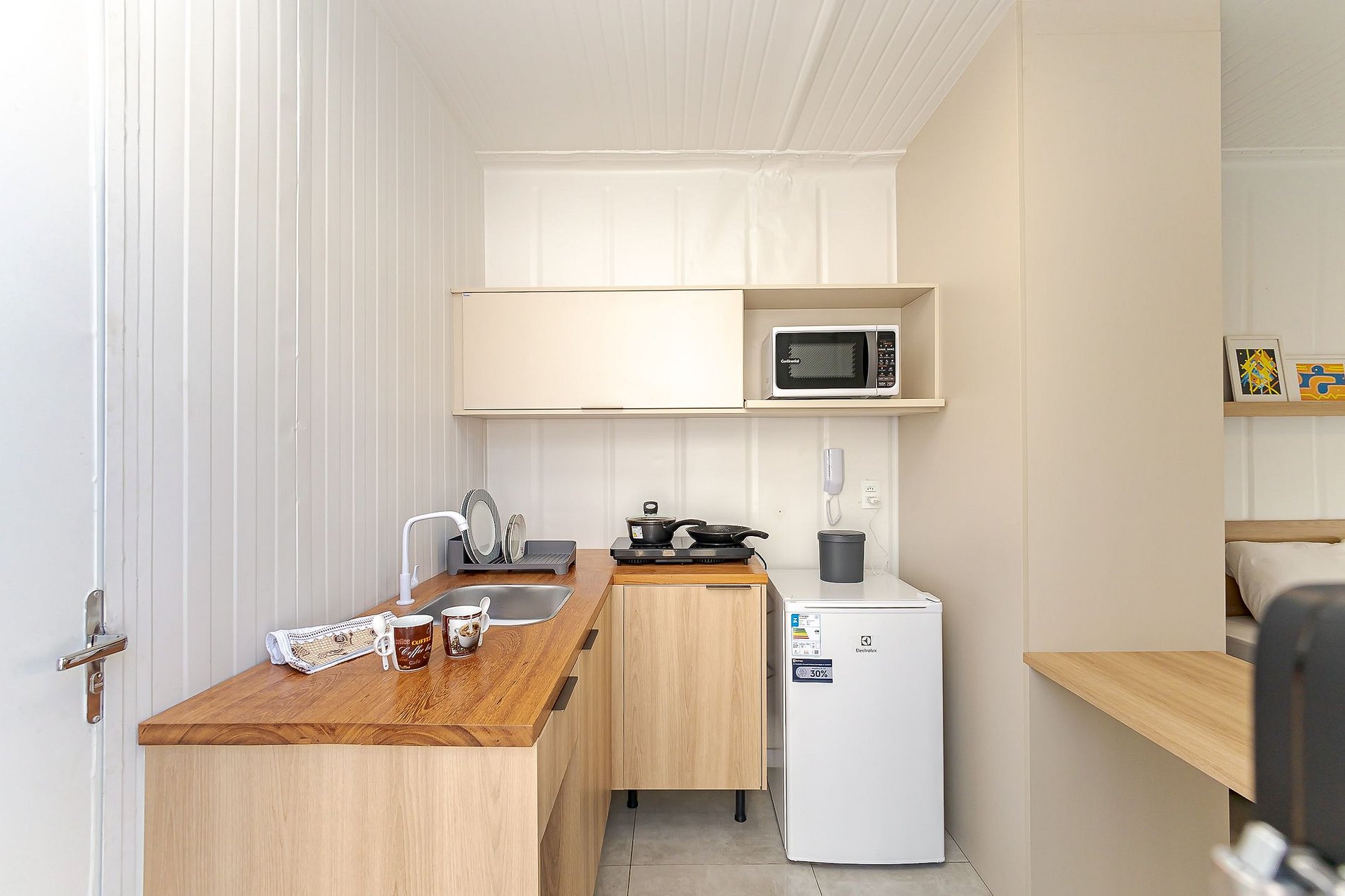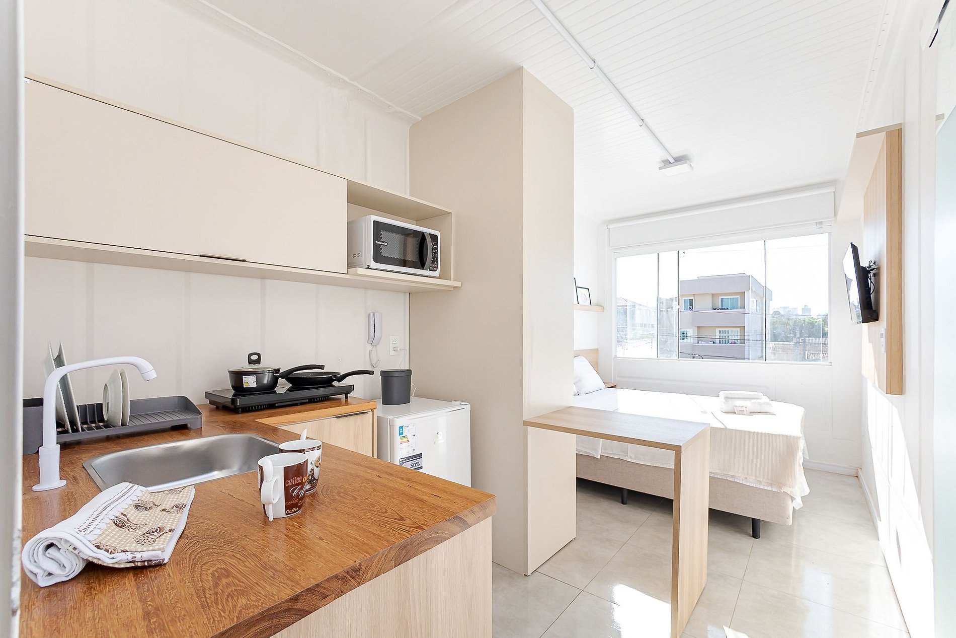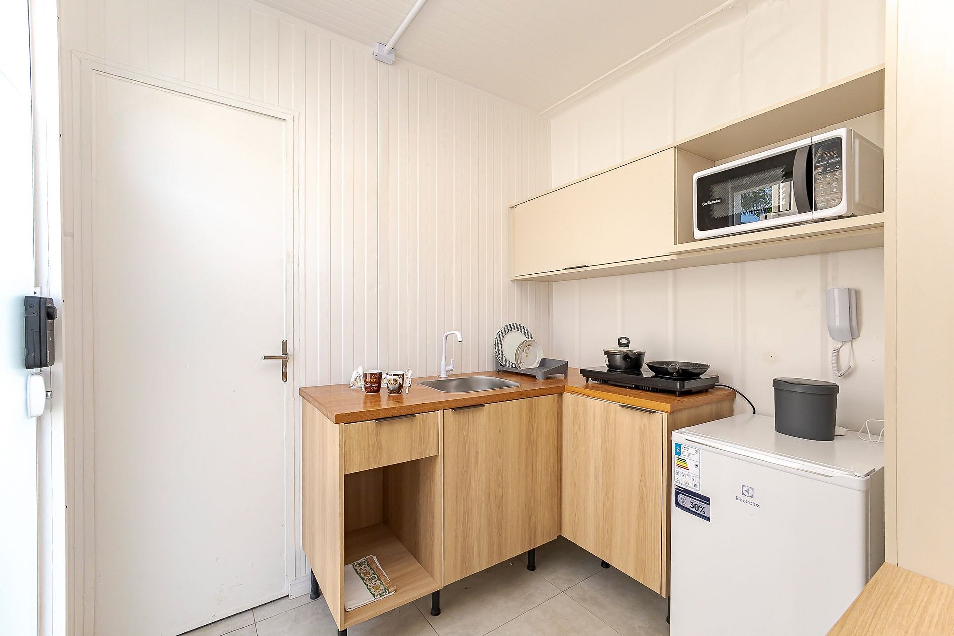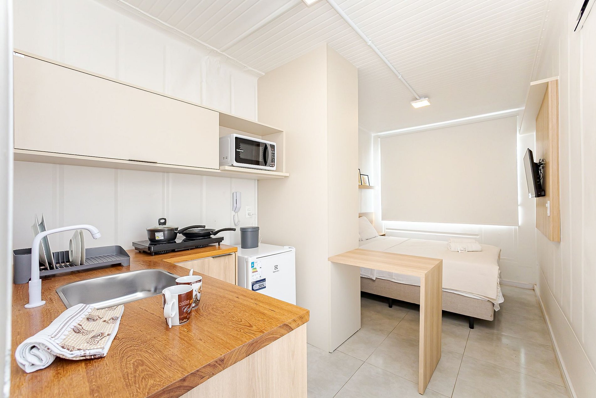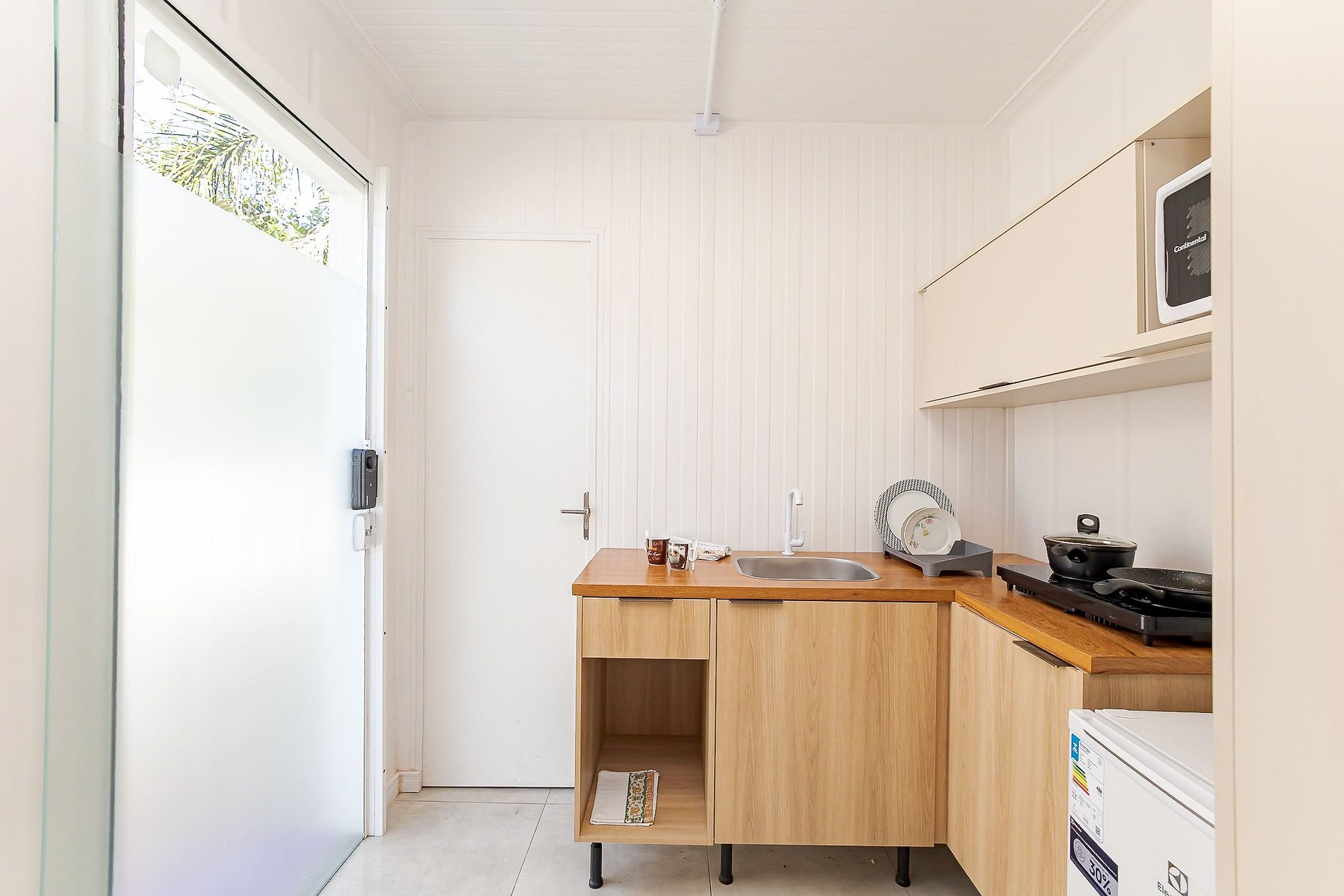 • Cozinha compacta: frigobar, cooktop, micro-ondas, panelas, pratos, copos e utensílios básicos.