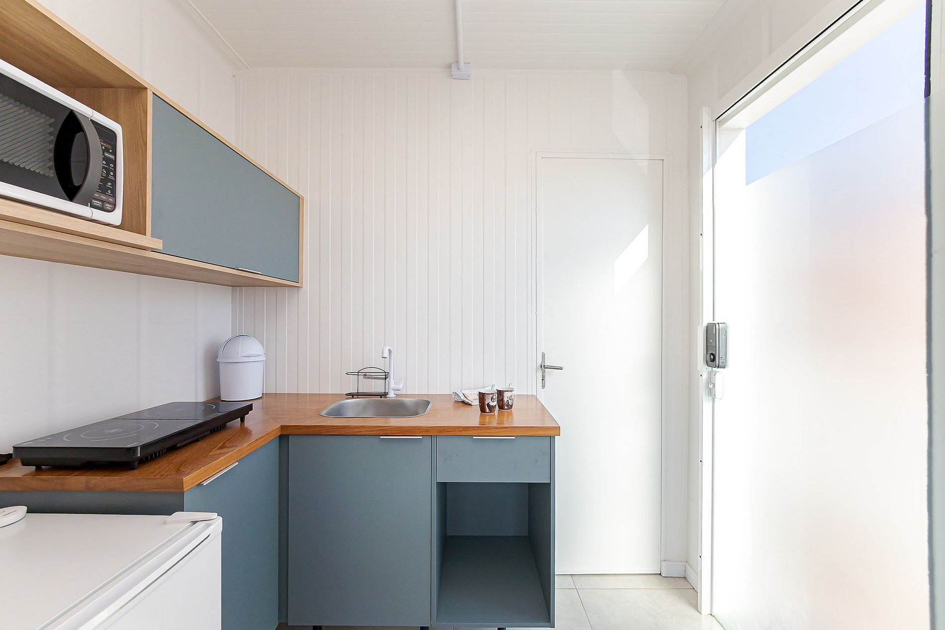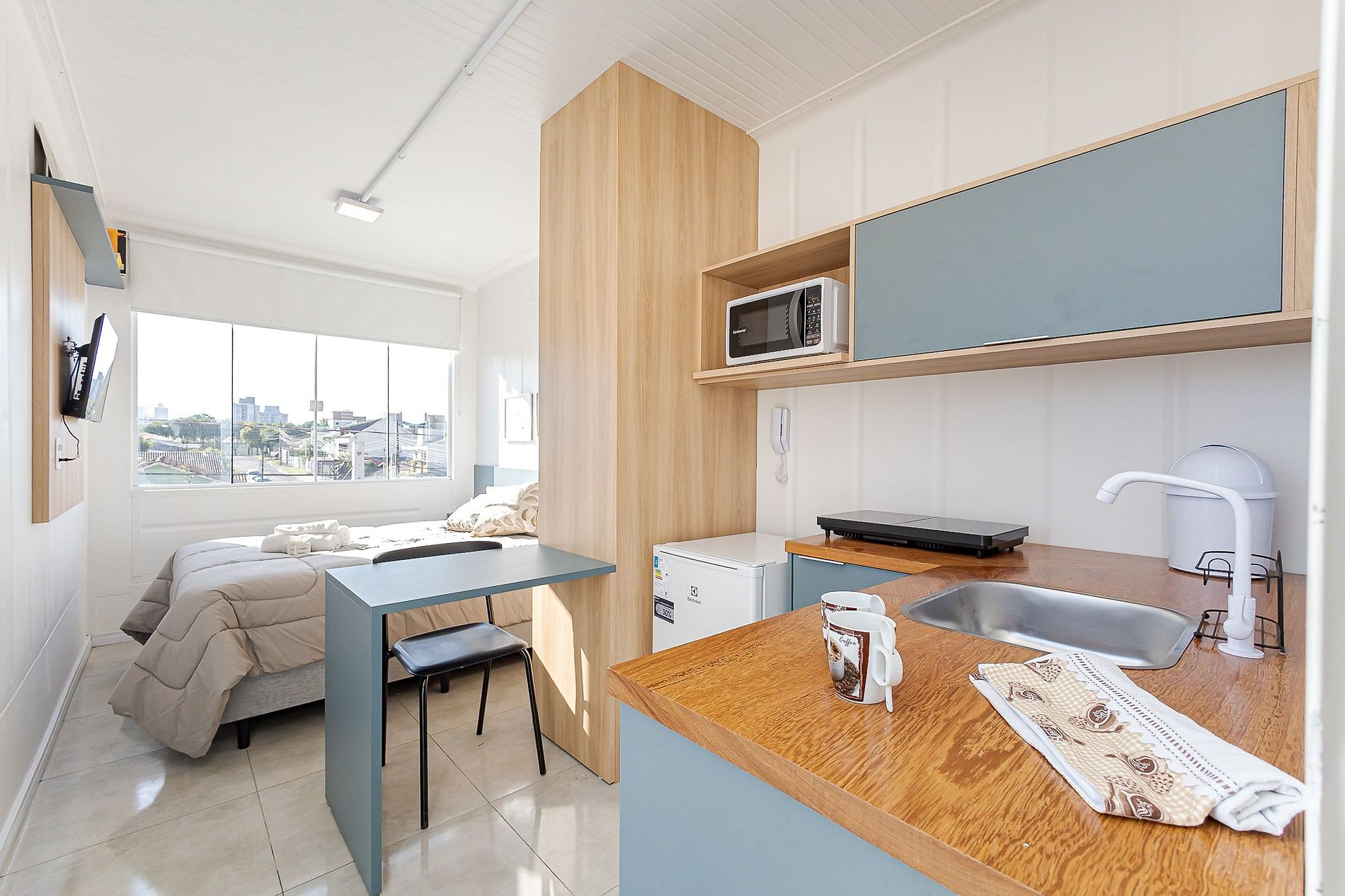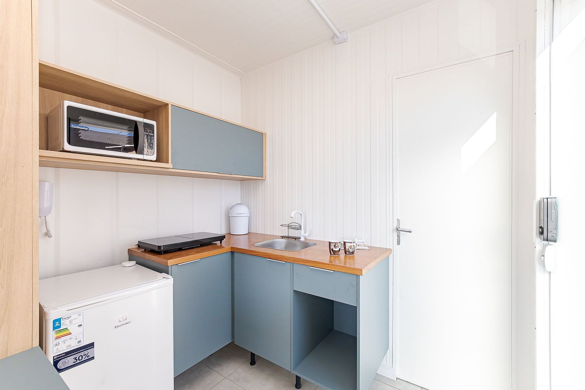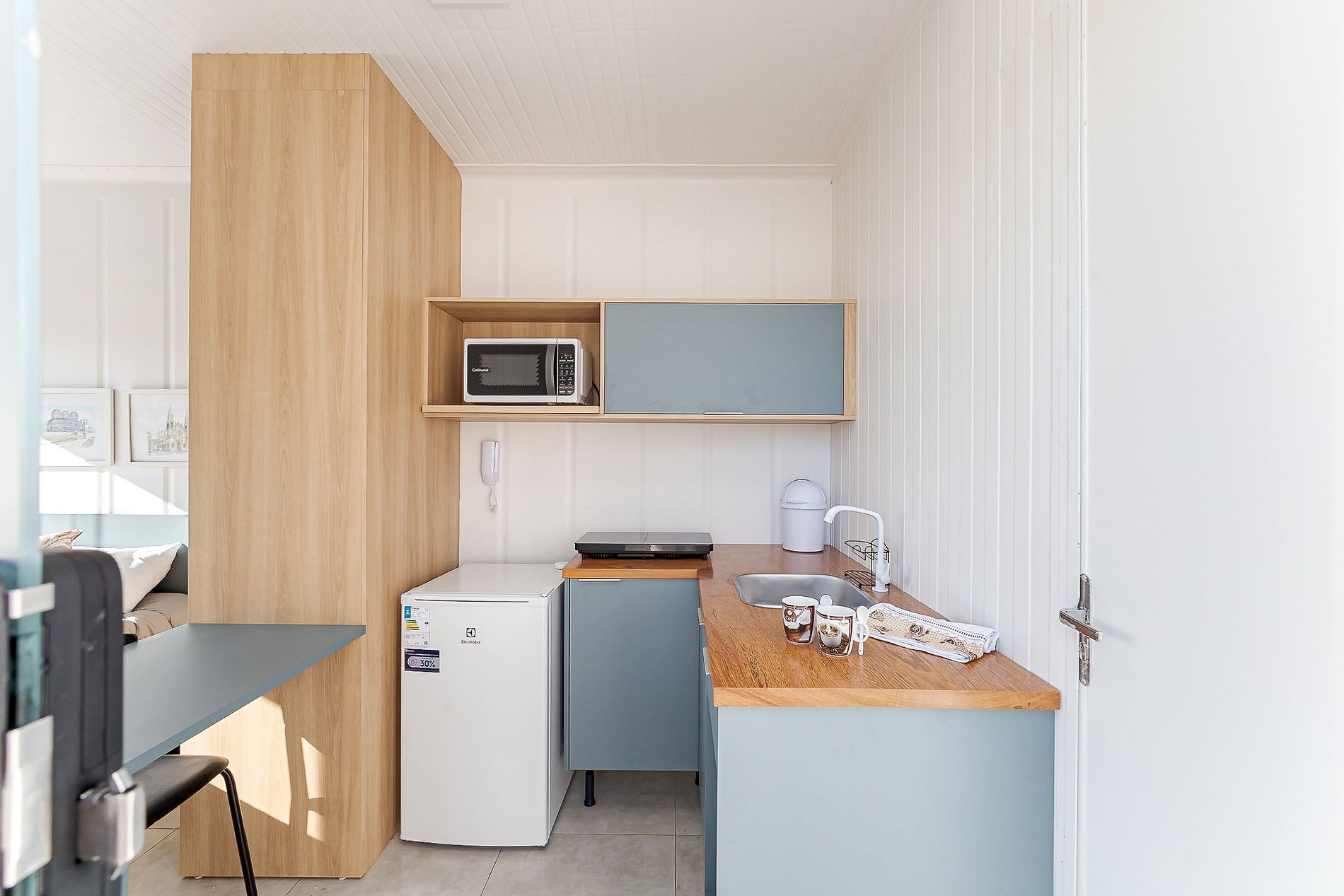 • Cozinha compacta: frigobar, cooktop, micro-ondas, panelas, pratos, copos e utensílios básicos.
