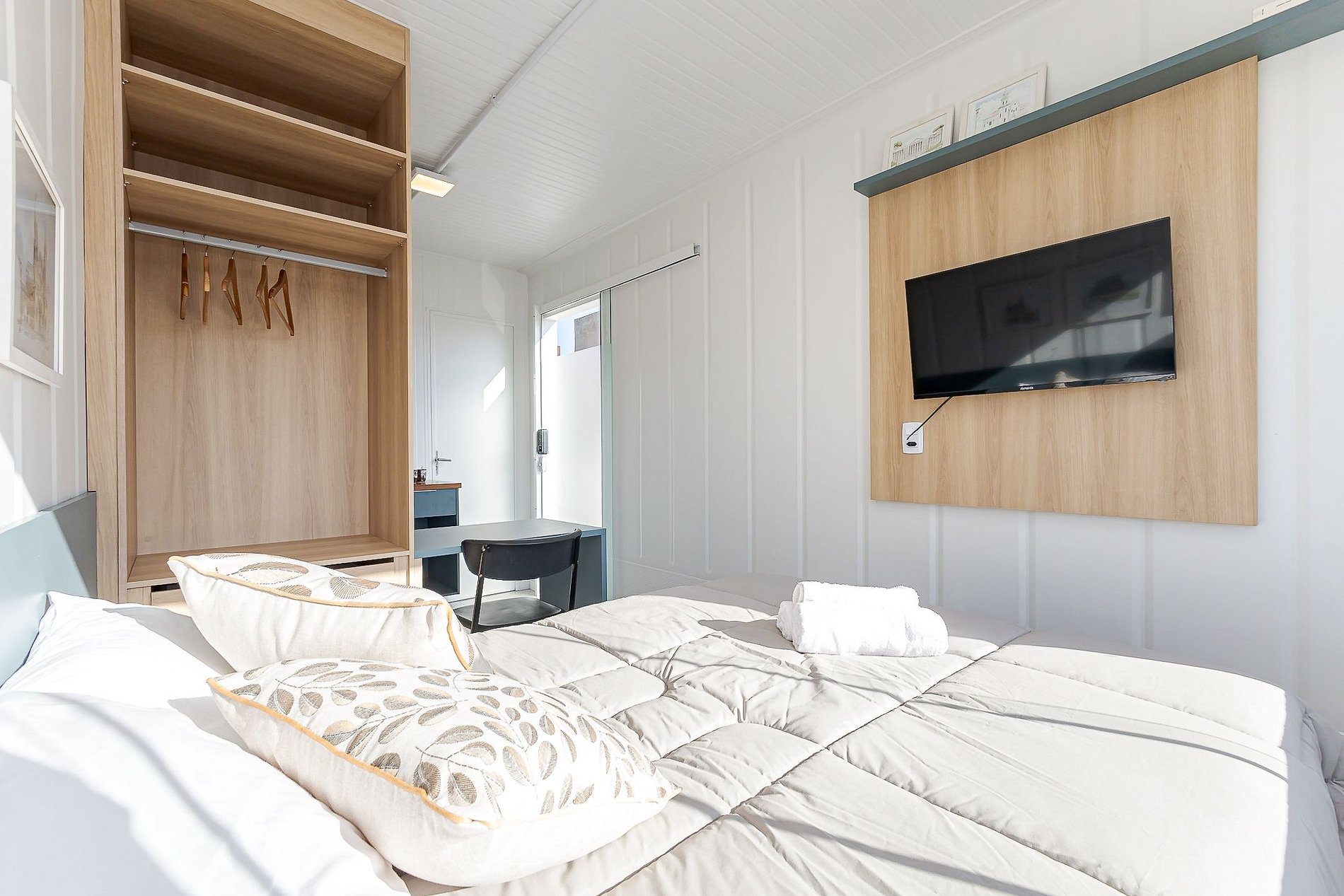 • Ambiente integrado: cama de casal, TV Smart, persiana de rolo, ventilador, tomadas ao lado da cama e vista para o jardim.