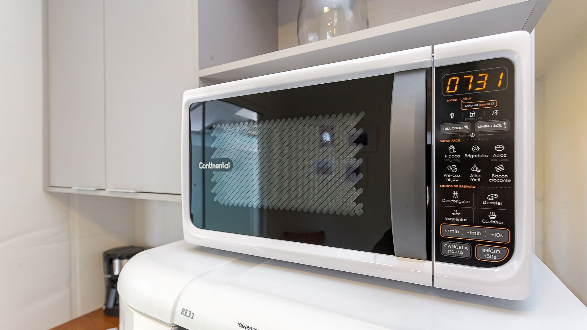 • Cozinha integrada à sala: equipada com geladeira, micro-ondas, cafeteira, pratos, copos, talheres e utensílios. O ambiente conta com um banco em “L” de madeira com almofadas e mesa para refeições.
