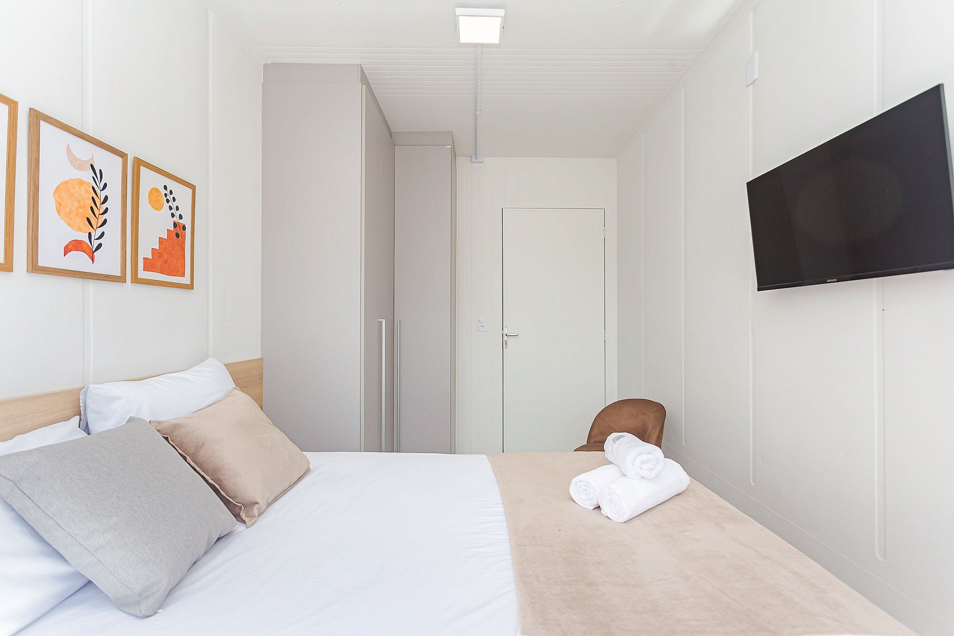 • Quarto 1: cama de casal com cabeceira, poltrona, TV Smart, armário e persiana de rolo blackout.