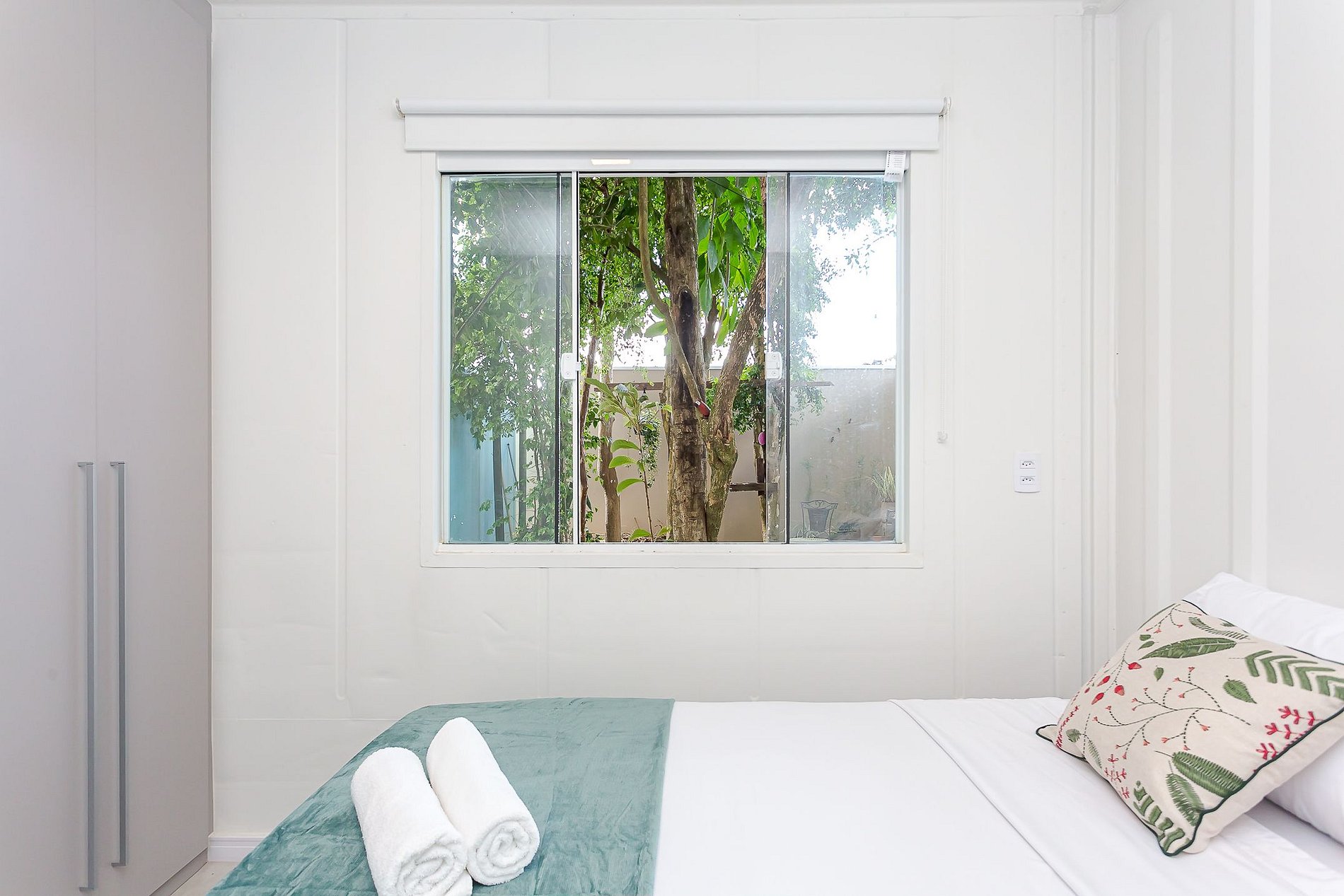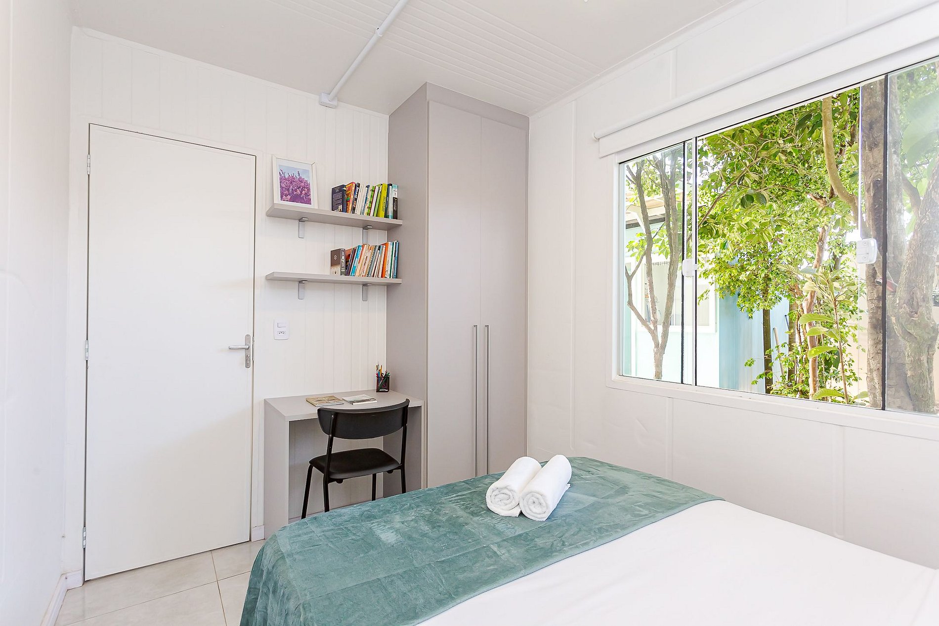 • Quarto 2: cama de casal, arara para roupas, cabideiro de chão, escrivaninha com cadeira e persiana de rolo blackout com vista para o jardim.