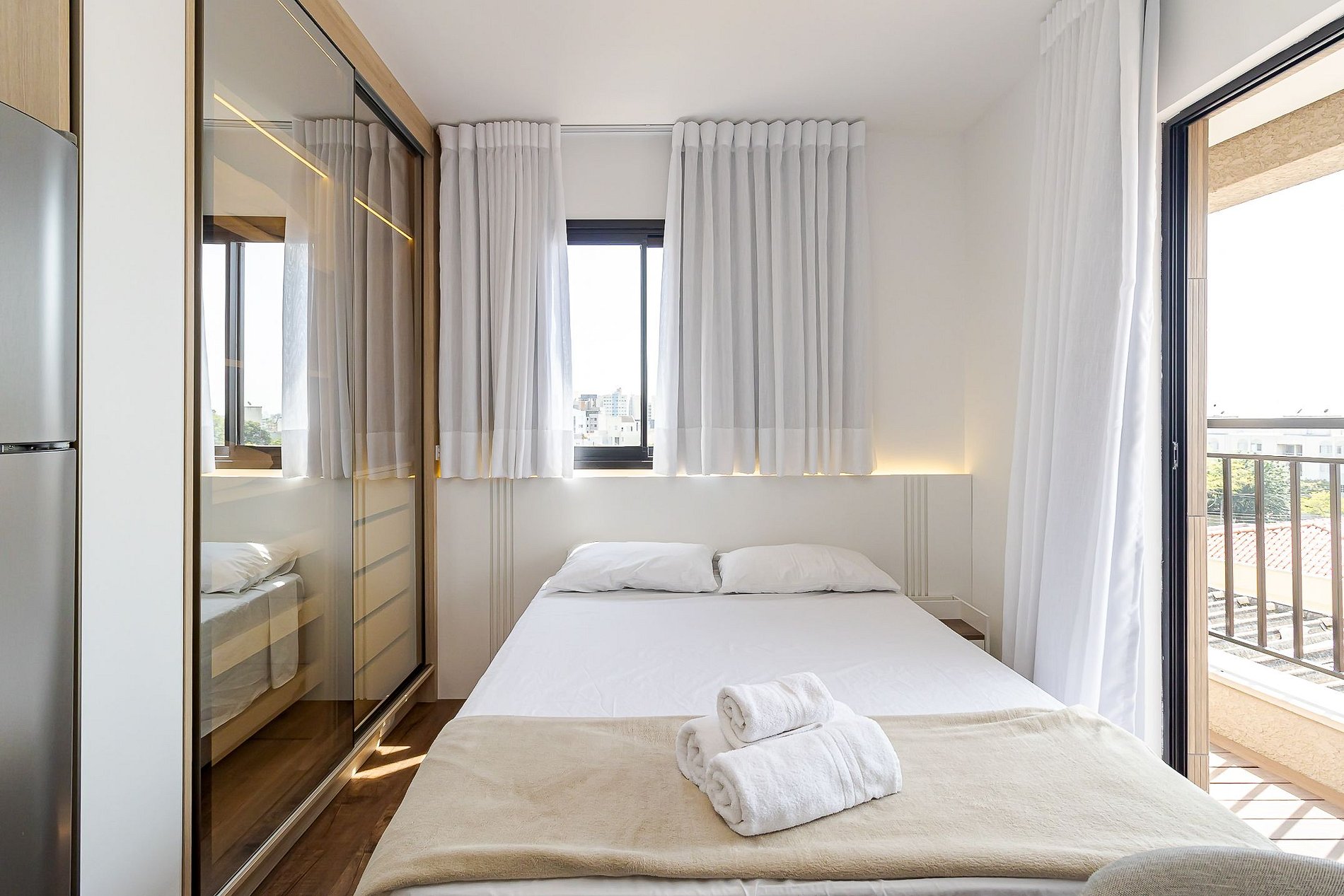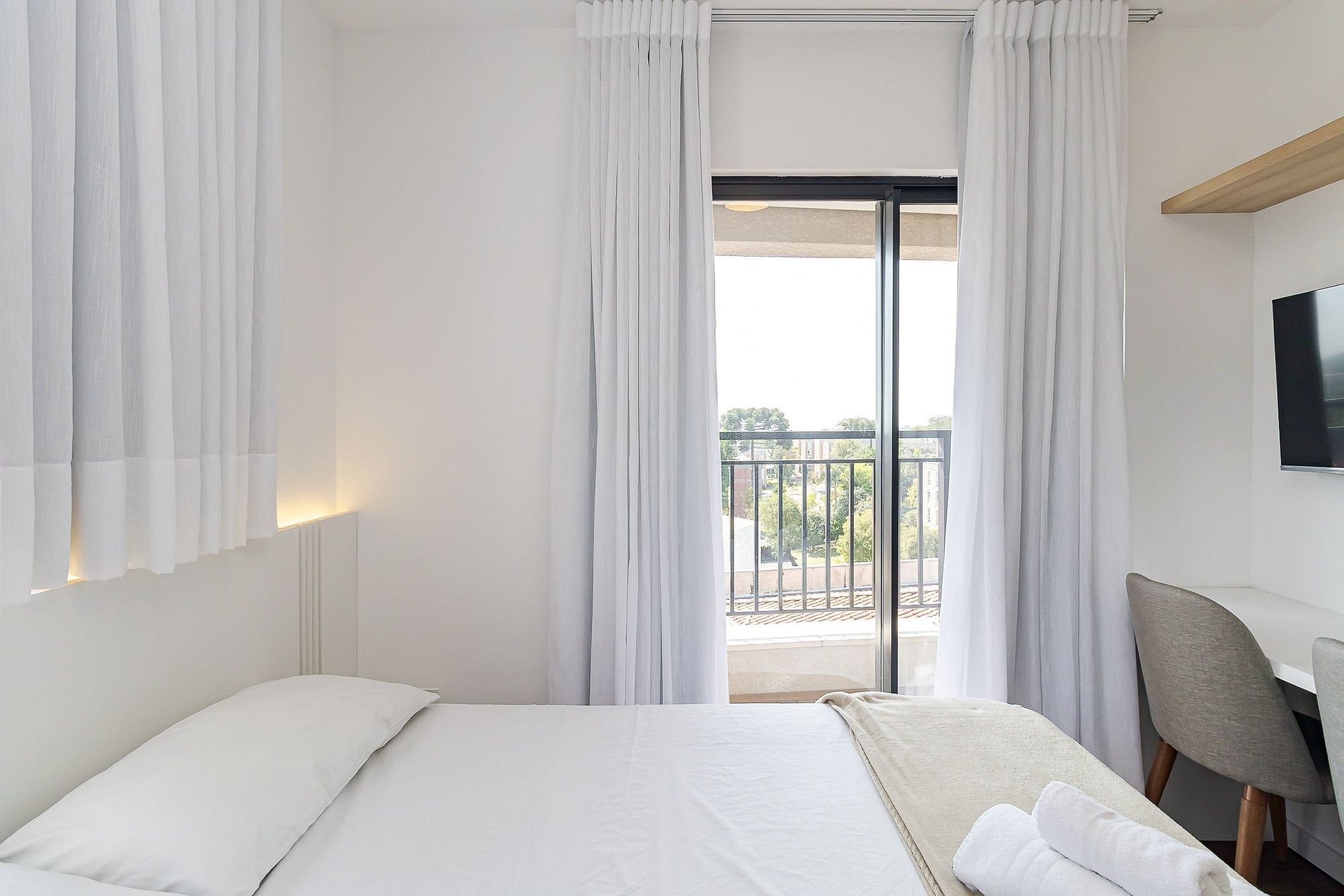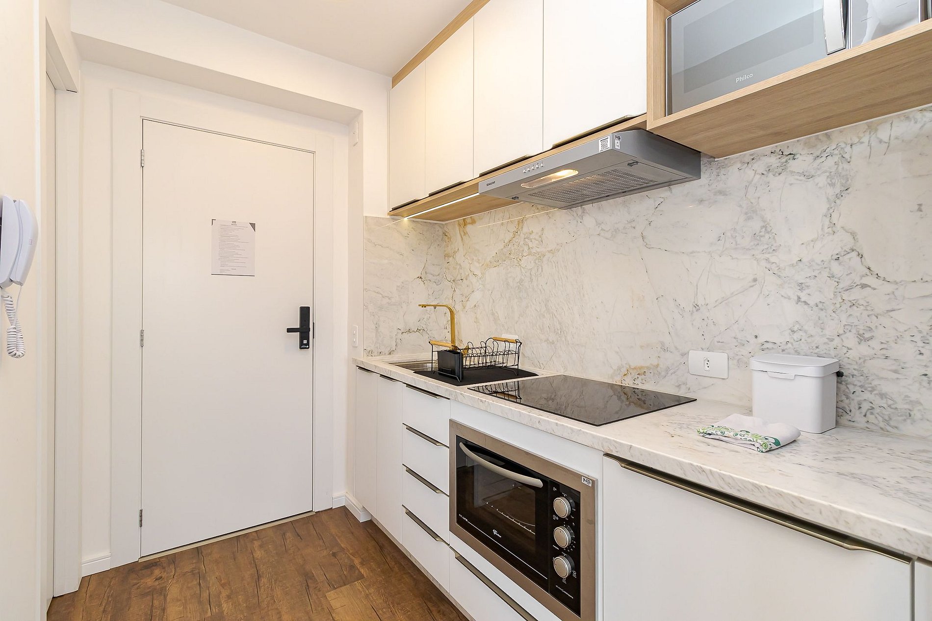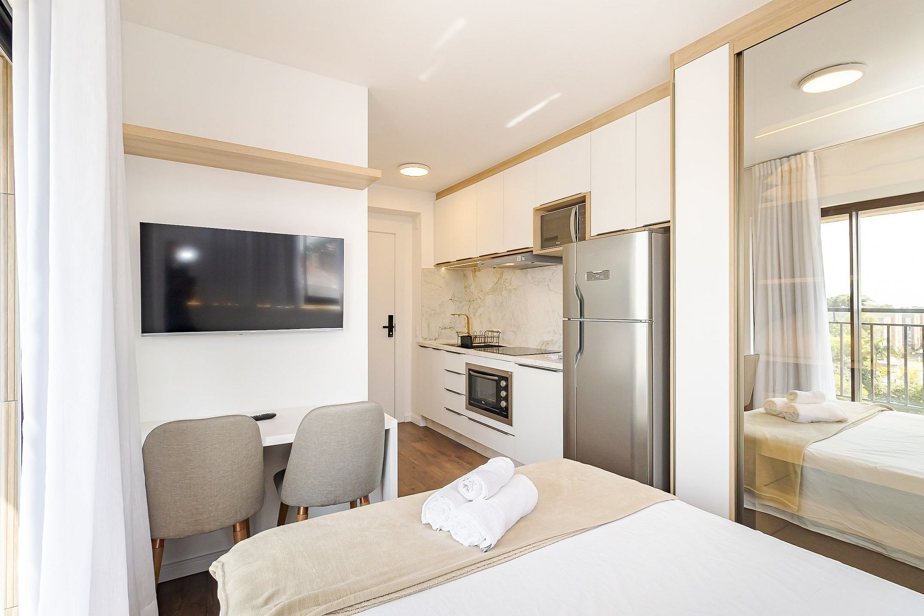 Com 18 m², acomoda até 2 hóspedes em um ambiente funcional e elegante, com cama de casal, cozinha totalmente equipada, mesa para refeições ou home office e varanda ampla com vista para a cidade.