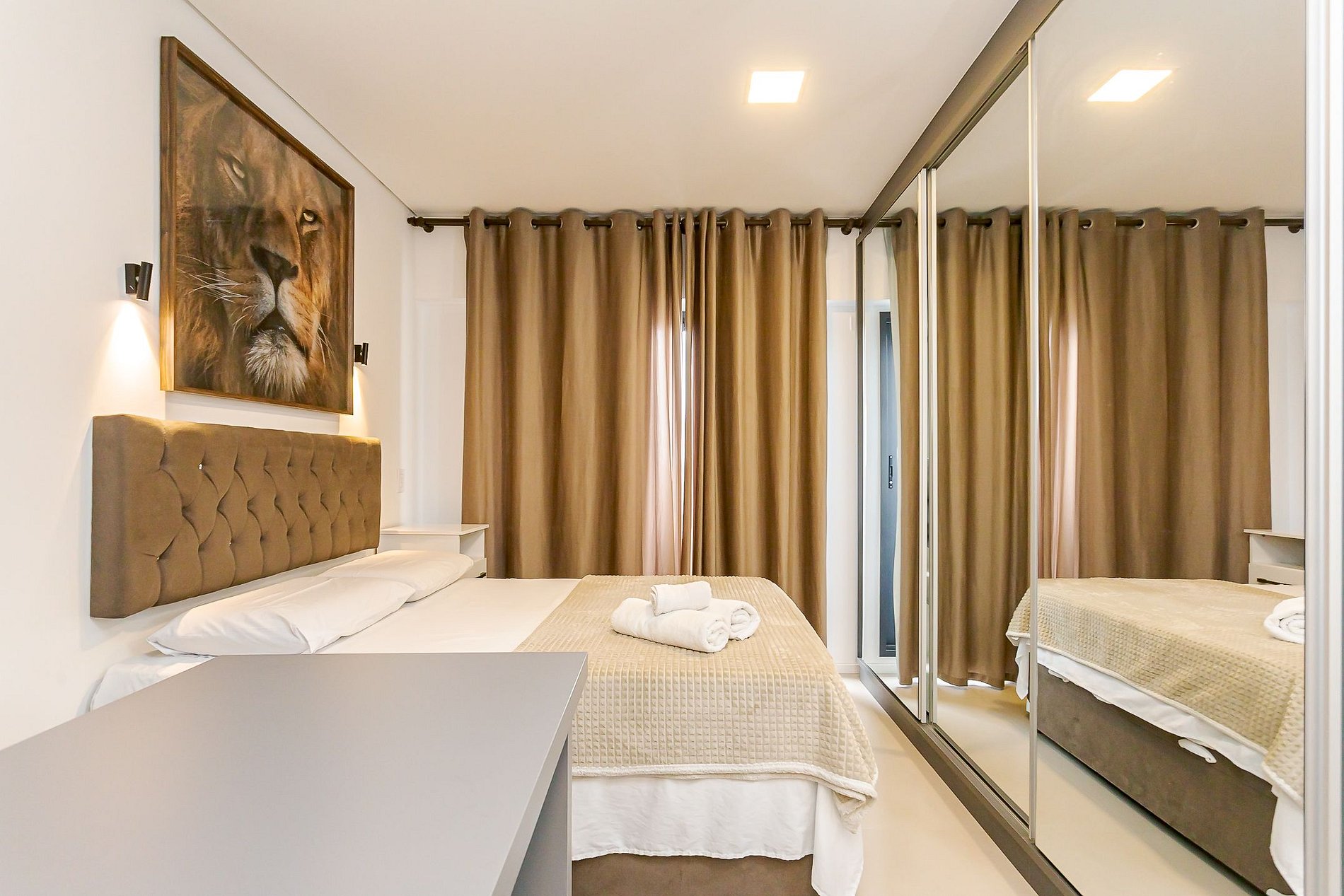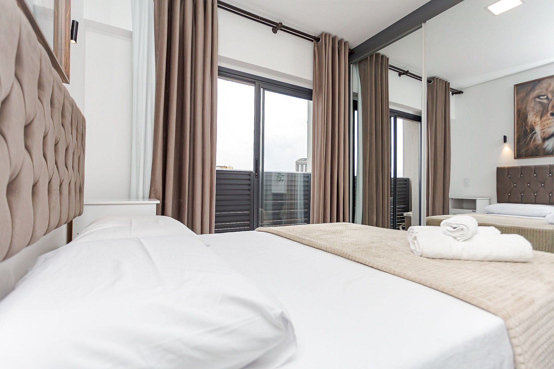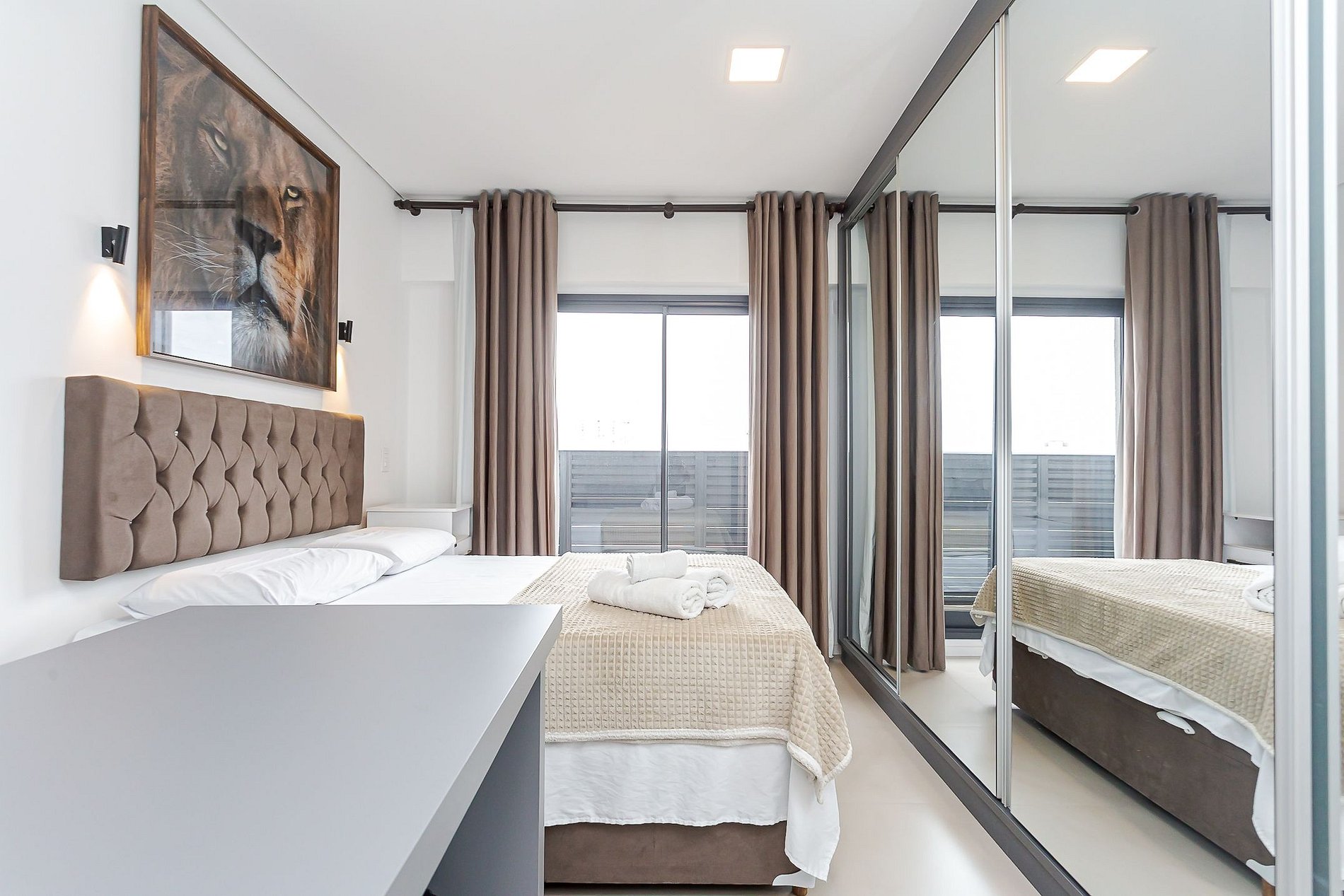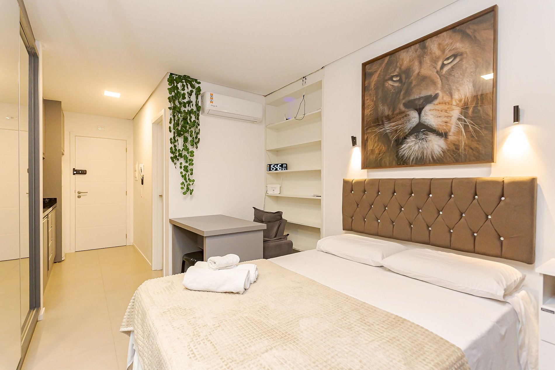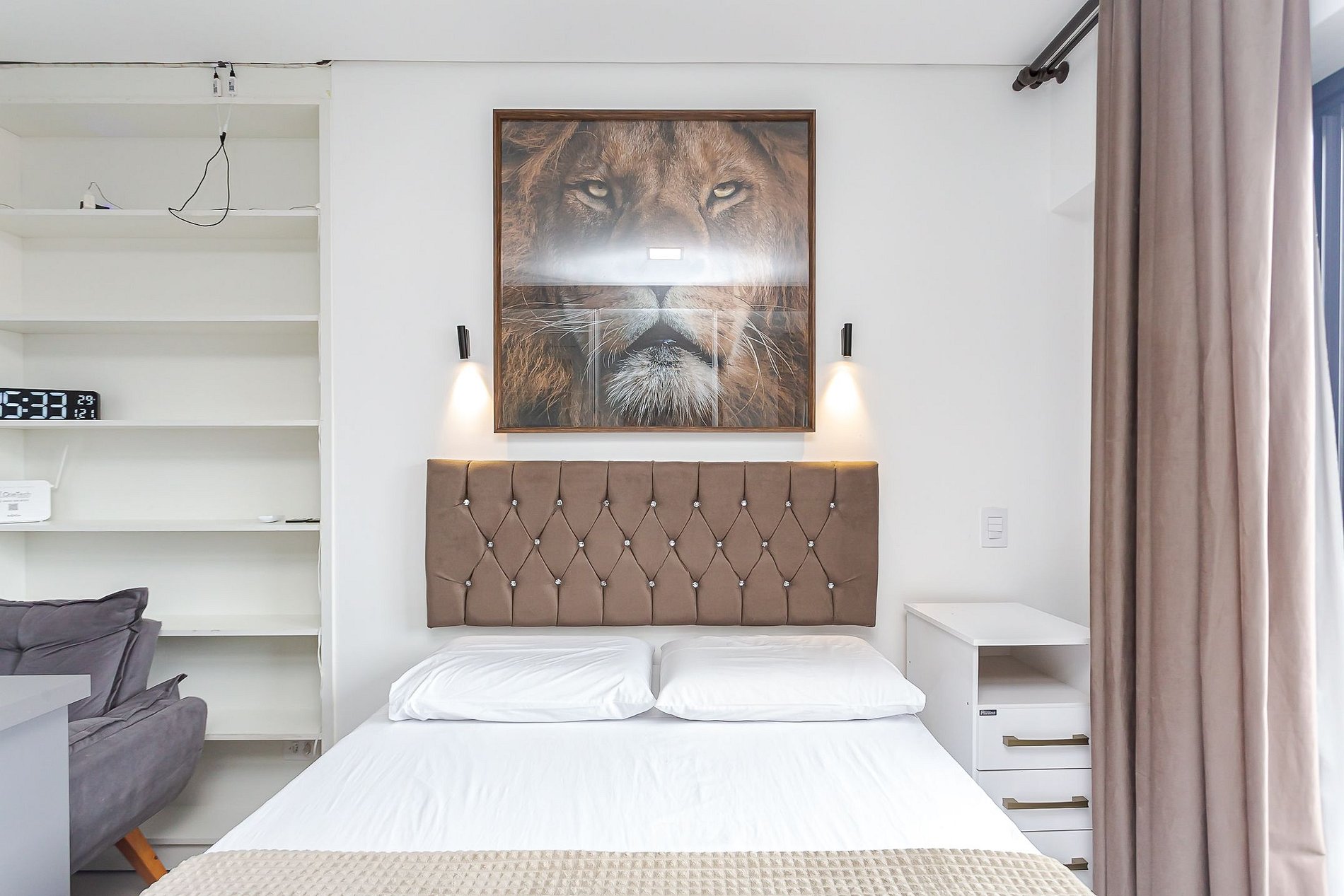 • Ambiente integrado: cama de casal com cabeceira, mesa de apoio, tomadas ao lado da cama, TV Smart, ar-condicionado split, armários com cabides e cortina blackout que dá privacidade à porta de vidro da varanda.