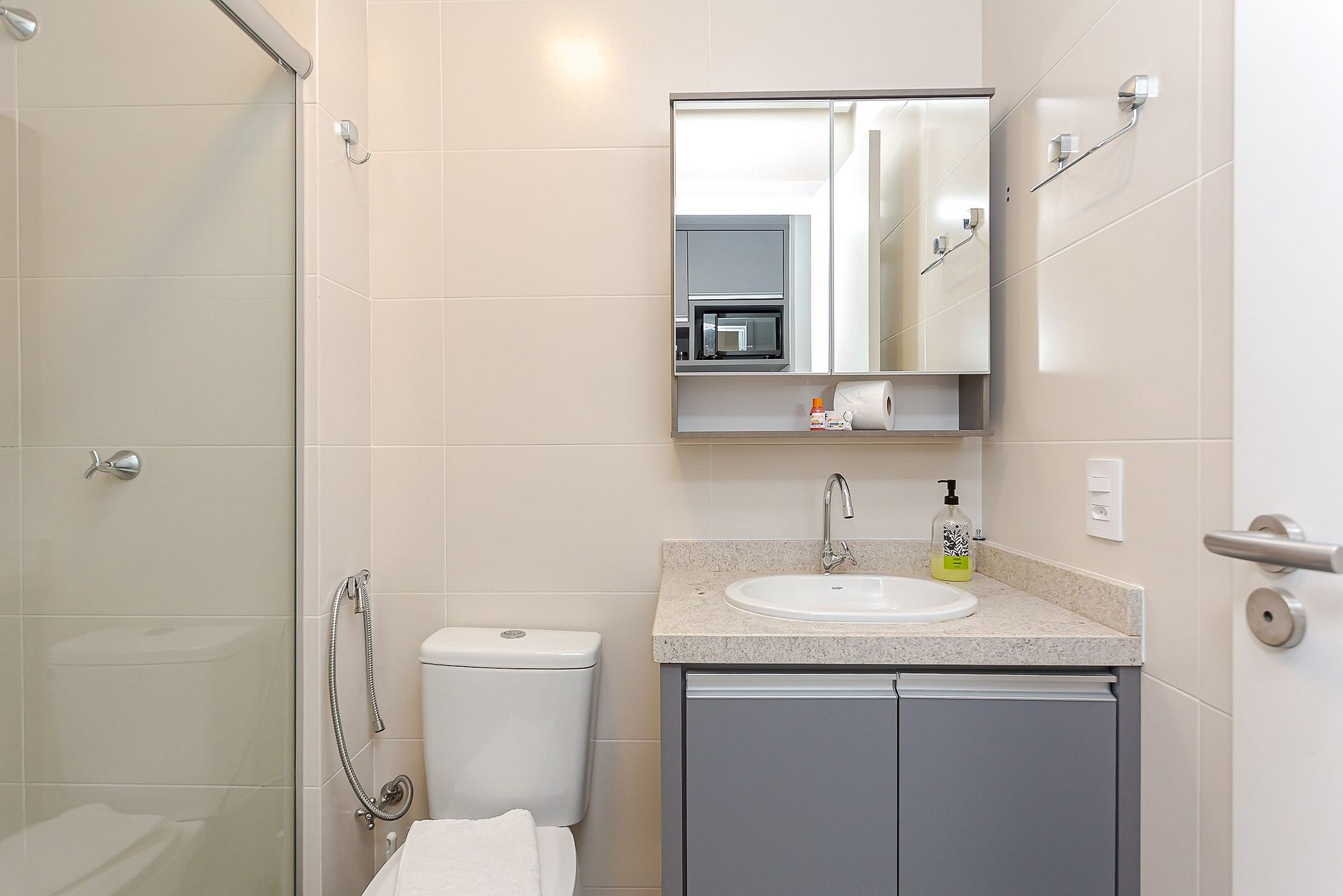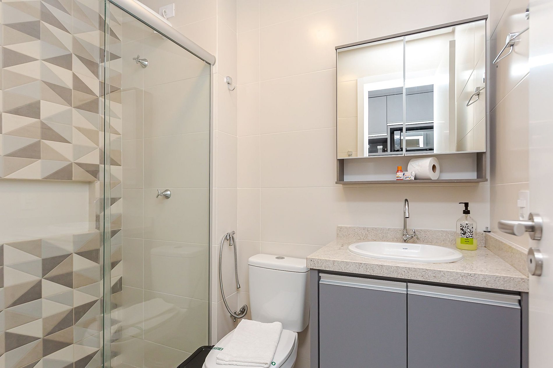 • Banheiro: completo, com box de vidro, chuveiro com água quente e espelho.