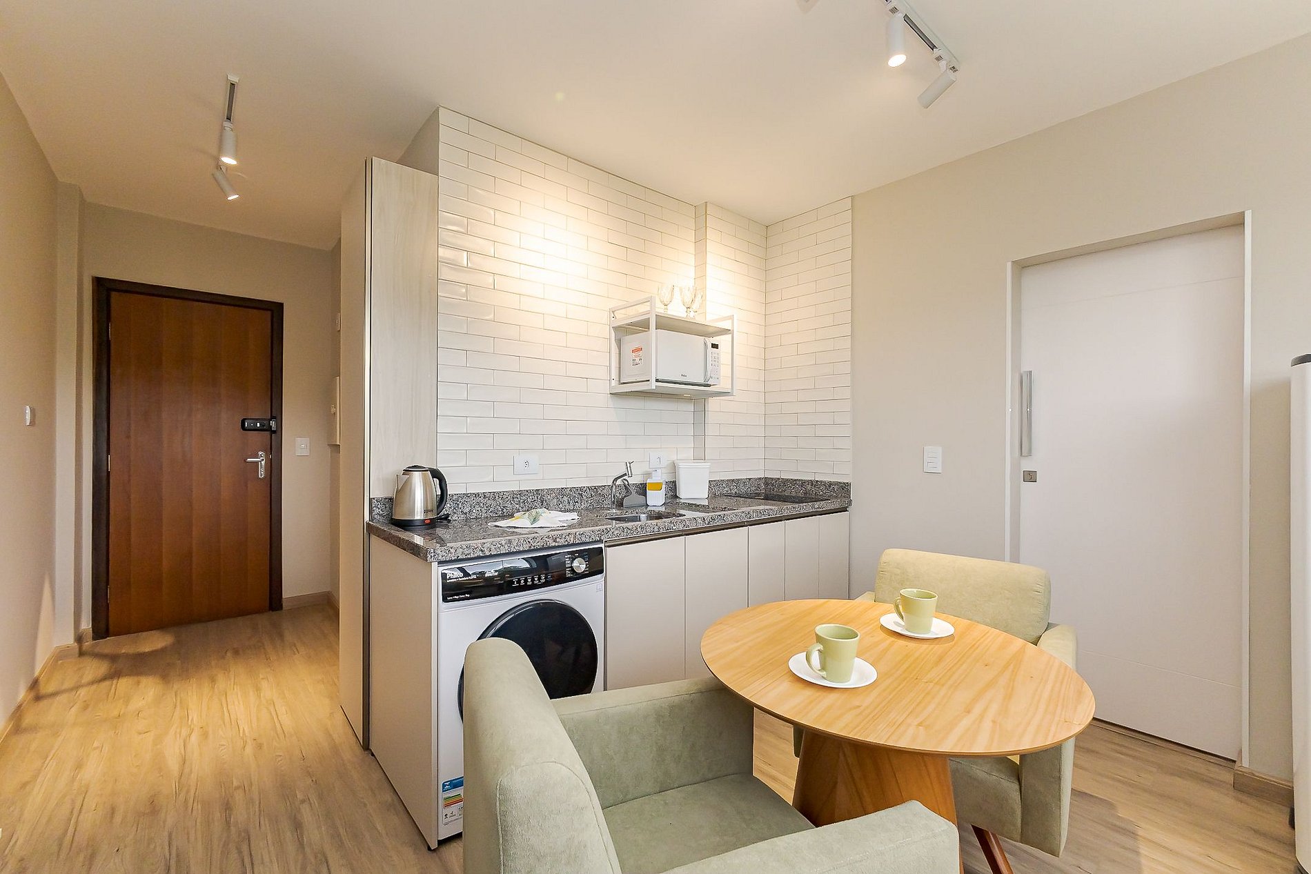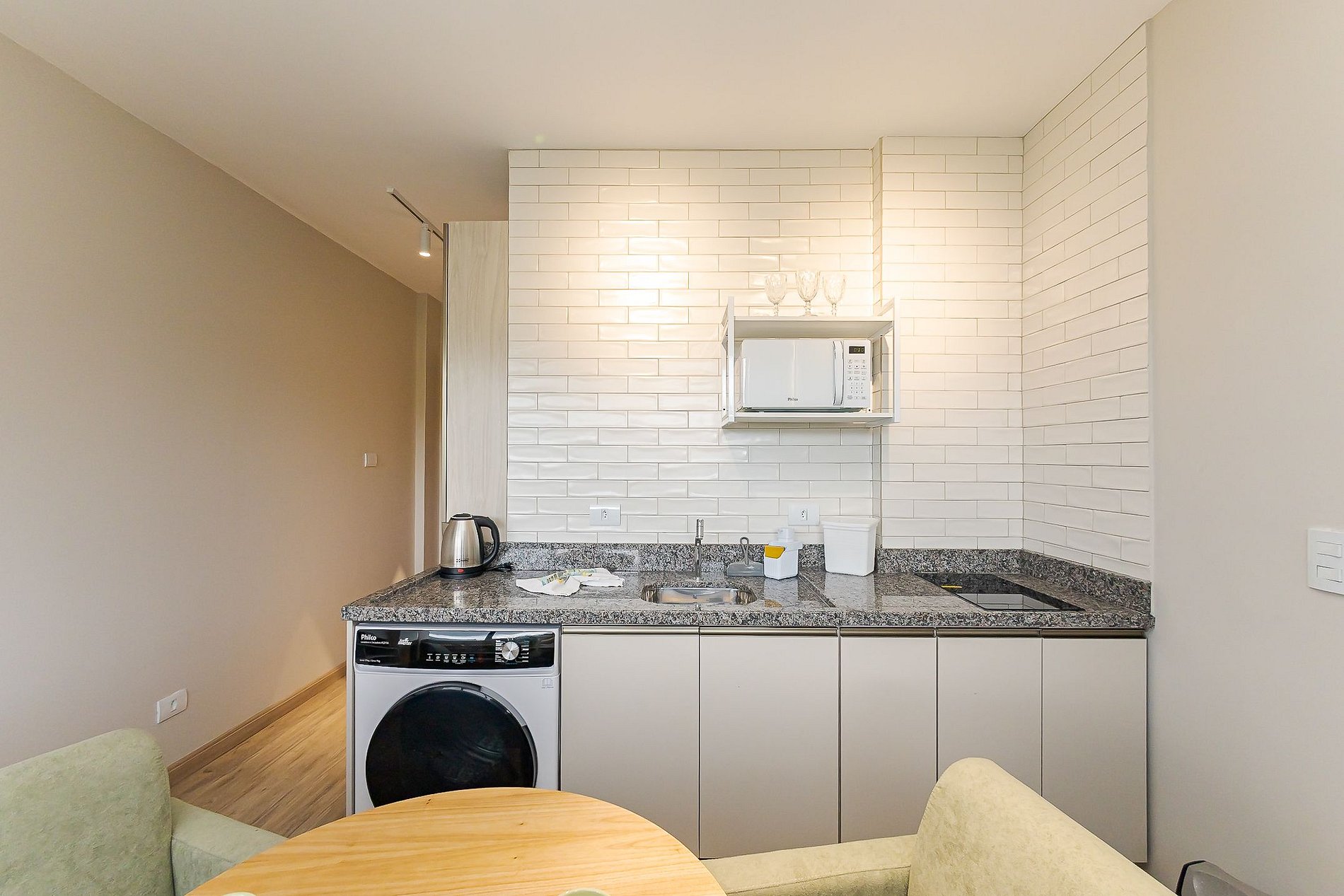 • Cozinha e área de estar integradas: cozinha completa com geladeira, cooktop, micro-ondas, lava e seca, chaleira elétrica, taças de vinho, panelas, pratos, copos, talheres e utensílios. Duas poltronas, mesa redonda e TV Smart criam um espaço funcional para refeições e momentos de descanso.
