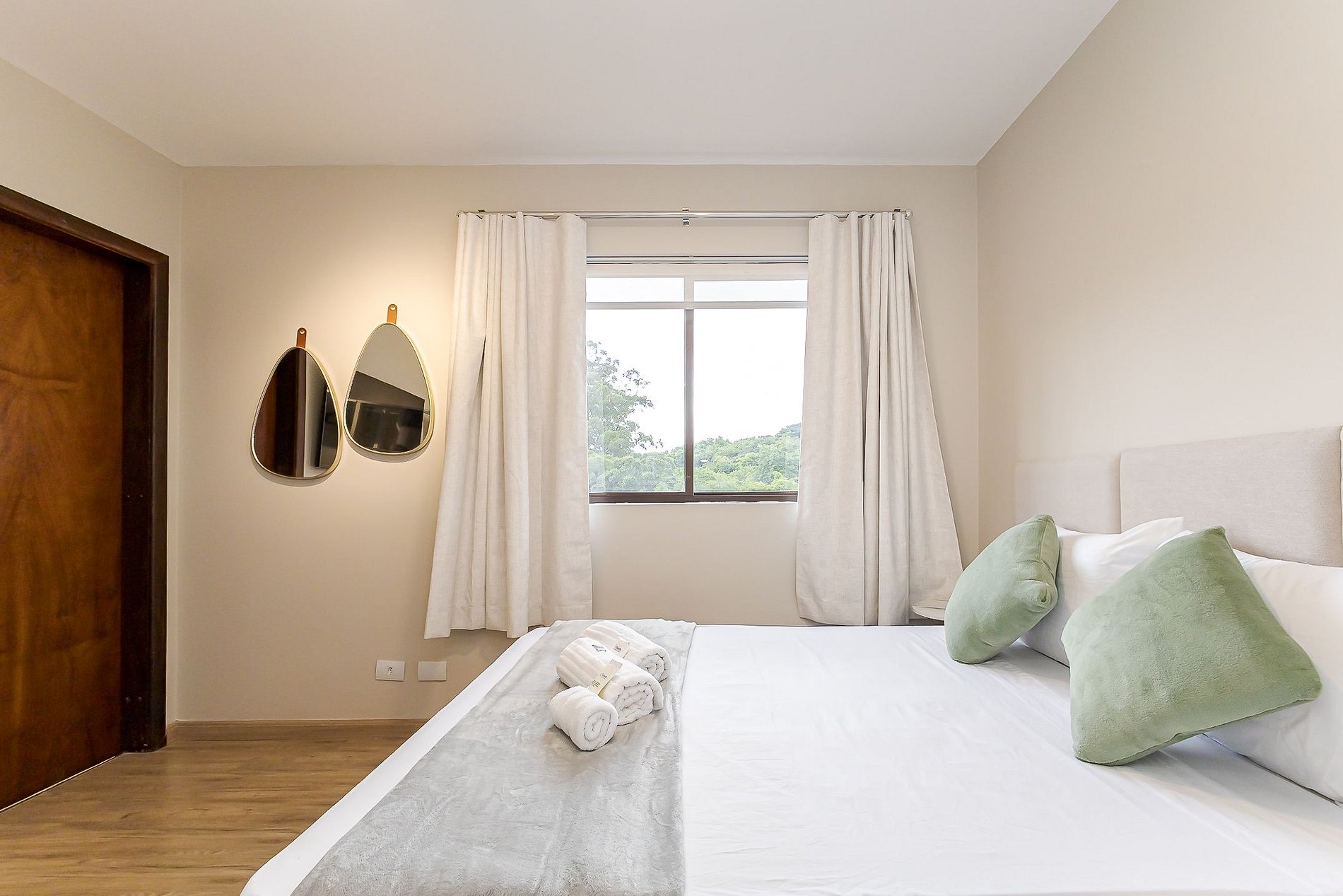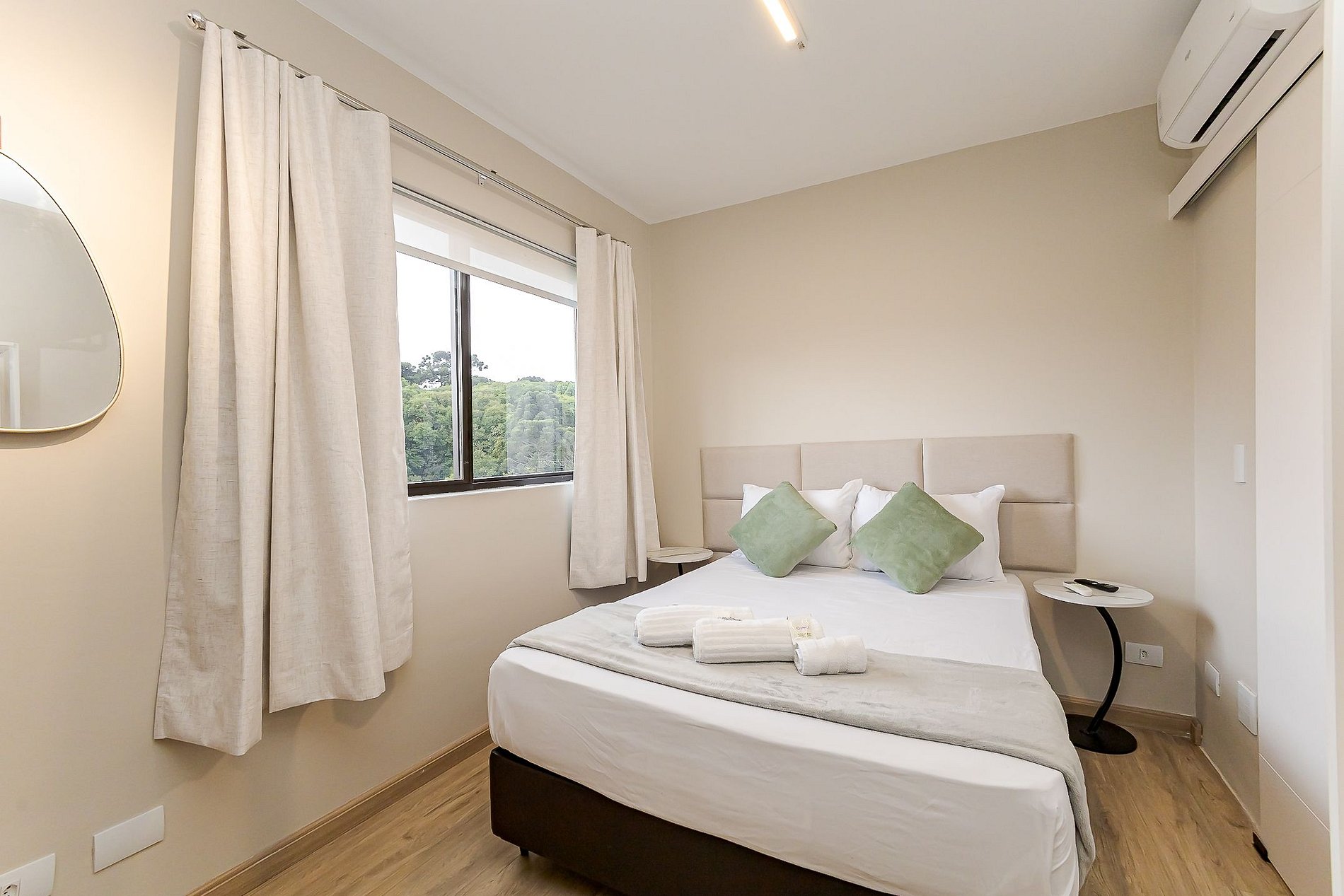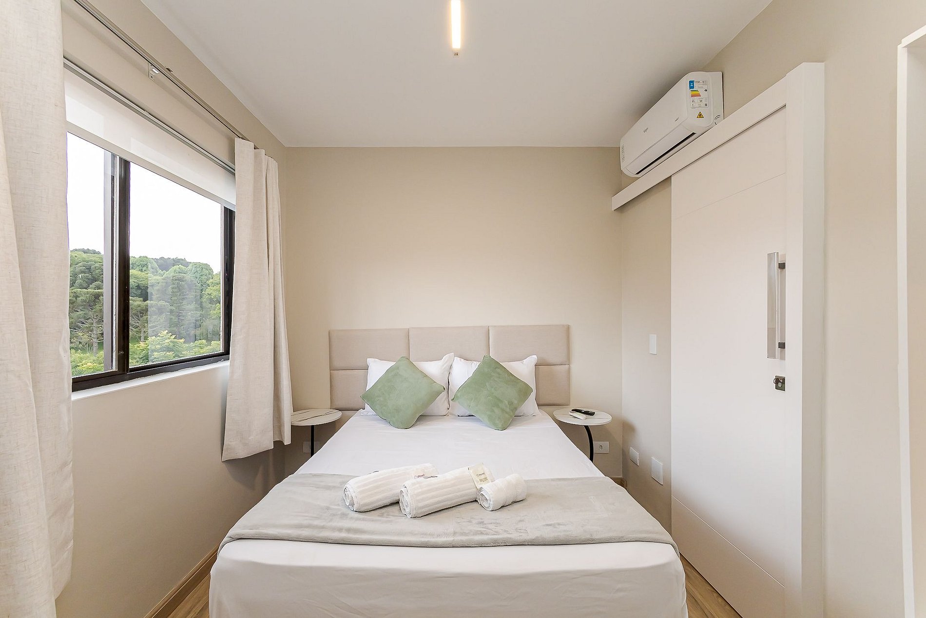 • Suíte: cama de casal com cabeceira, arara com cabides, mesa de apoio, ar-condicionado split, TV Smart, cortina privativa e vista para o verde.