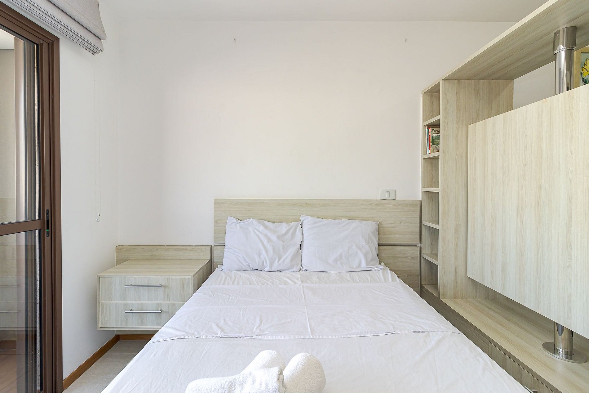 • Dormitório integrado: cama de casal, mesa de apoio com gaveta, armário com cabides e acesso direto à sacada por porta de vidro com persiana blackout.