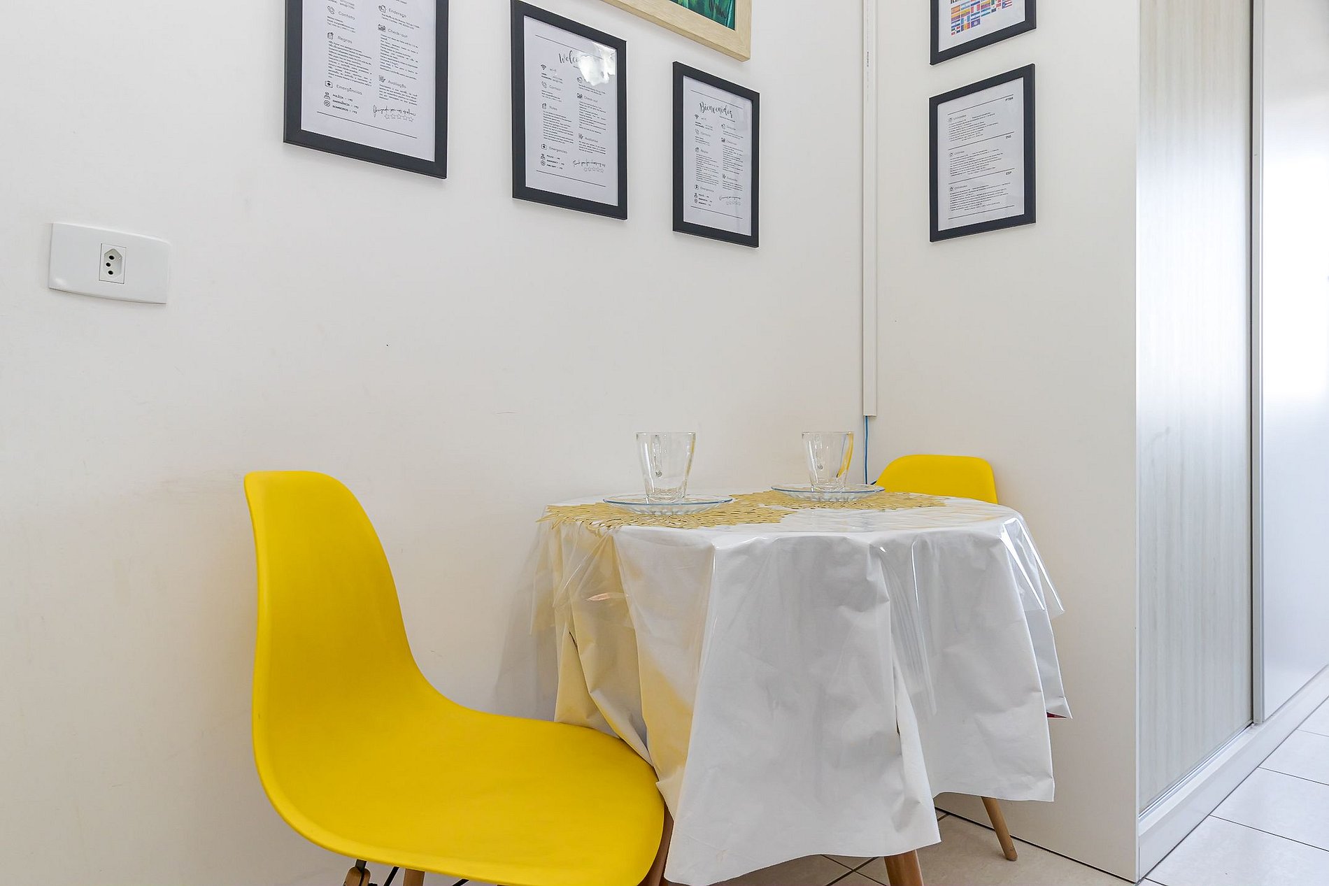 • Área de refeições: mesa com 2 cadeiras, ideal tanto para refeições quanto para home office.
