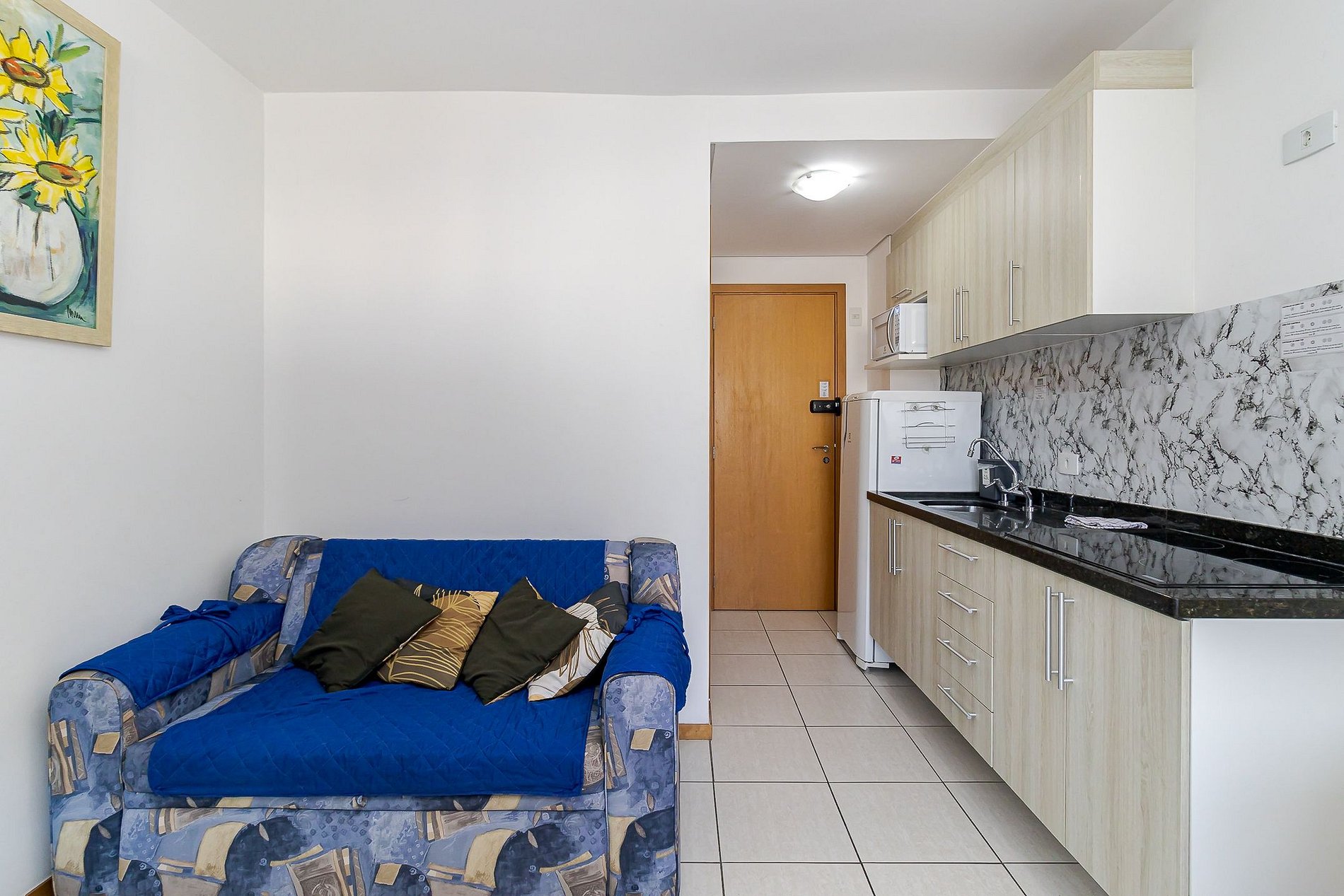 Estúdio aconchegante no Lifespace Estação, no Centro de Curitiba, com varanda e ambiente que integra cozinha, área de estar e dormitório.