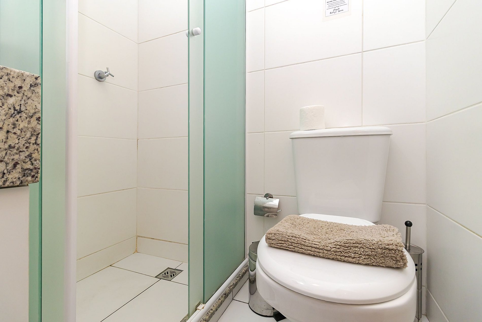 • Banheiro: box de vidro, chuveiro com água quente, espelho e secador de cabelo.