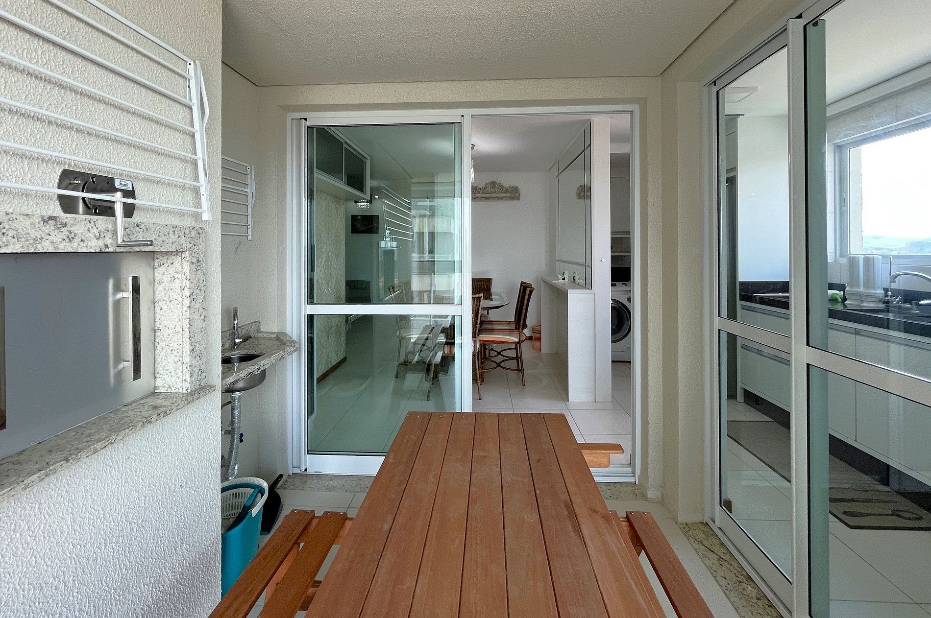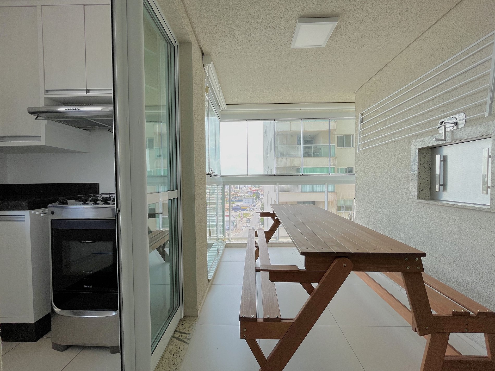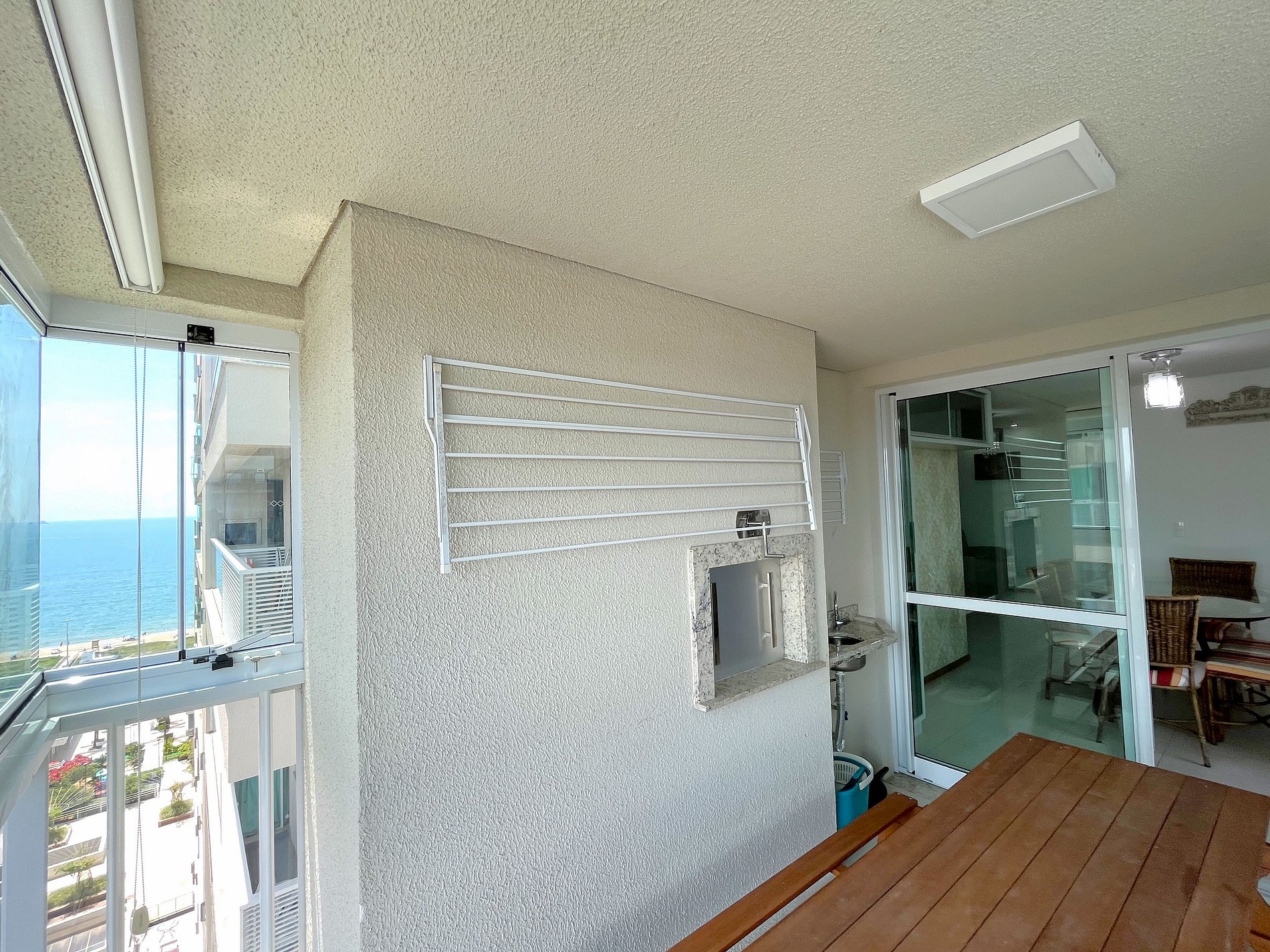 > Ampla Sacada com Churrasqueira a Carvão: Desfrute de refeições com vista para o mar.