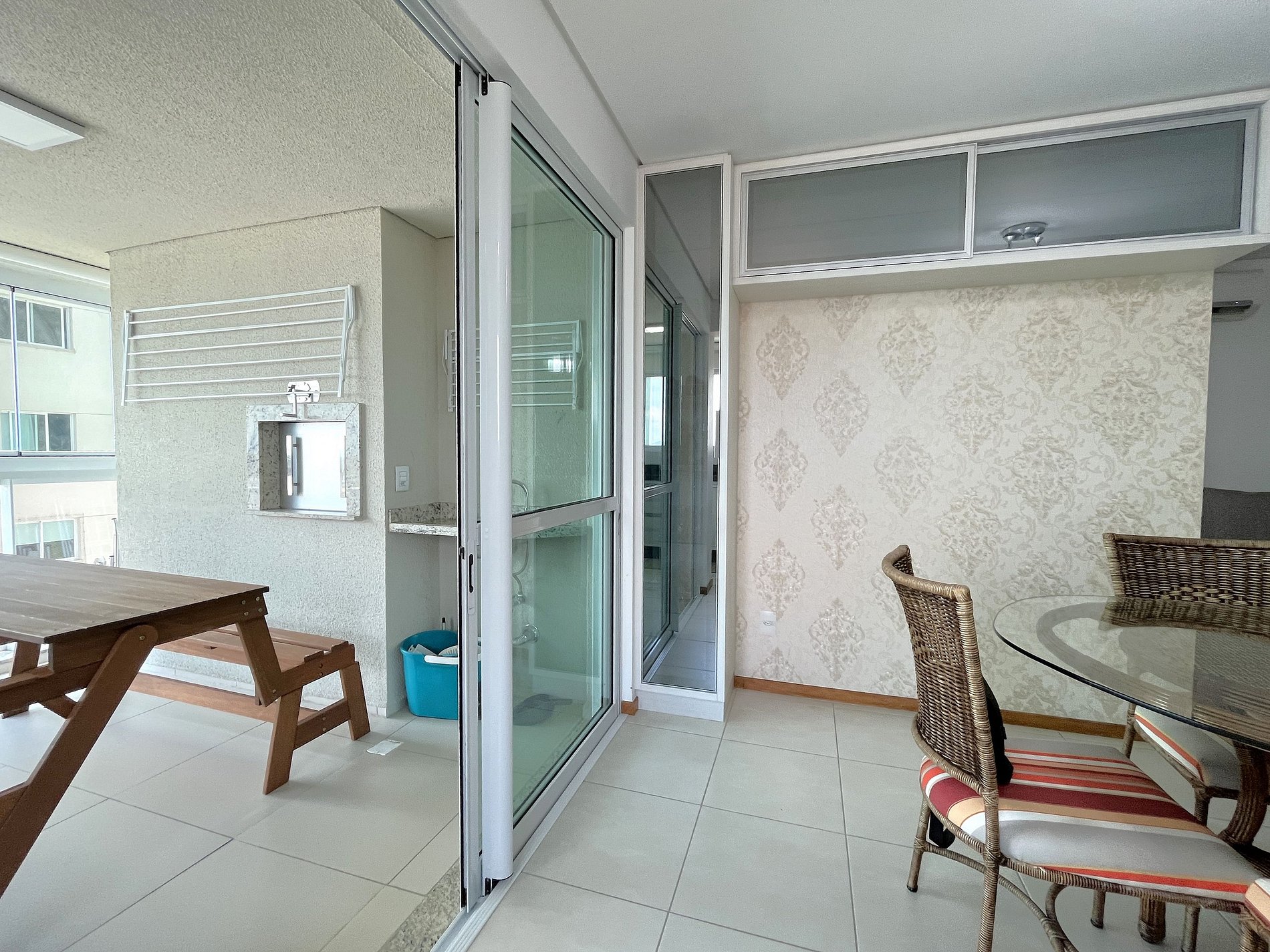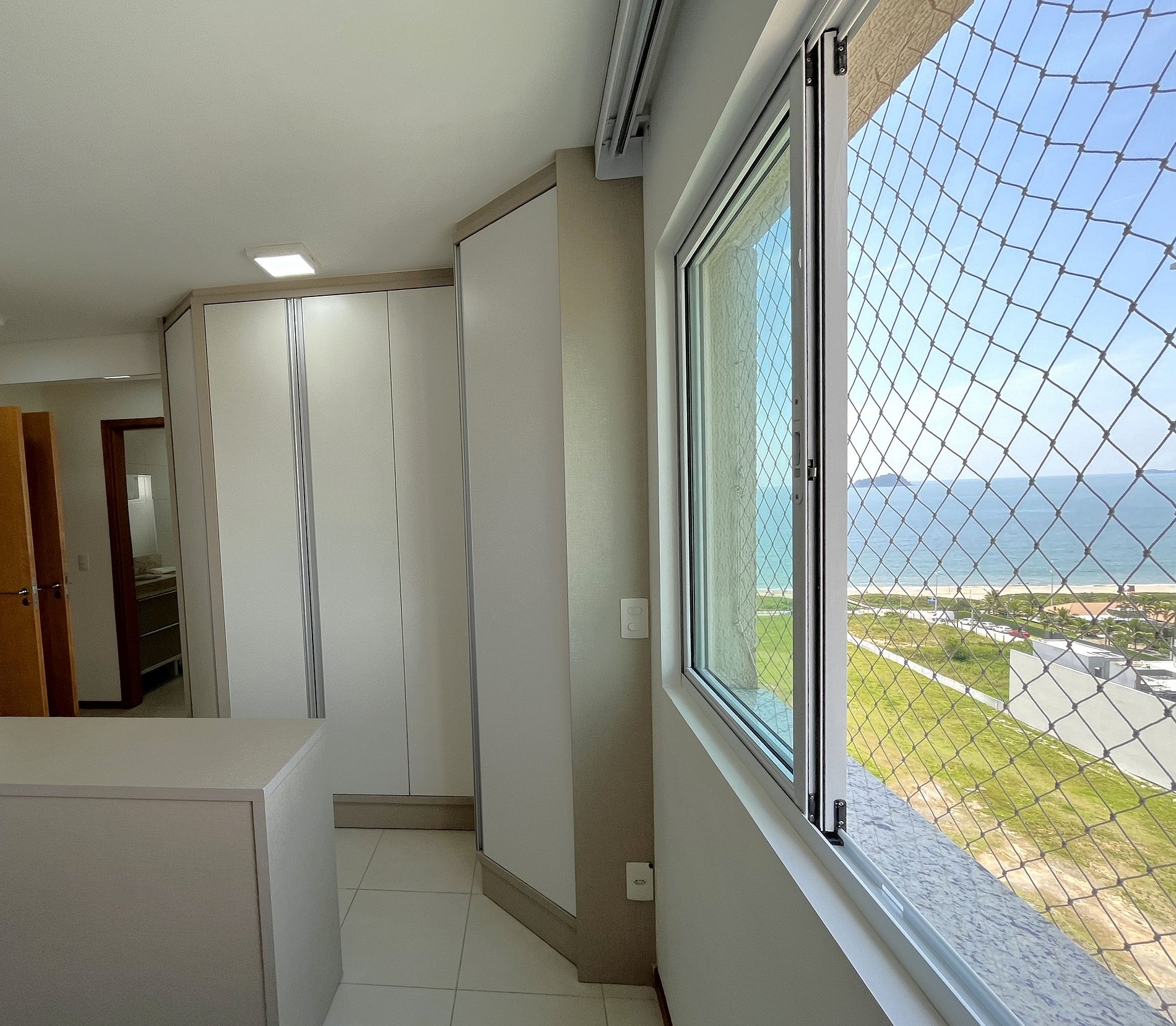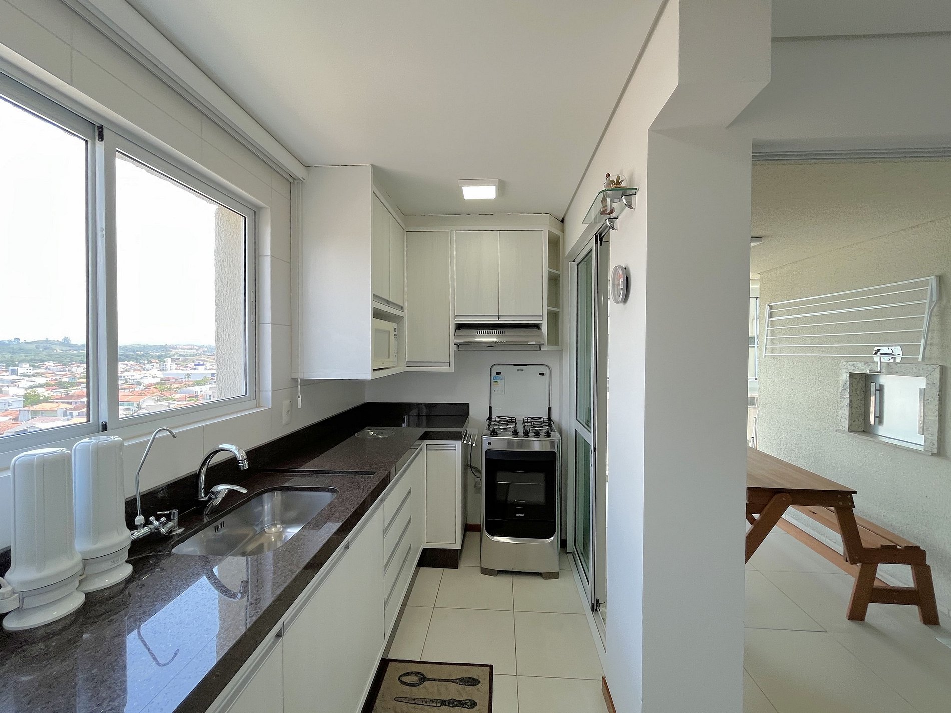 > Ampla Sacada com Churrasqueira a Carvão: Desfrute de refeições com vista para o mar.