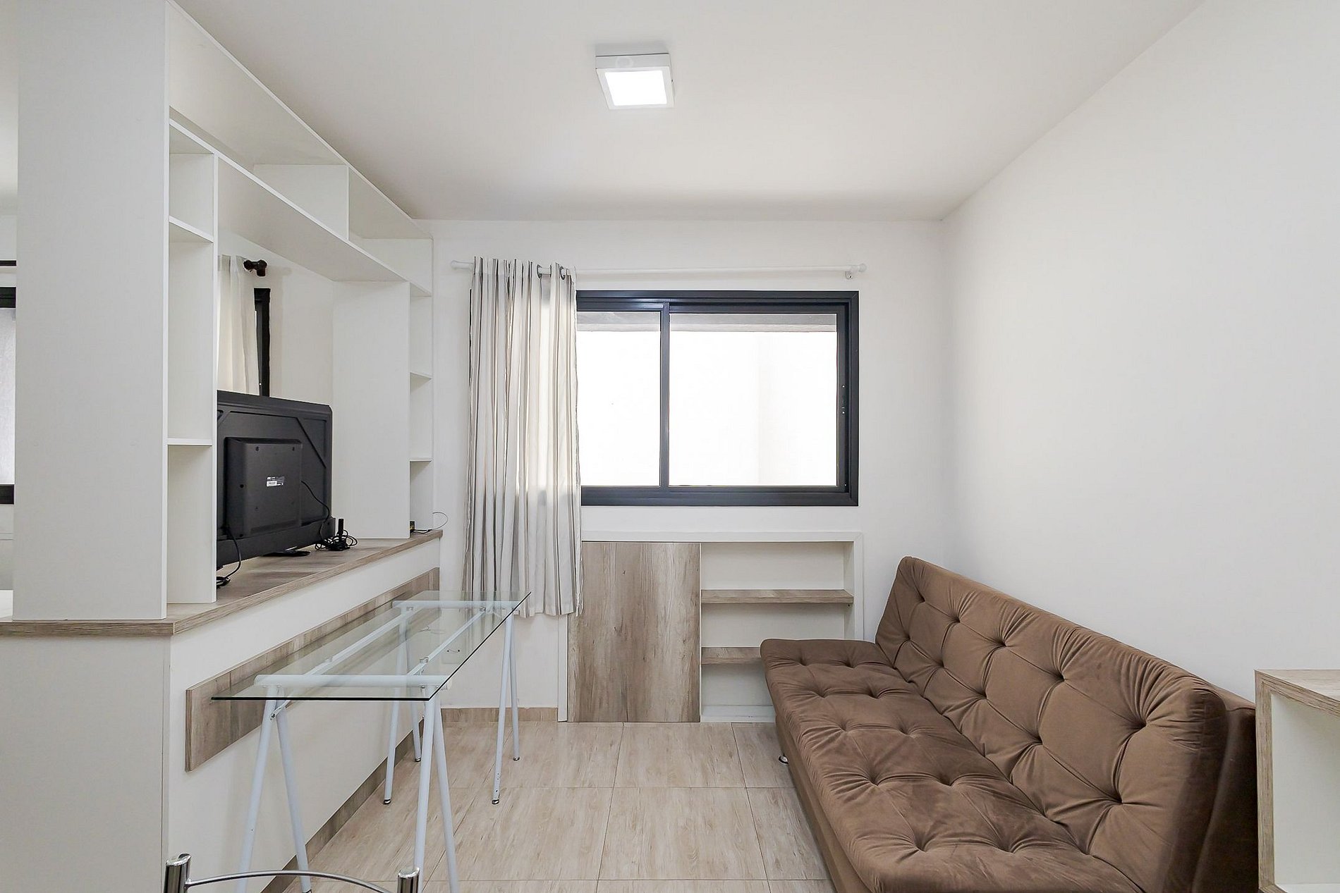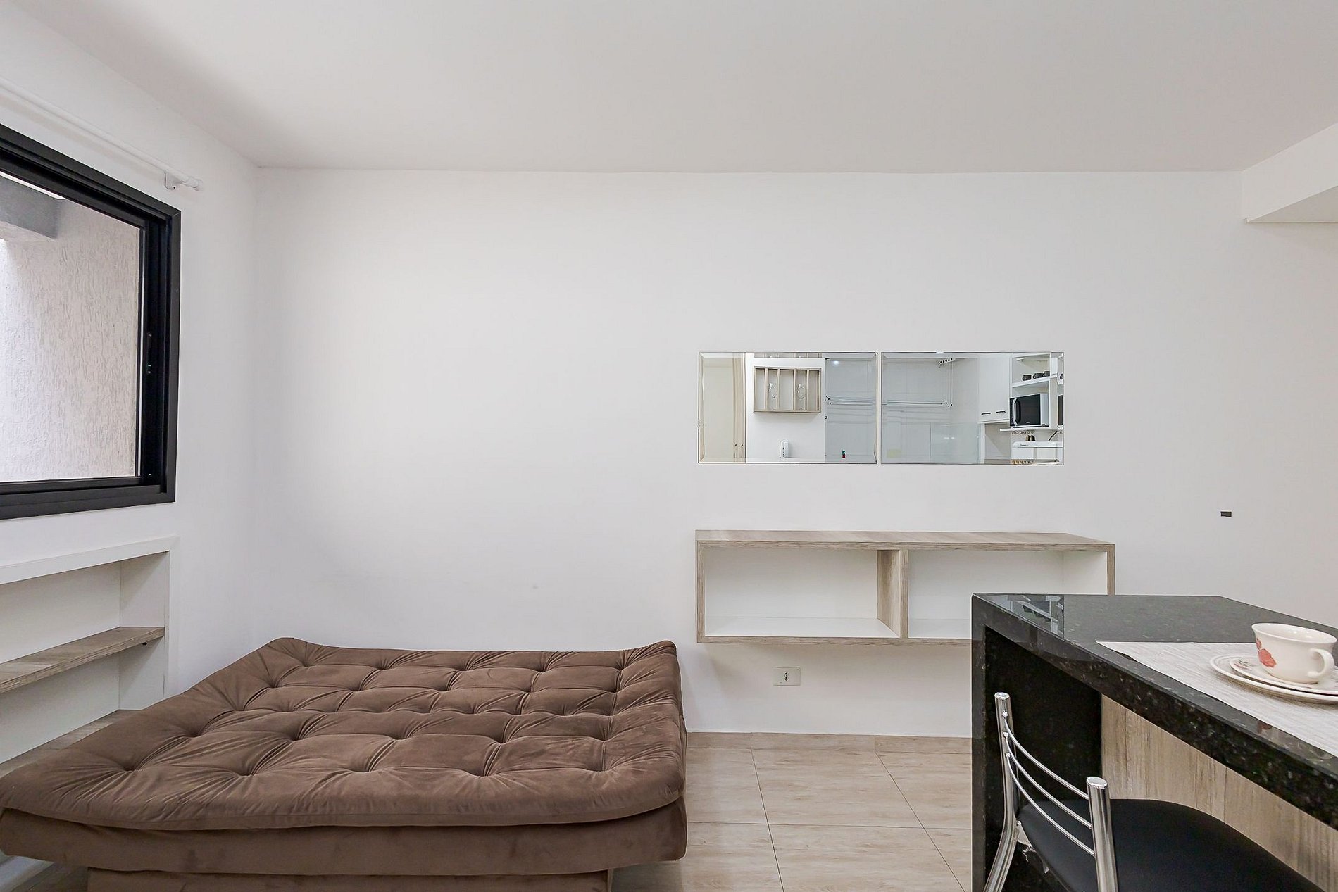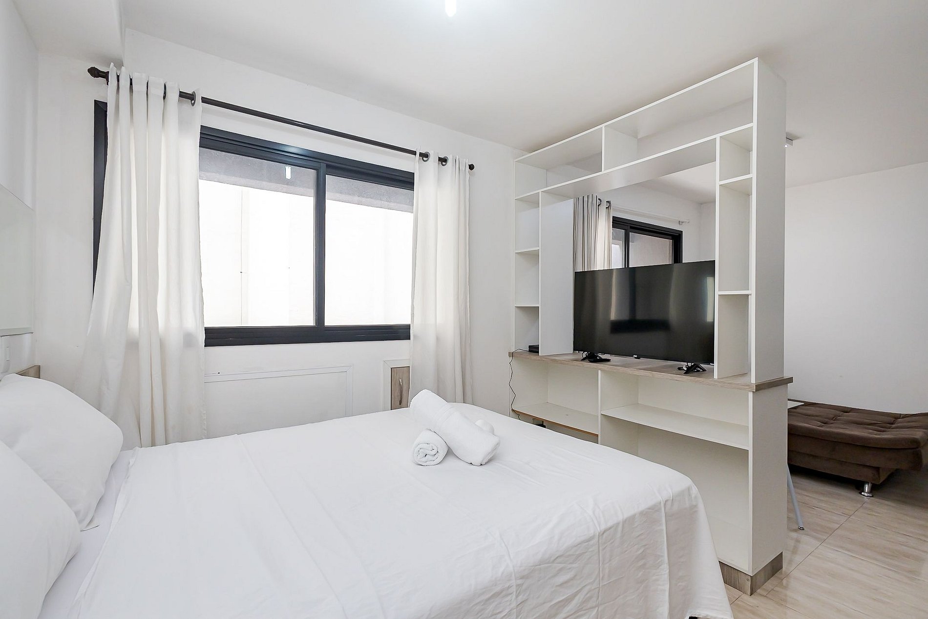 • Área social: sofá-cama para um hóspede adicional, separado da cama por móvel divisório, criando uma divisão funcional do ambiente.