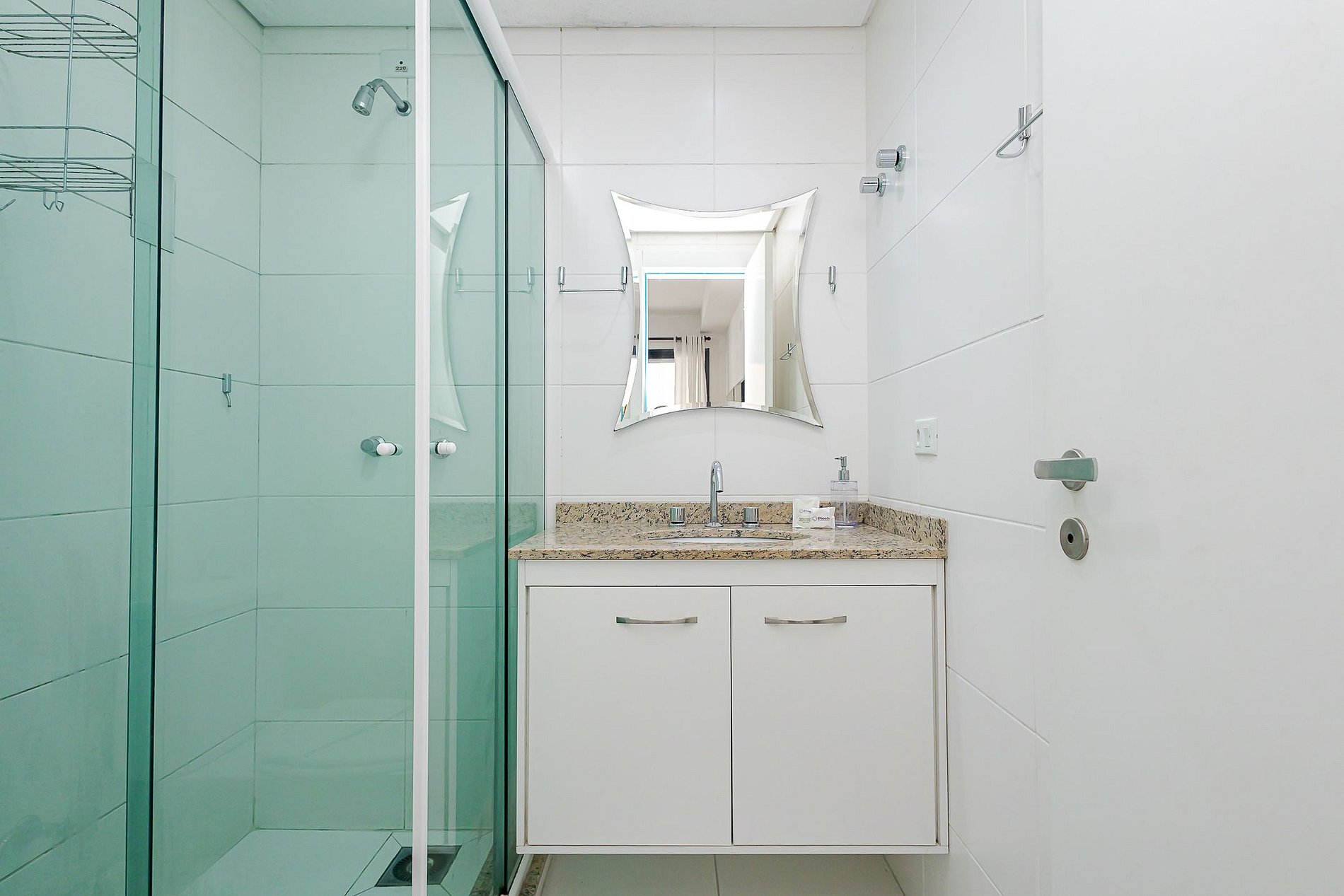 A entrada no apartamento é feita por fechadura eletrônica, garantindo praticidade e autonomia durante toda a estadia.