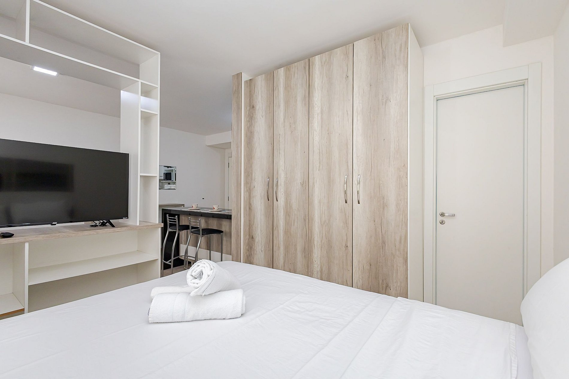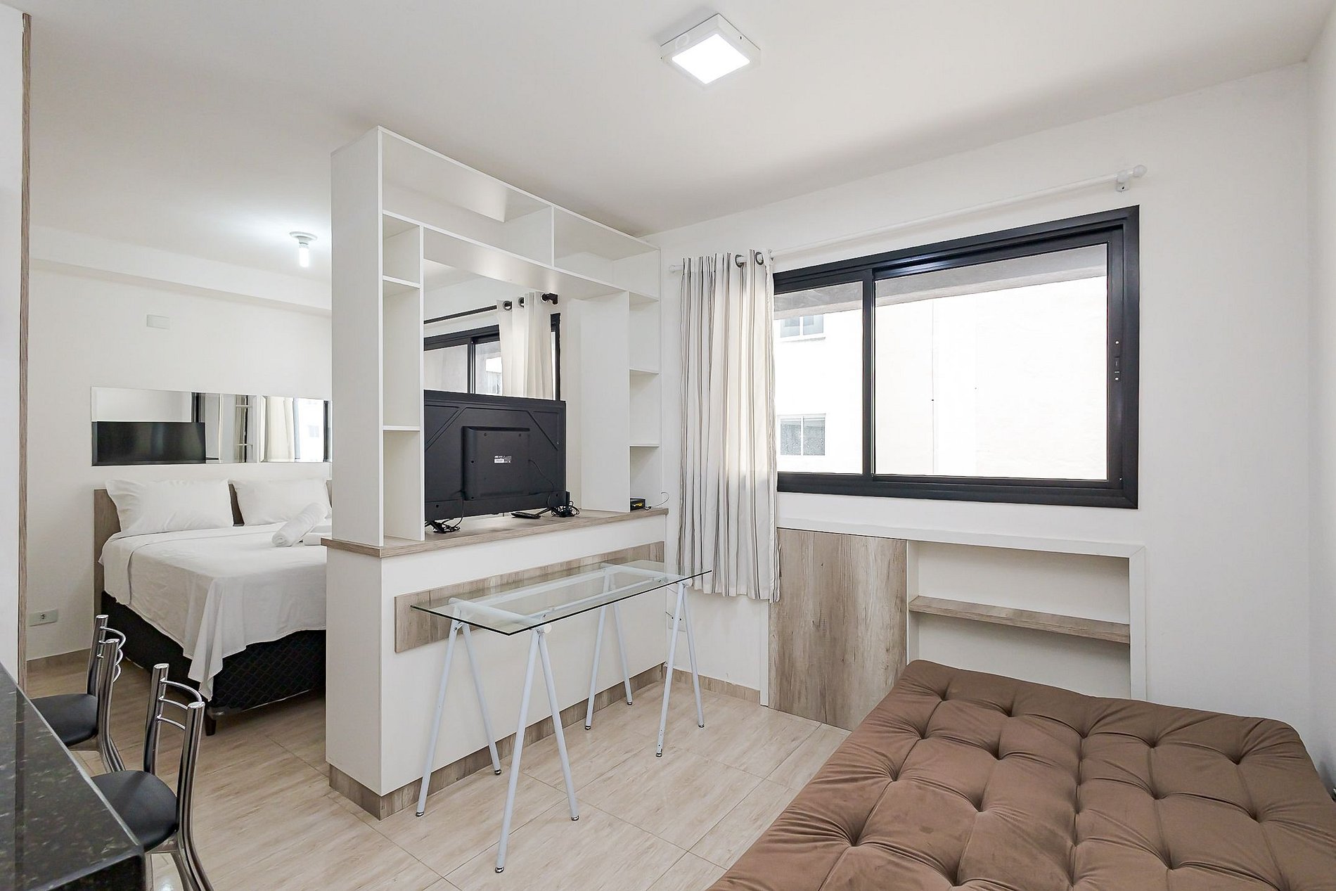 • Área social: sofá-cama para um hóspede adicional, separado da cama por móvel divisório, criando uma divisão funcional do ambiente.