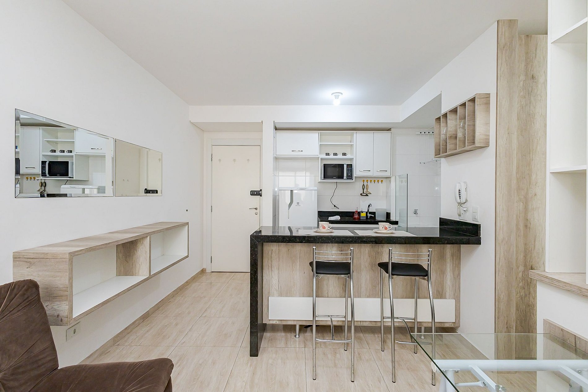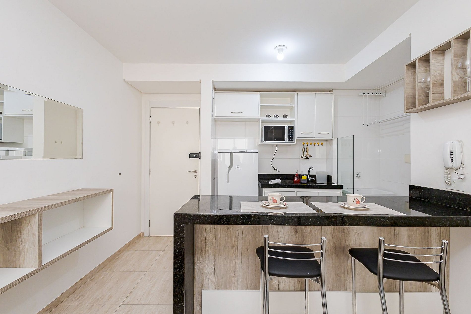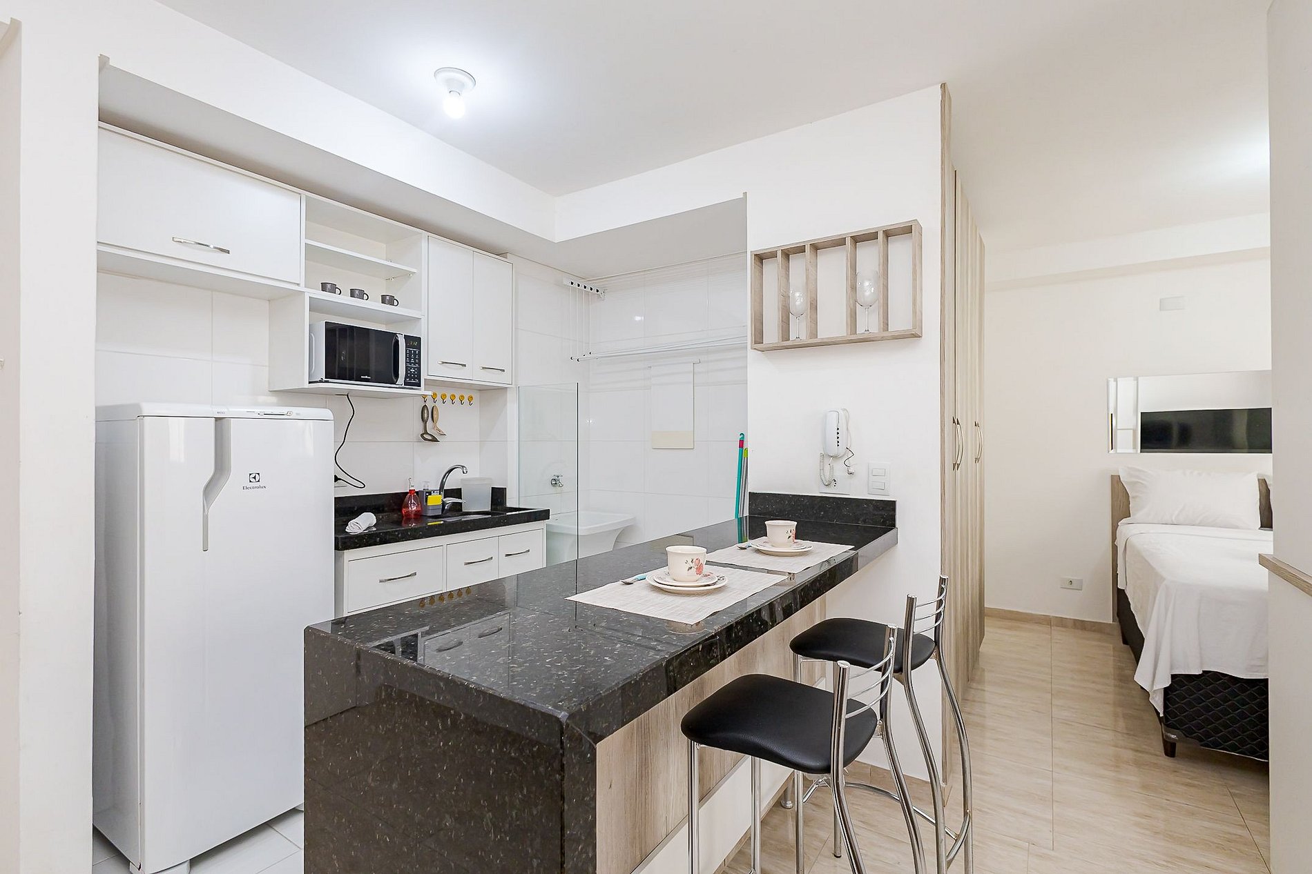 • Cozinha integrada: equipada com geladeira, micro-ondas, cooktop de 2 bocas, chaleira elétrica, cafeteira, sanduicheira, panelas, pratos, copos, talheres e utensílios. Bancada com duas banquetas para refeições.