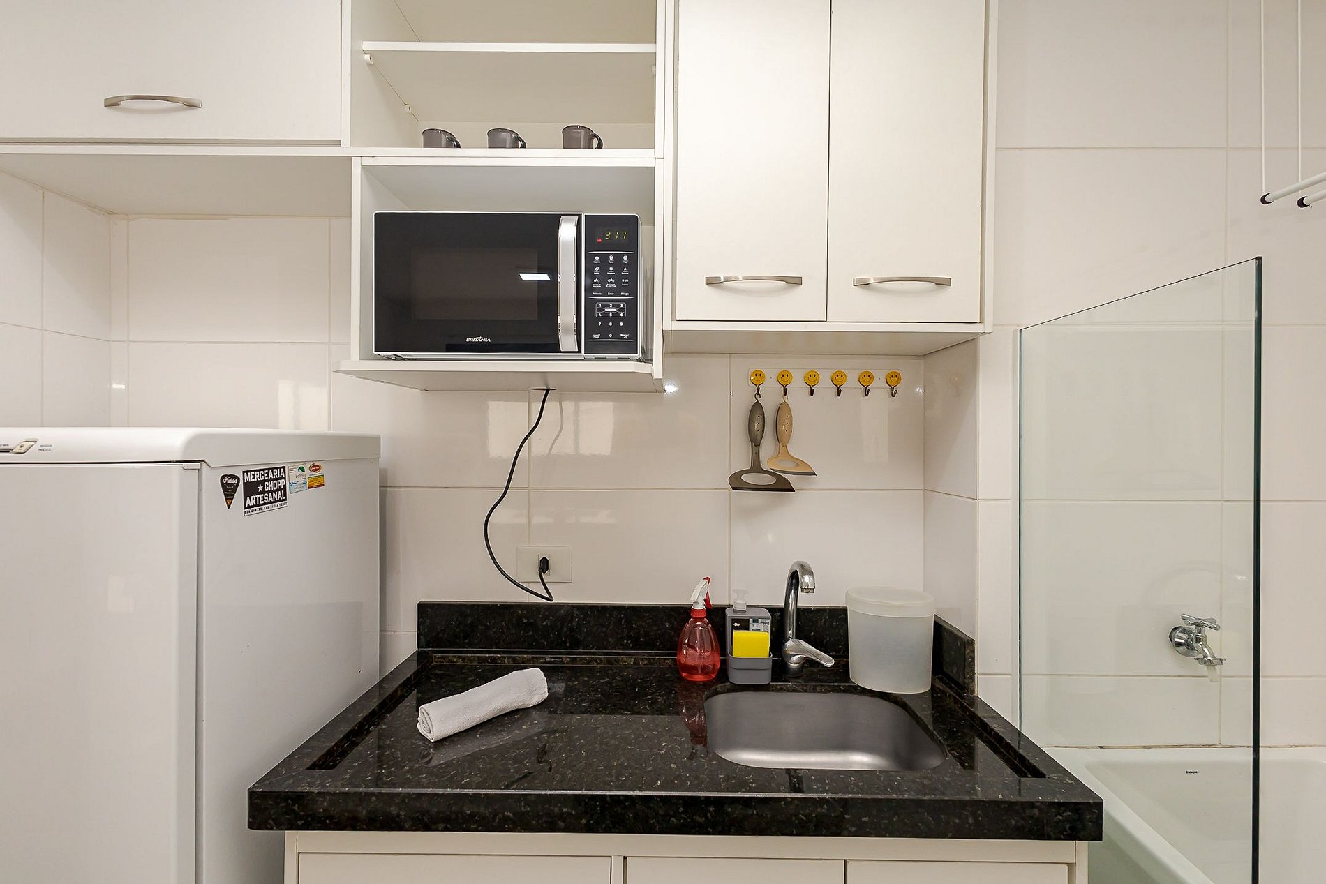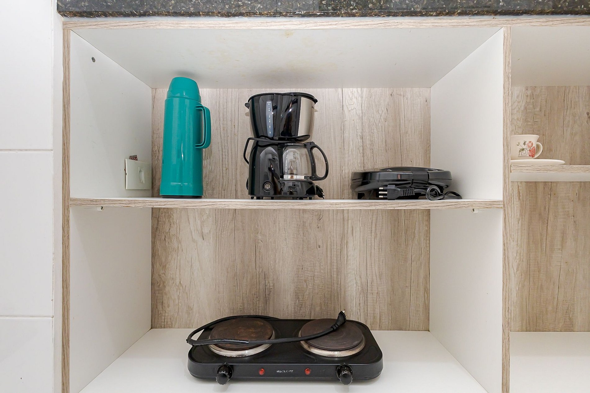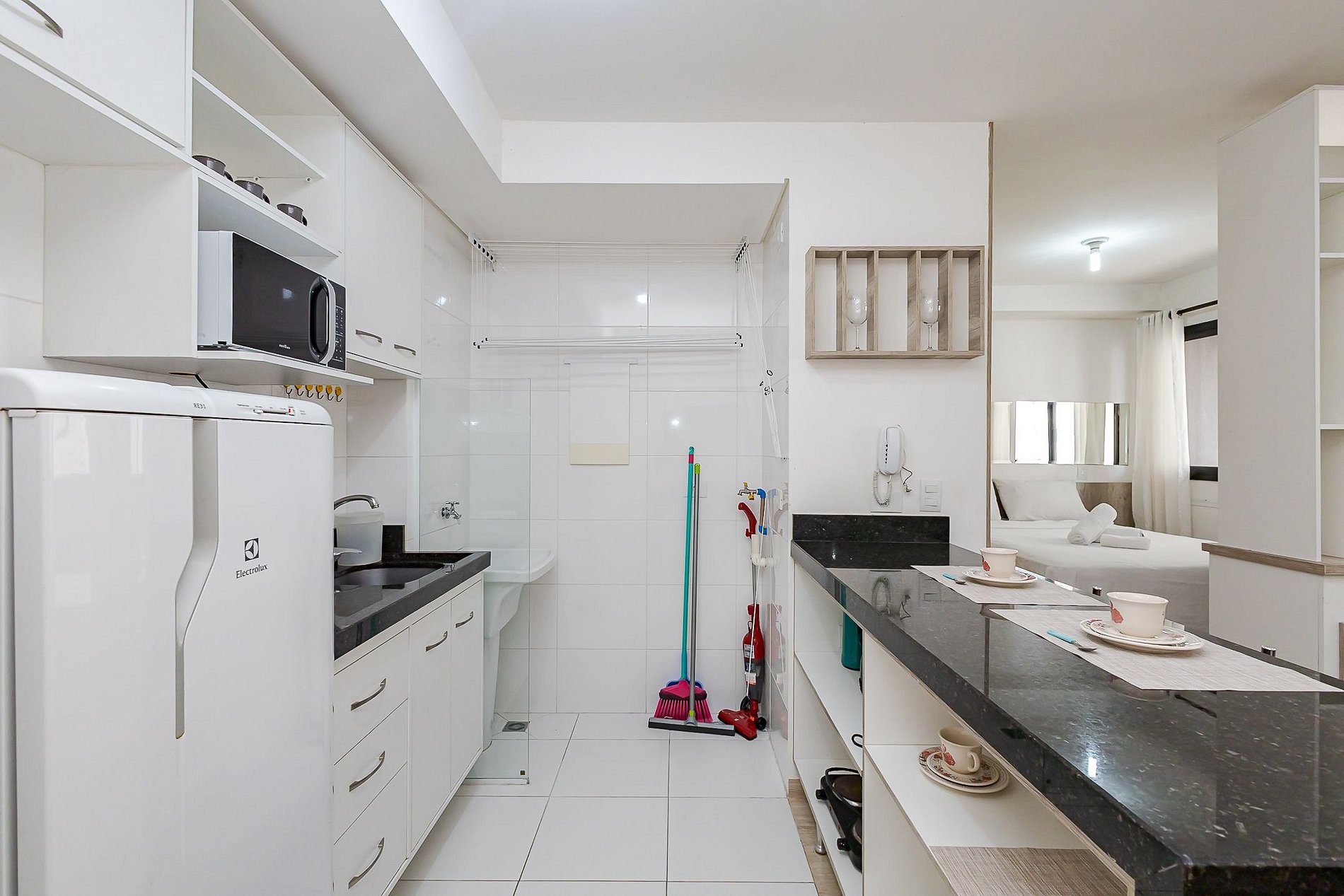 • Cozinha integrada: equipada com geladeira, micro-ondas, cooktop de 2 bocas, chaleira elétrica, cafeteira, sanduicheira, panelas, pratos, copos, talheres e utensílios. Bancada com duas banquetas para refeições.