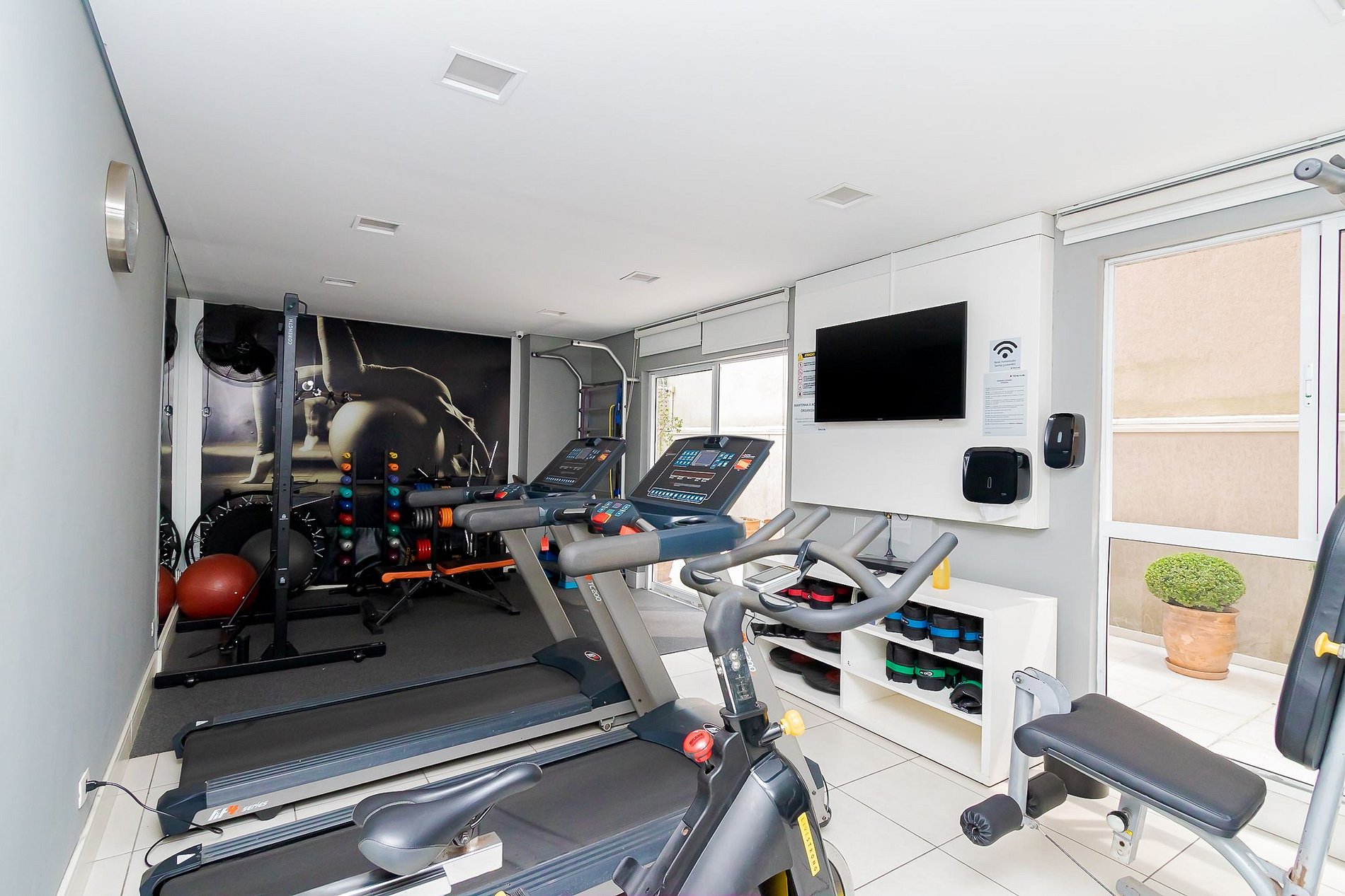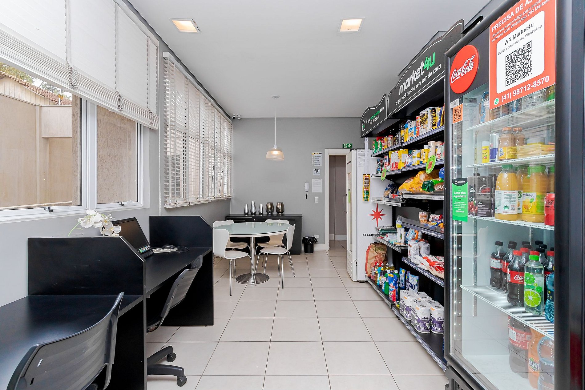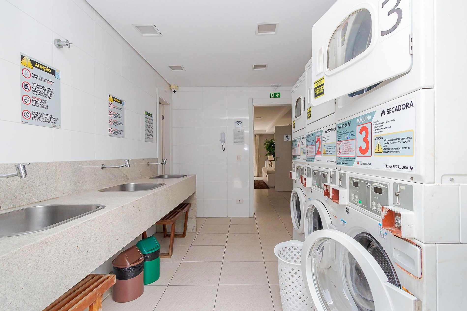 As áreas comuns do condomínio: piscina, sala fitness, sala de jogos, mercadinho autônomo e lavanderia coletiva com máquinas de lavar e secadoras.