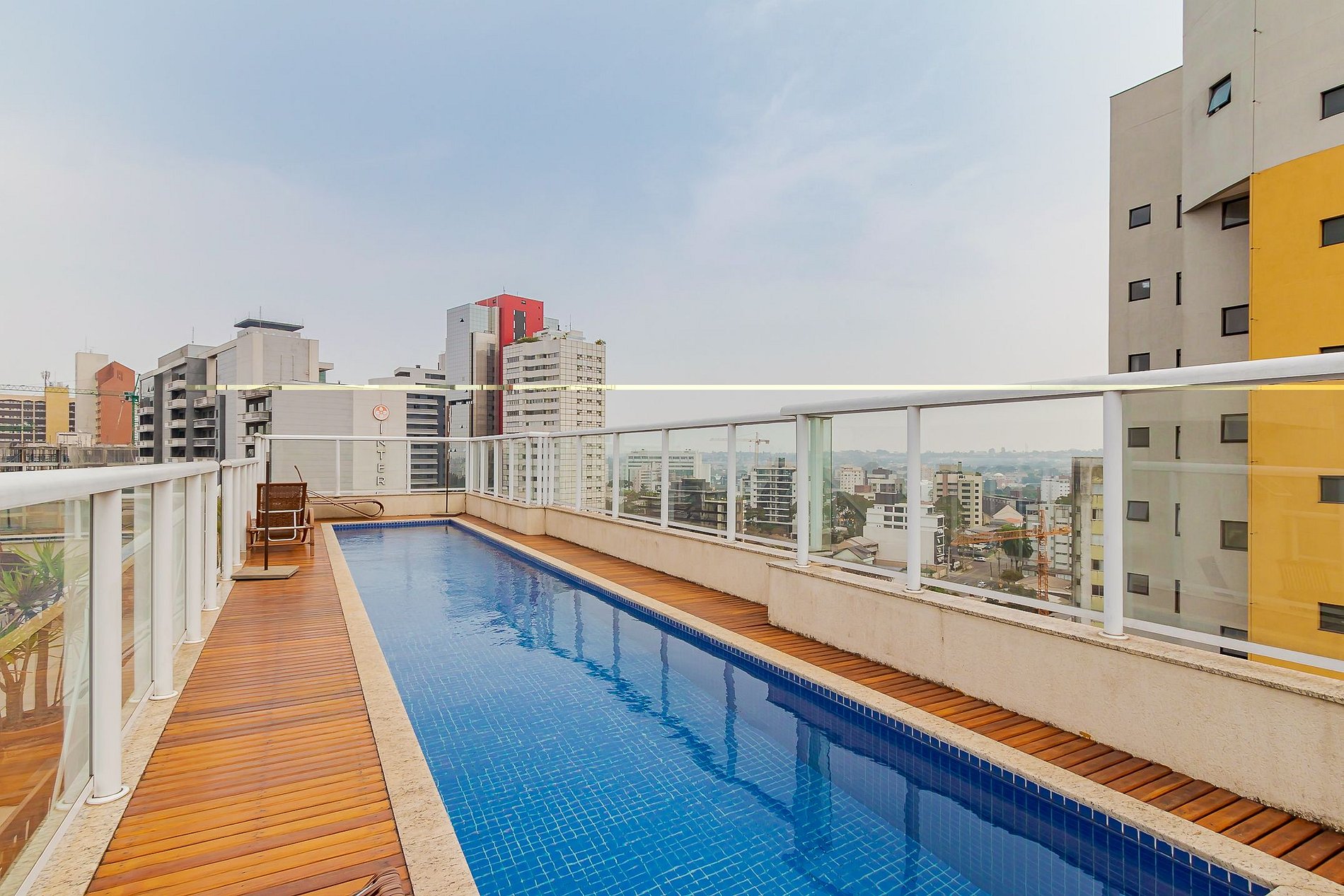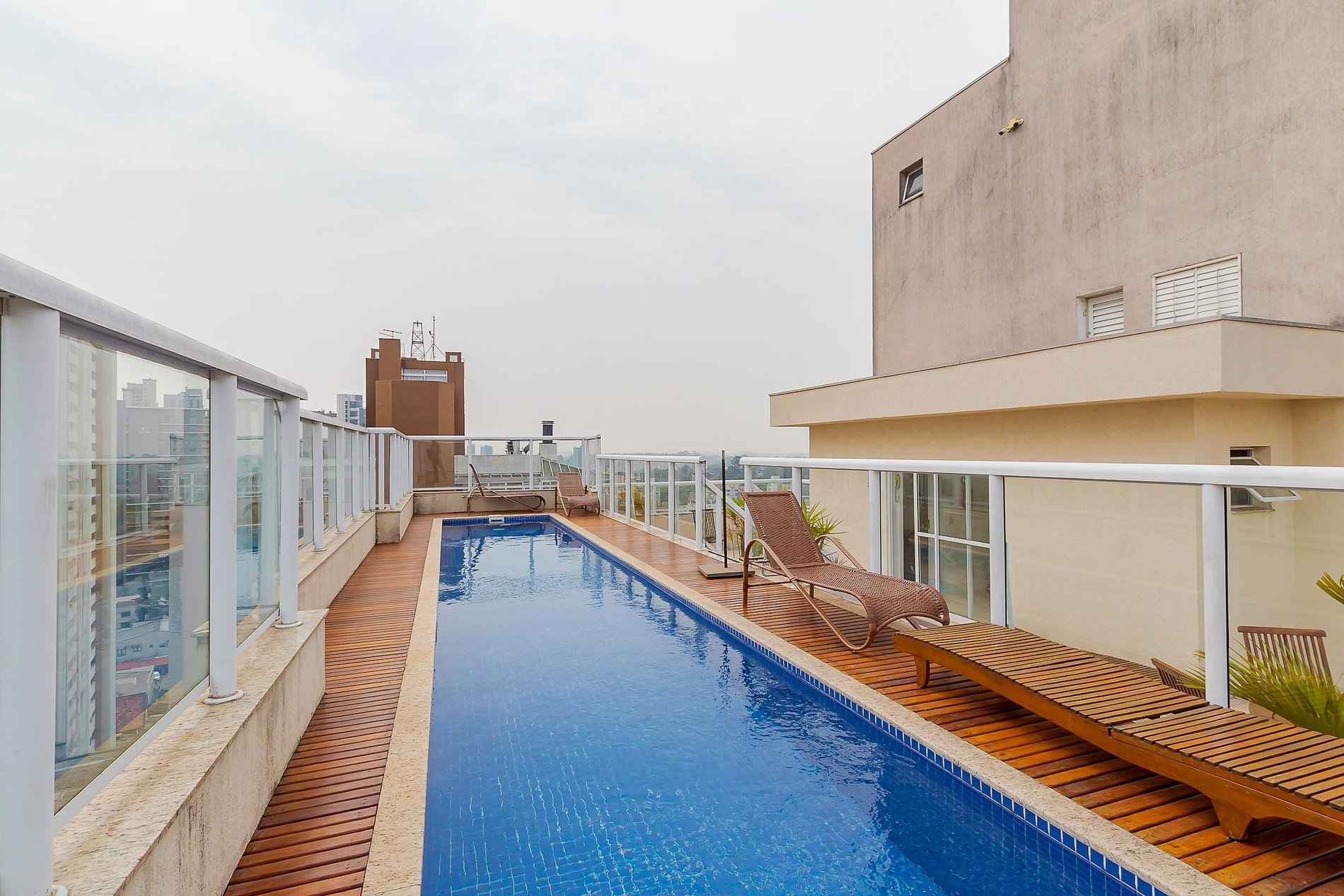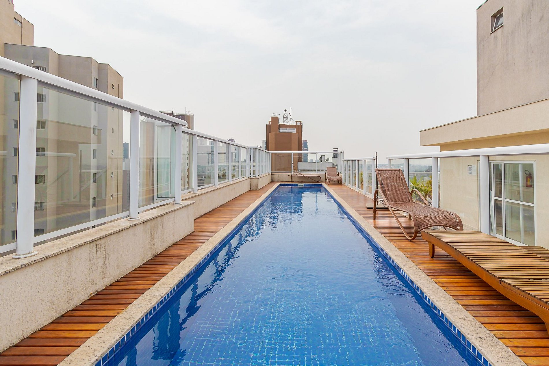 O edifício conta com piscina, sala fitness, sala de jogos e área de serviço coletiva equipada com máquinas de lavar e secadoras, oferecendo comodidade tanto para estadias curtas quanto mais longas.