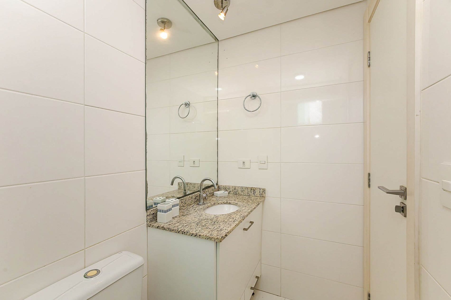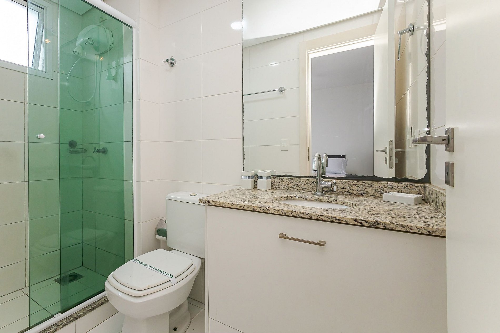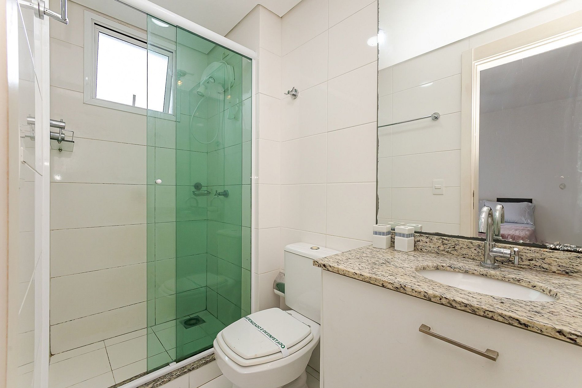 • Banheiro: box de vidro, chuveiro com água quente, janela basculhante e espelho.
