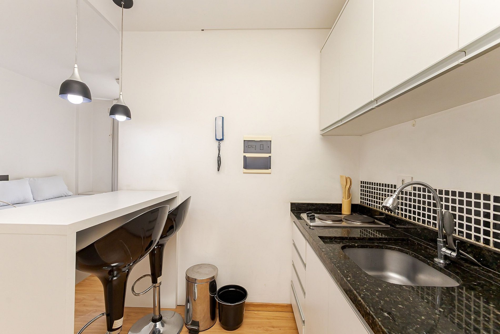 • Cozinha: bancada com 2 banquetas para refeições ou trabalho, geladeira, cooktop, micro-ondas, chaleira elétrica, além de panelas, pratos, copos, talheres e utensílios essenciais.