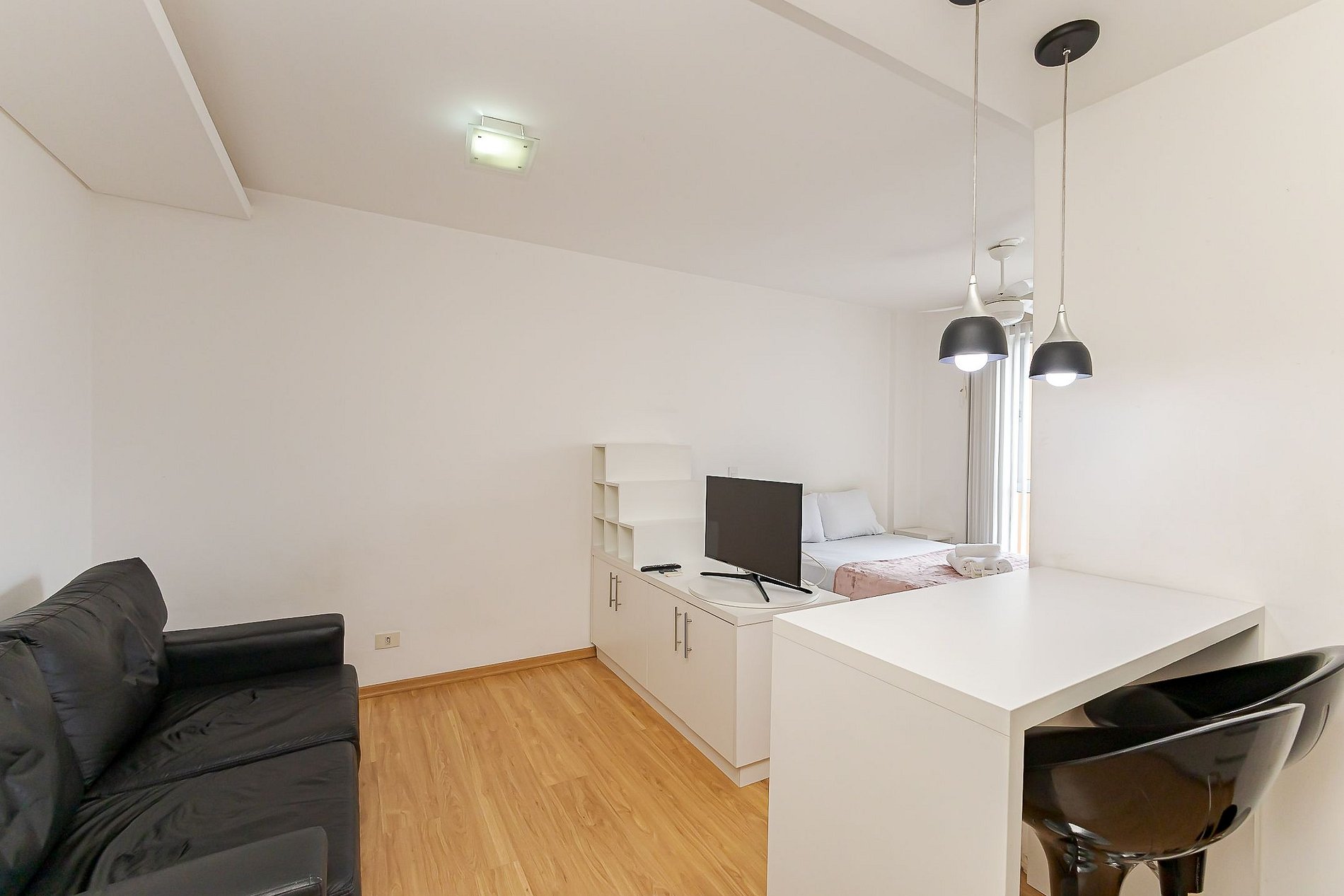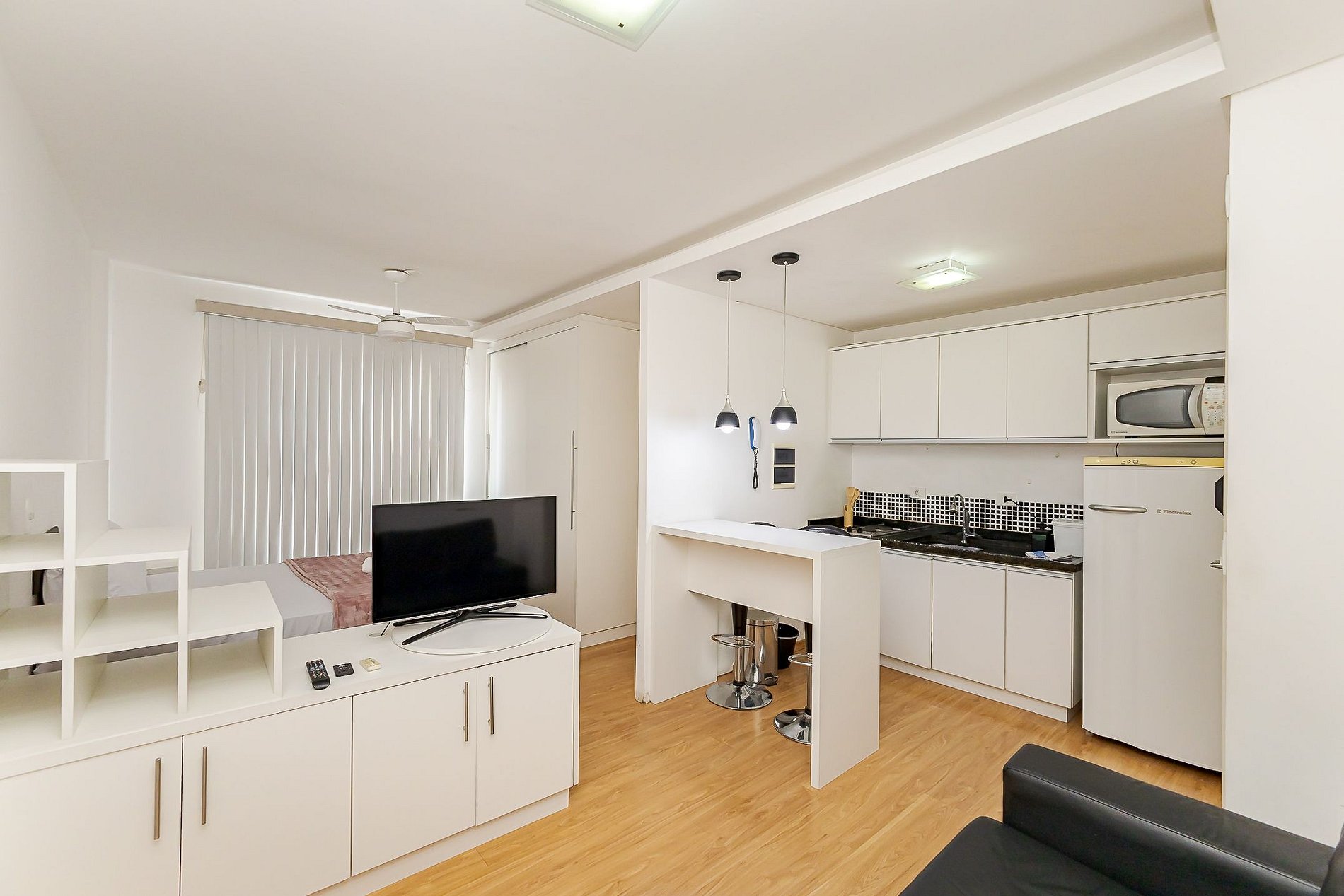 O estúdio foi pensado para oferecer funcionalidade e conforto em um único ambiente bem distribuído: